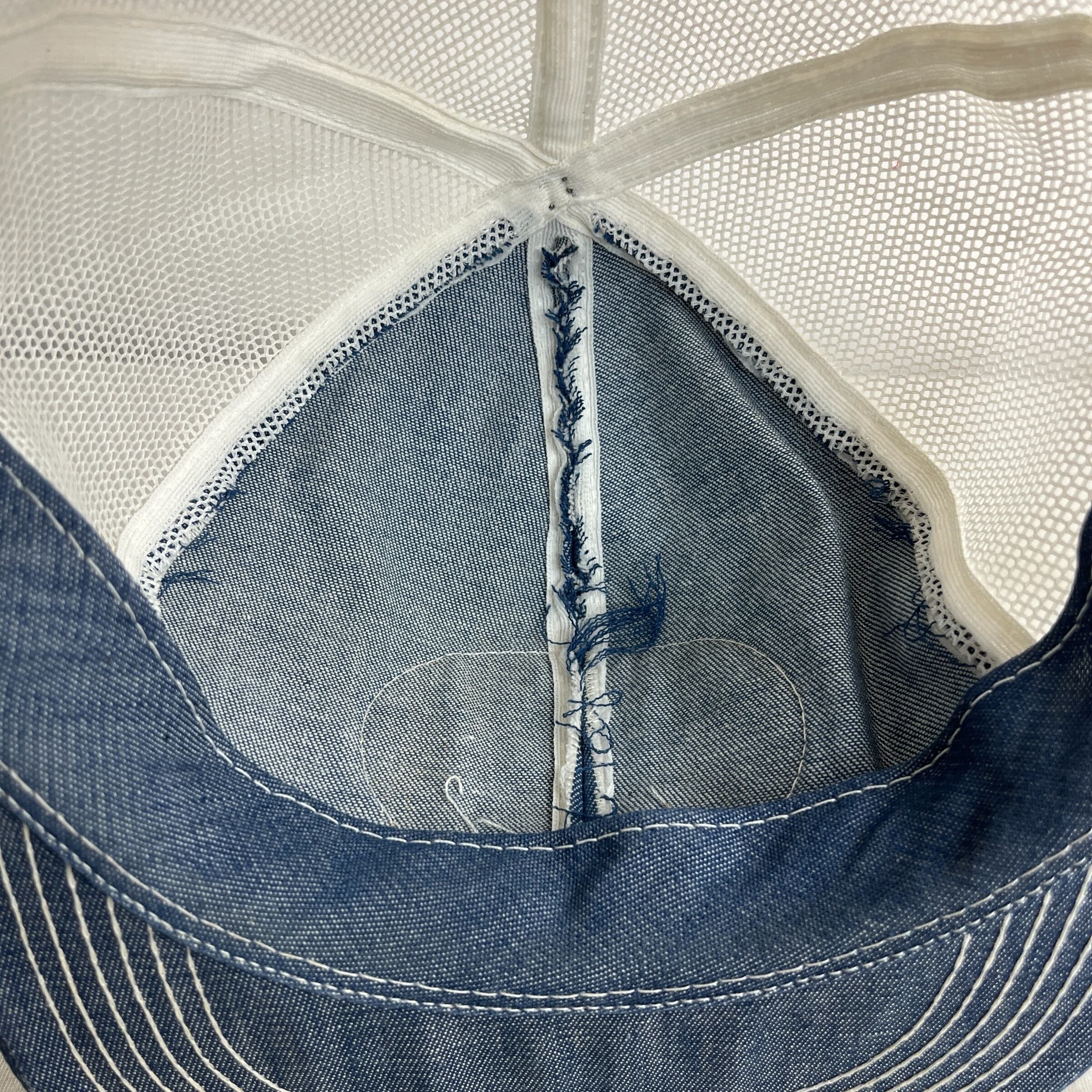 ヴィンテージ感溢れる「Purswell Pump Co.」キャップ。ブルーデニム調の生地に、インパクトのある工具デザインの刺繍ワッペンが印象的。Purswell Pump Co.は米国の老舗ポンプ製造会社で、産業用ポンプの供給で信頼を築いてきた企業。通気性の良いメッシュバック仕様で、レトロなワークウェアスタイルが魅力の一品です。