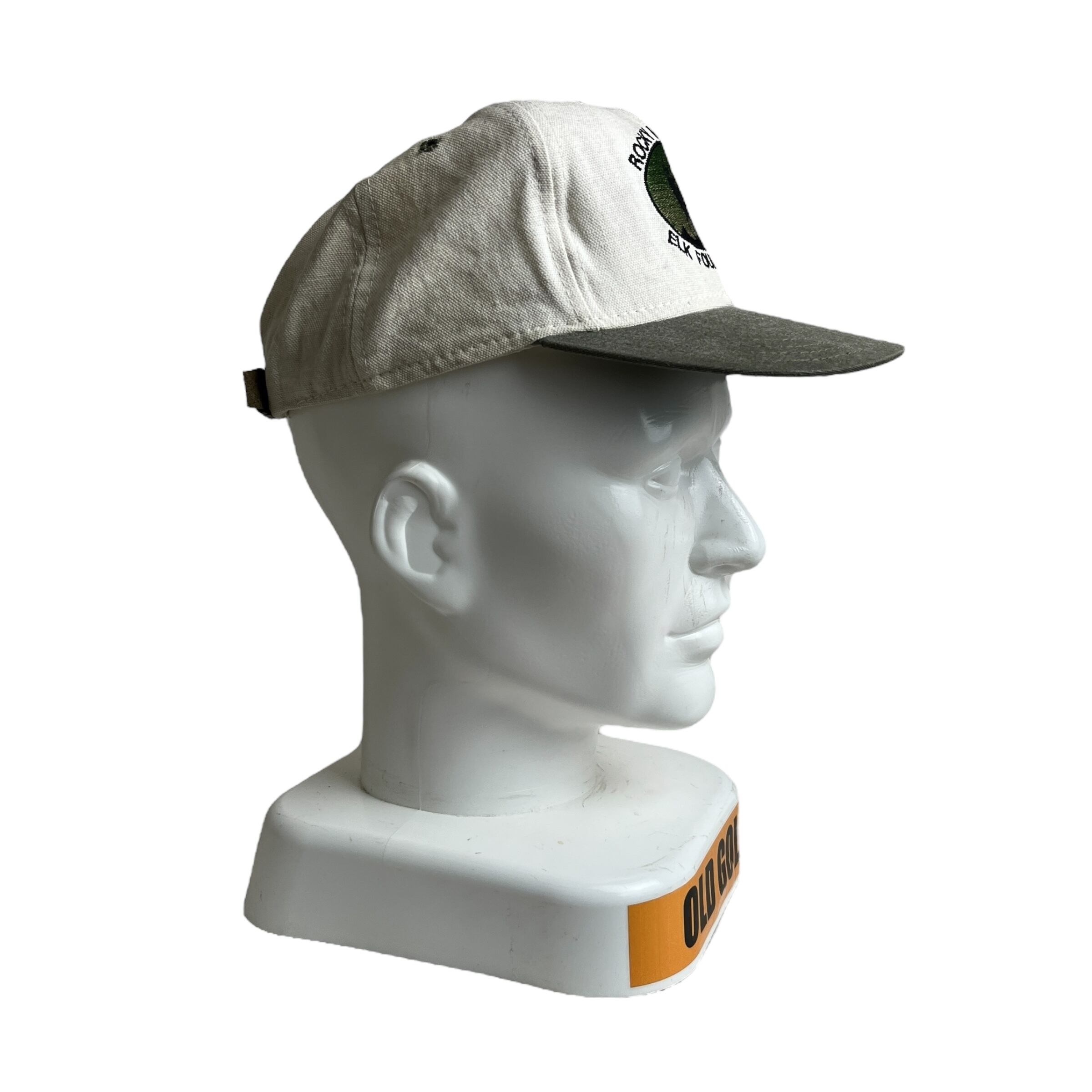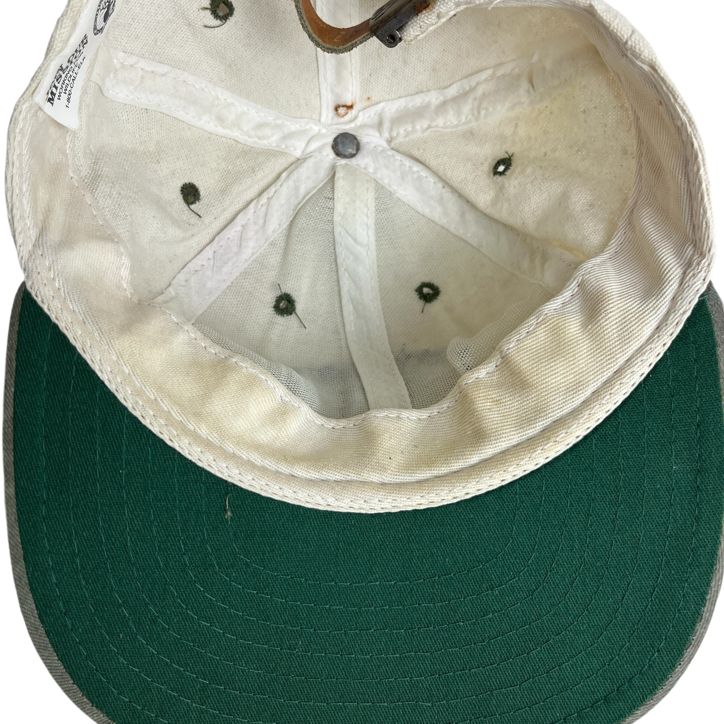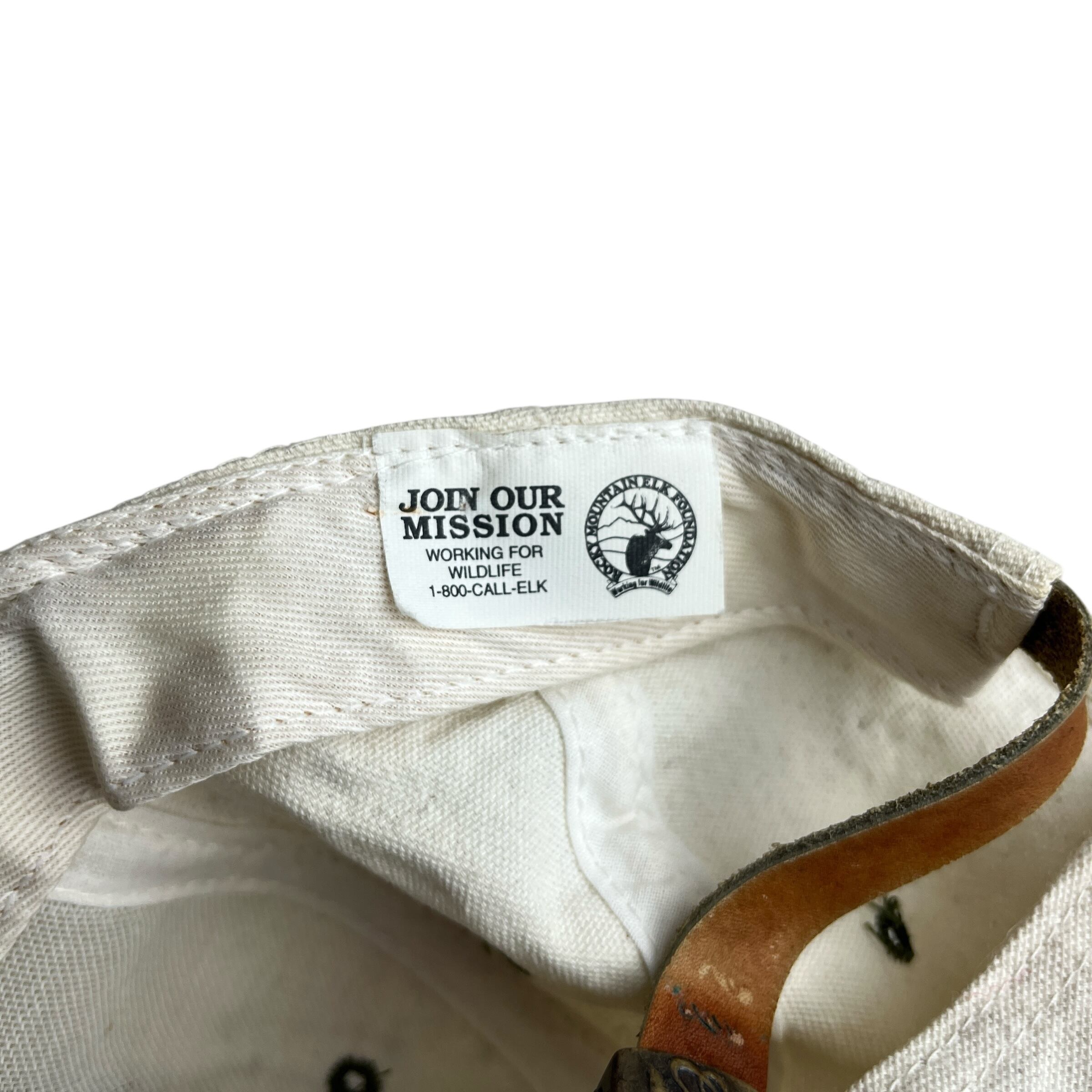 こちらは「ROCKY MOUNTAIN ELK FOUNDATION(ロッキーマウンテン・エルク財団)」のヴィンテージキャップです。フロントには森の中に立つエルク(アメリカアカシカ)のシルエットと団体名が刺繍され、自然保護活動のシンボルとなっています。生成りのクラウンに、オリーブグリーンのツバとボタンの組み合わせがアウトドアテイストを演出。内側タグには団体のミッションが記載されており、1990年代頃の非営利団体グッズとしての価値も高い一品です。