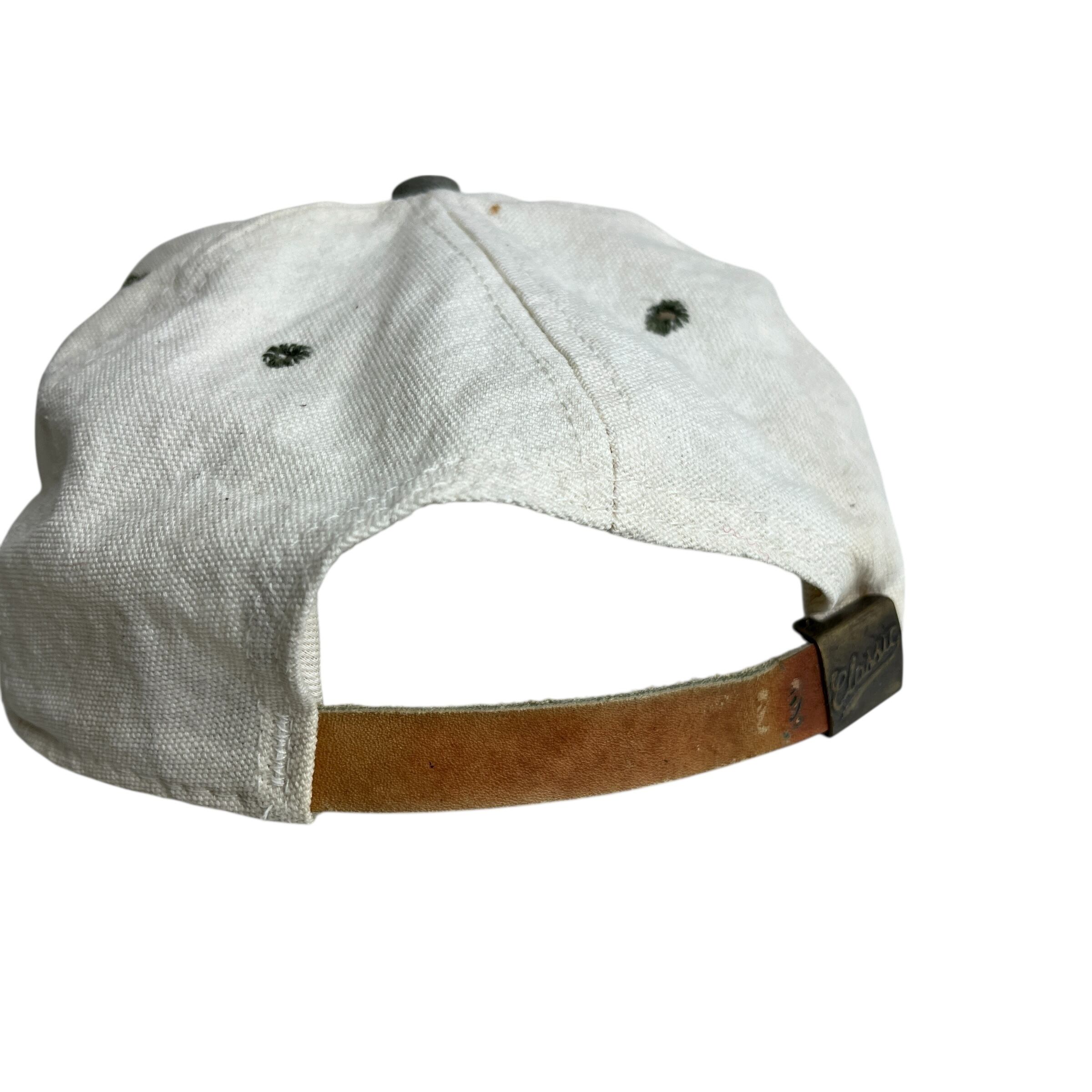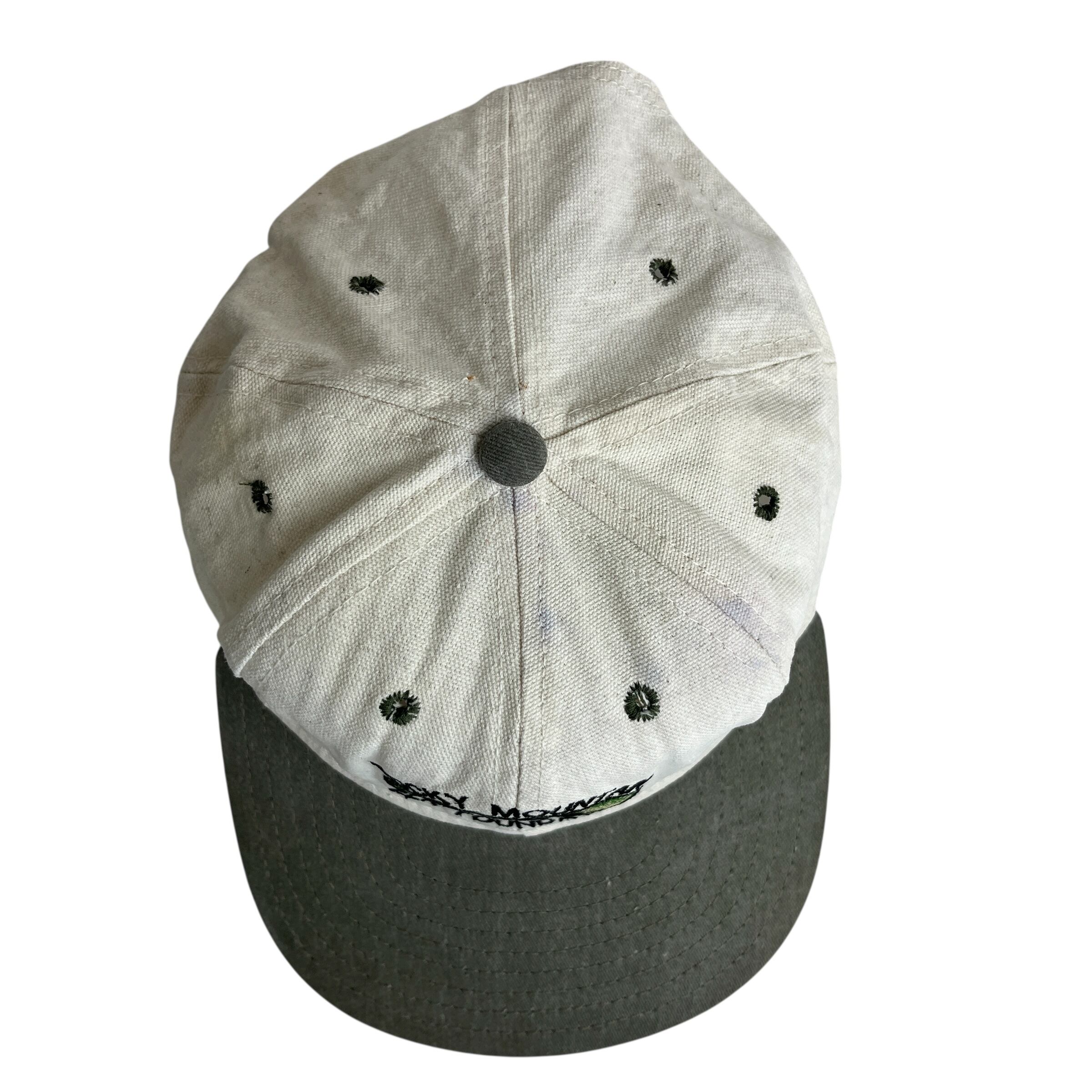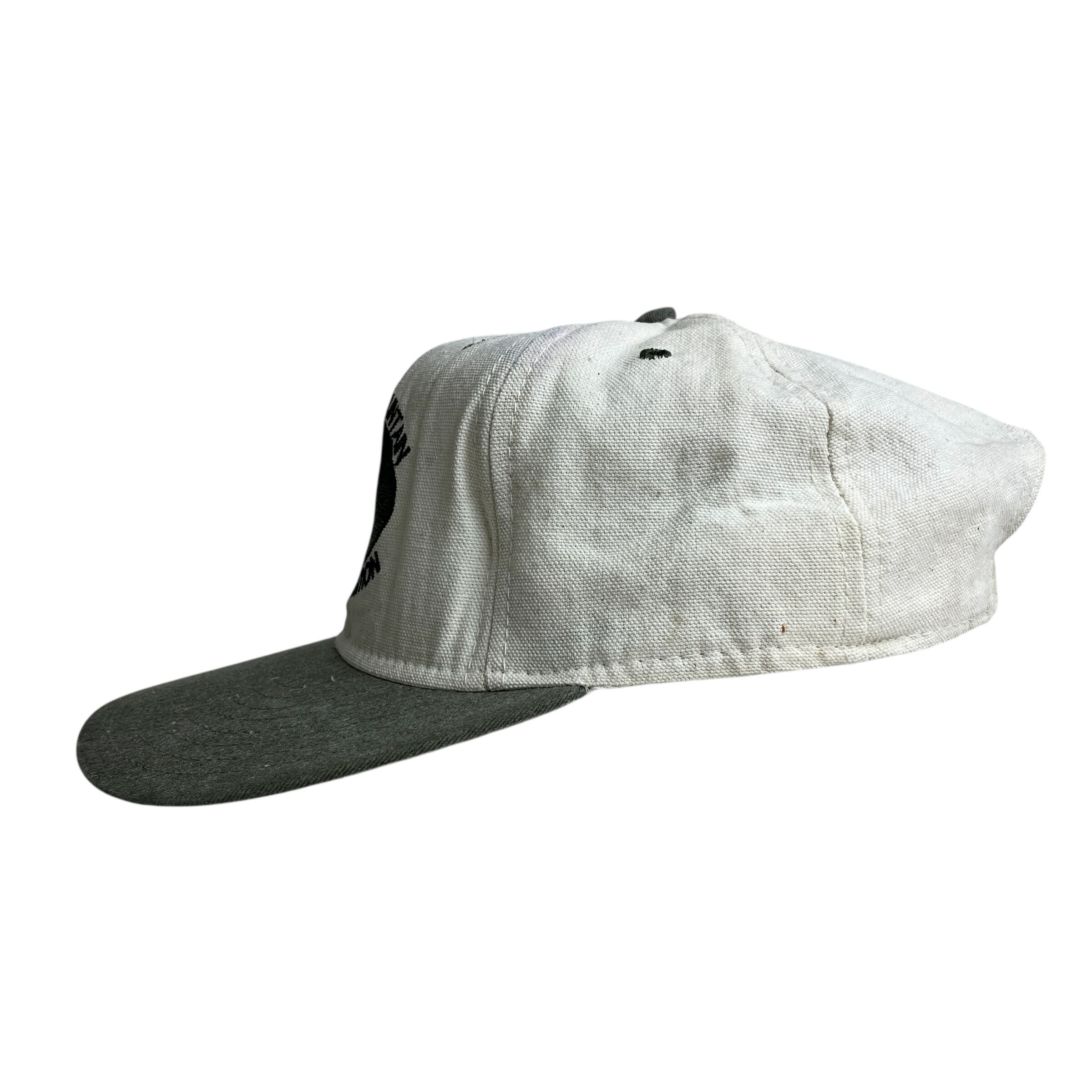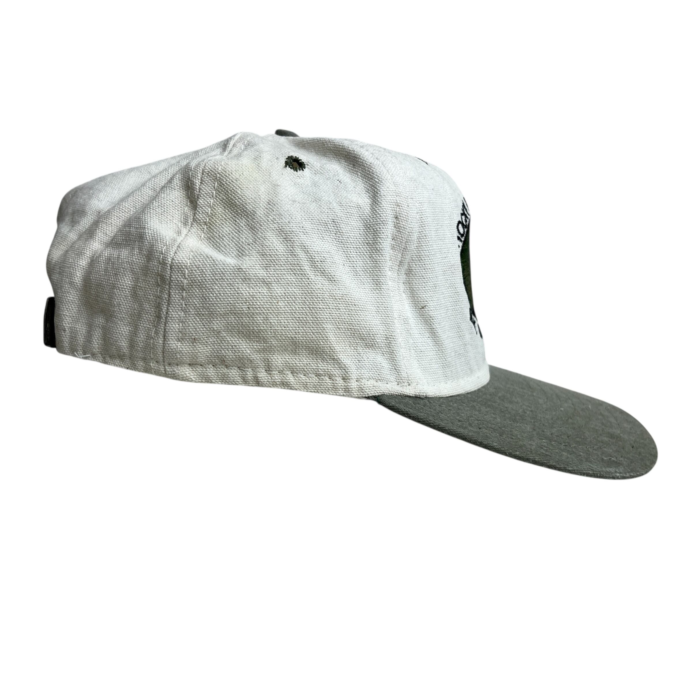 こちらは「ROCKY MOUNTAIN ELK FOUNDATION(ロッキーマウンテン・エルク財団)」のヴィンテージキャップです。フロントには森の中に立つエルク(アメリカアカシカ)のシルエットと団体名が刺繍され、自然保護活動のシンボルとなっています。生成りのクラウンに、オリーブグリーンのツバとボタンの組み合わせがアウトドアテイストを演出。内側タグには団体のミッションが記載されており、1990年代頃の非営利団体グッズとしての価値も高い一品です。