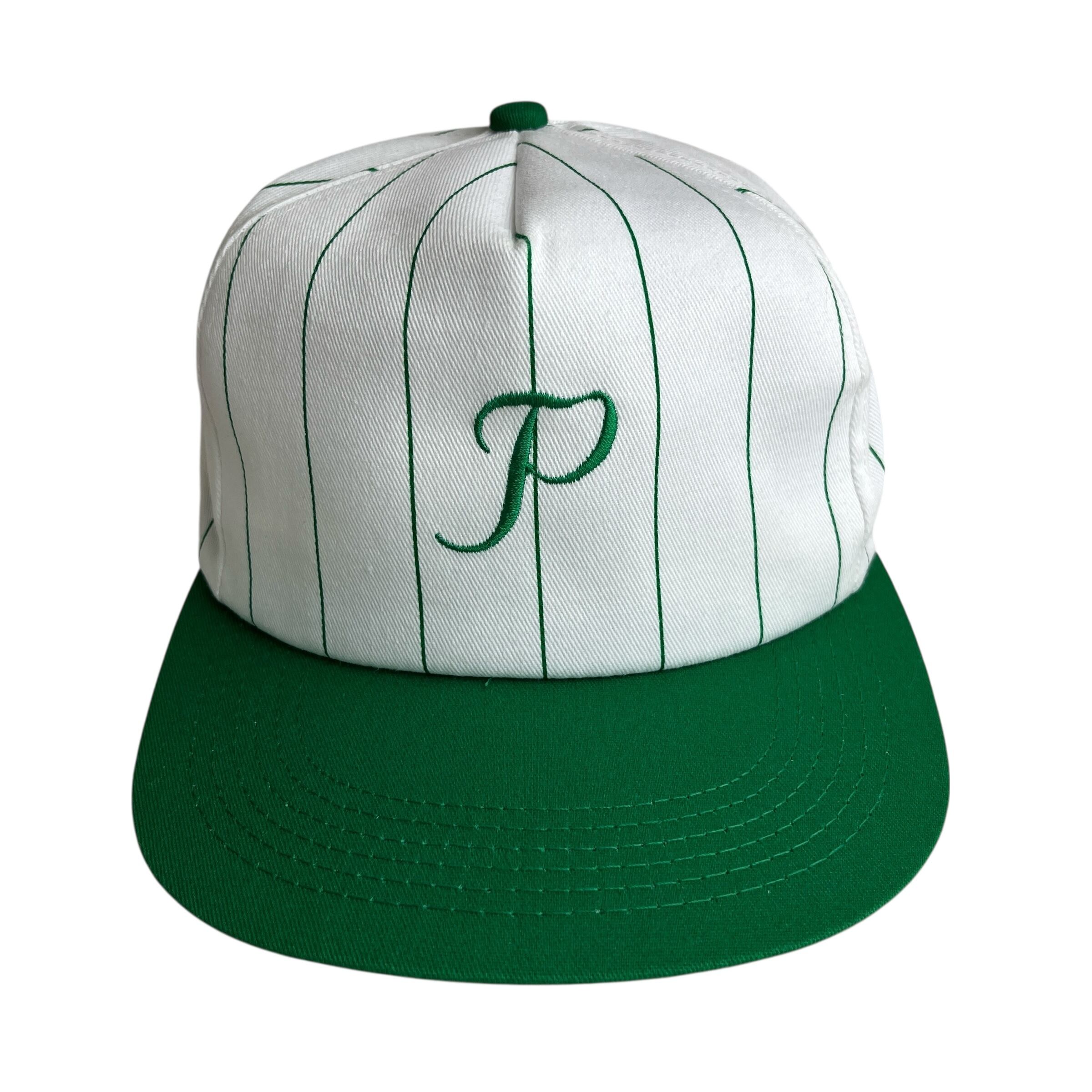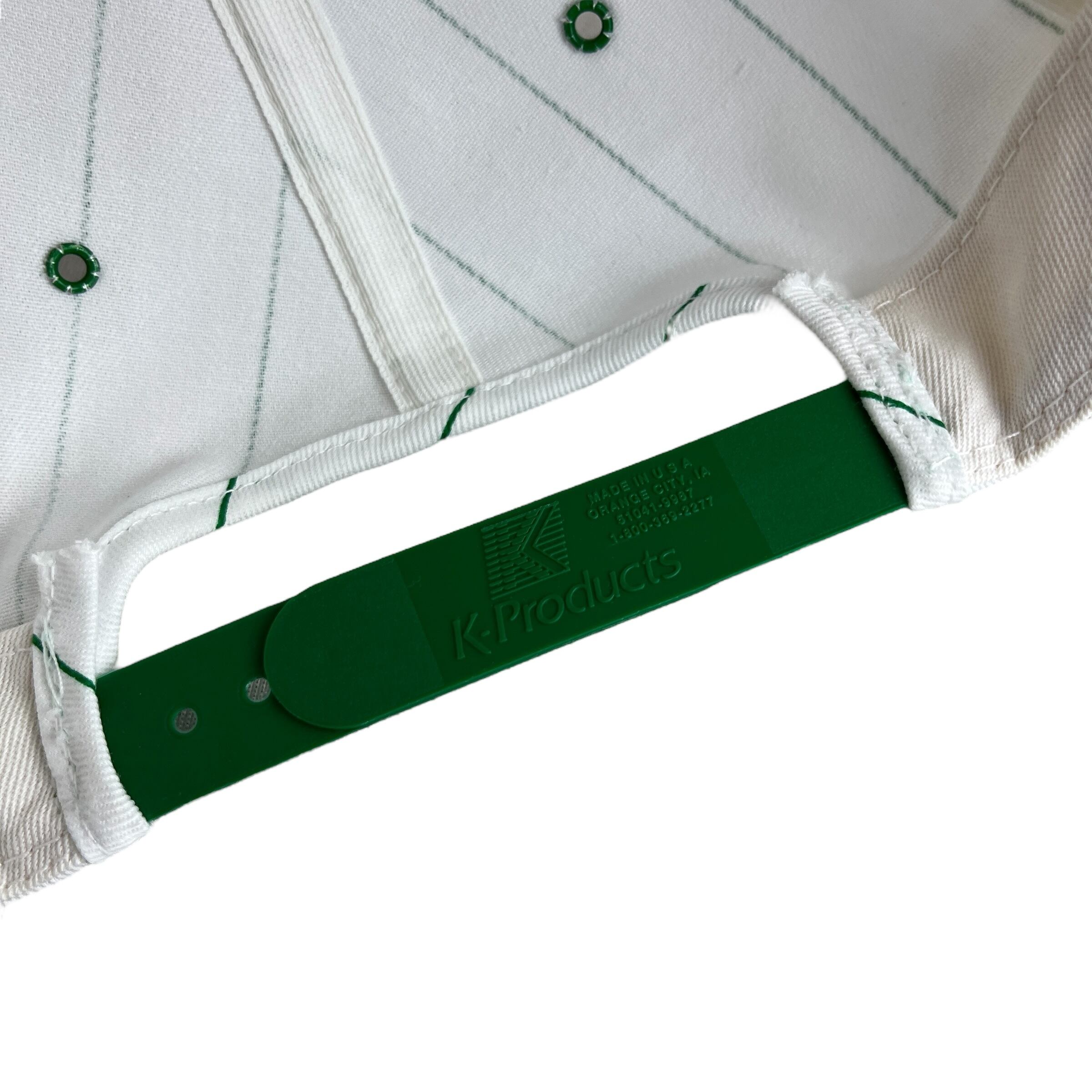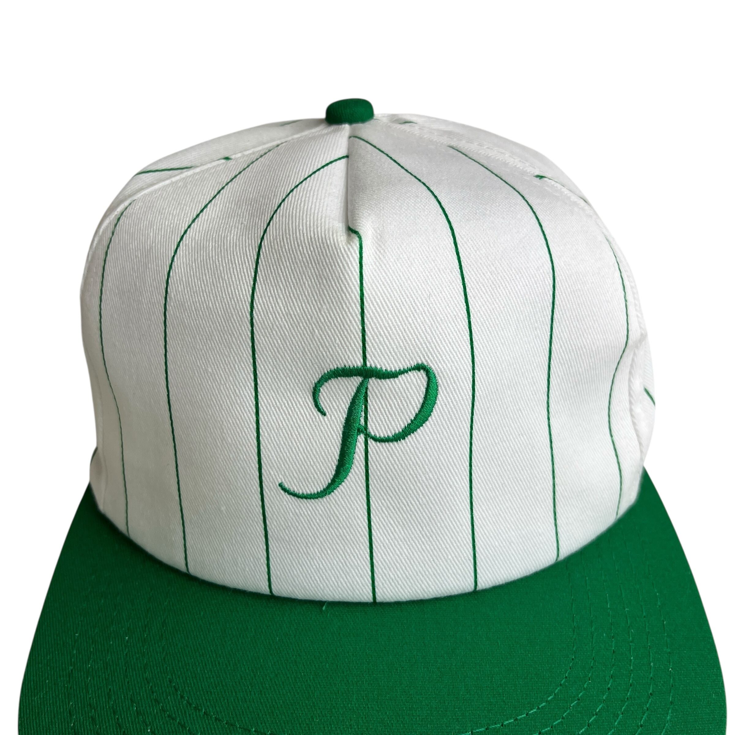 こちらは、グリーンのピンストライプ柄とシンプルな「P」刺繍がフロントに入った、ヴィンテージベースボールキャップです。ホワイトとグリーンの爽やかなカラーリングで、ブリムやスナップバックも同色のグリーンに統一されています。製造はアメリカ製で、内側スナップ部に「K-Products」の刻印があり、しっかりとした作りが特徴。K-Productsは企業・チームロゴ入りキャップの製造で知られ、耐久性とフィット感に優れた高品質な製品を展開していました。レトロな野球スタイルやコレクション用に最適な一点です。