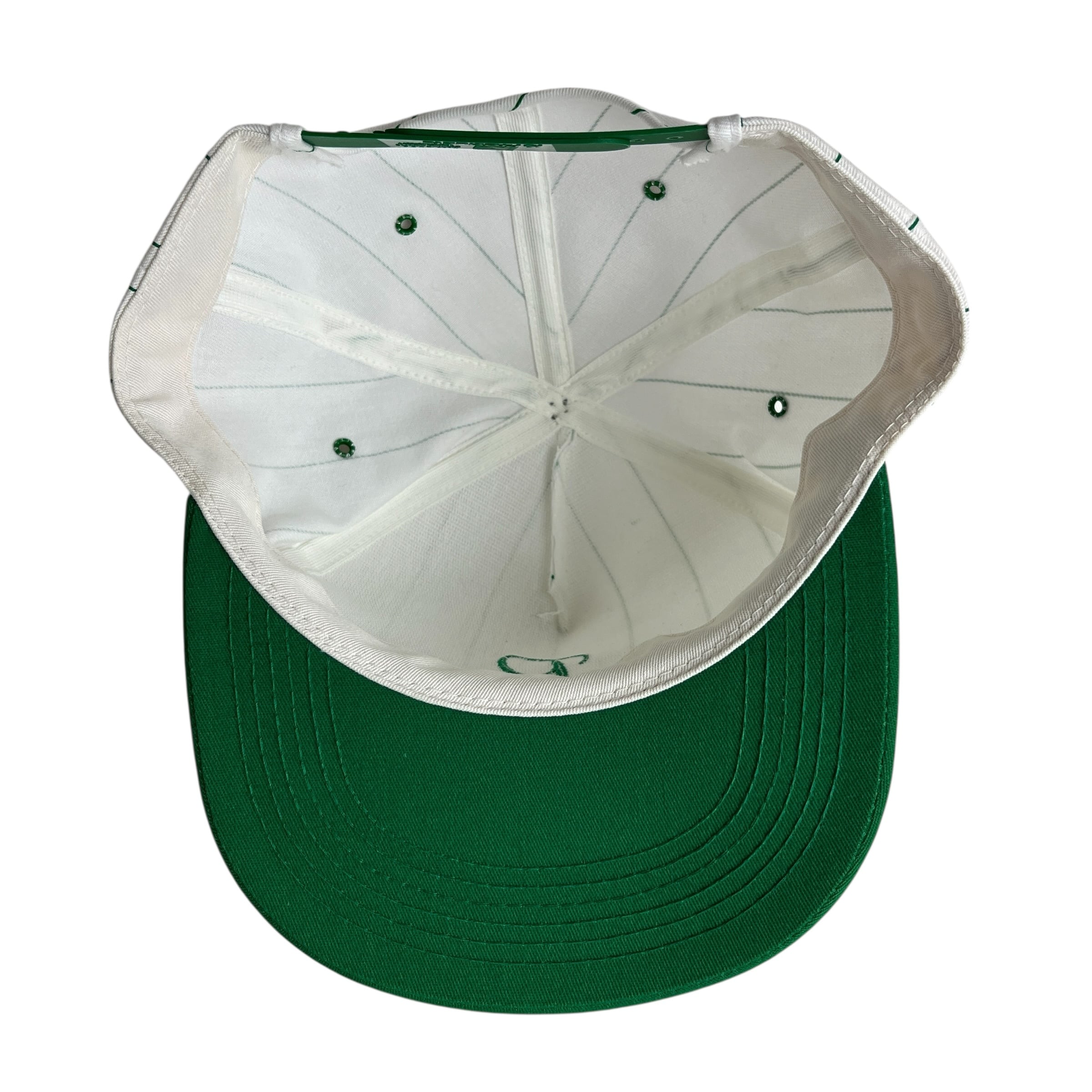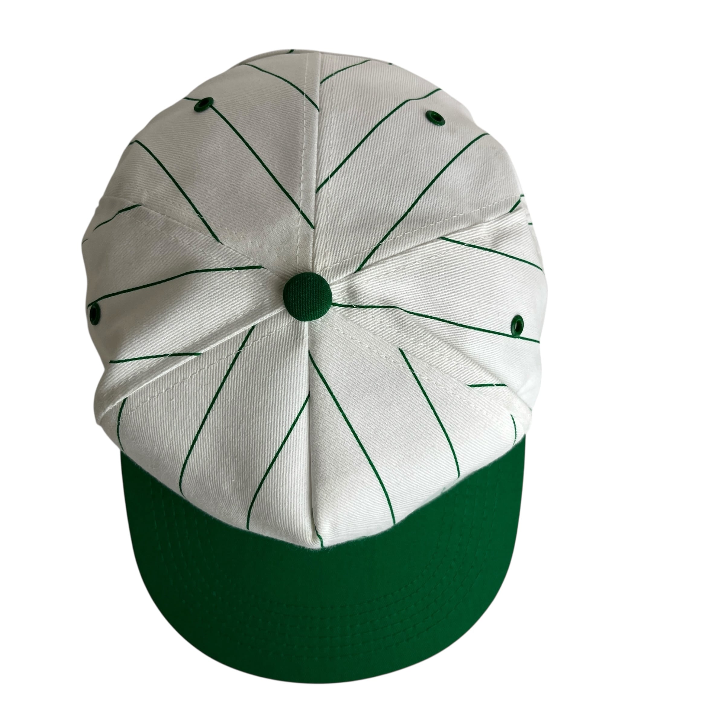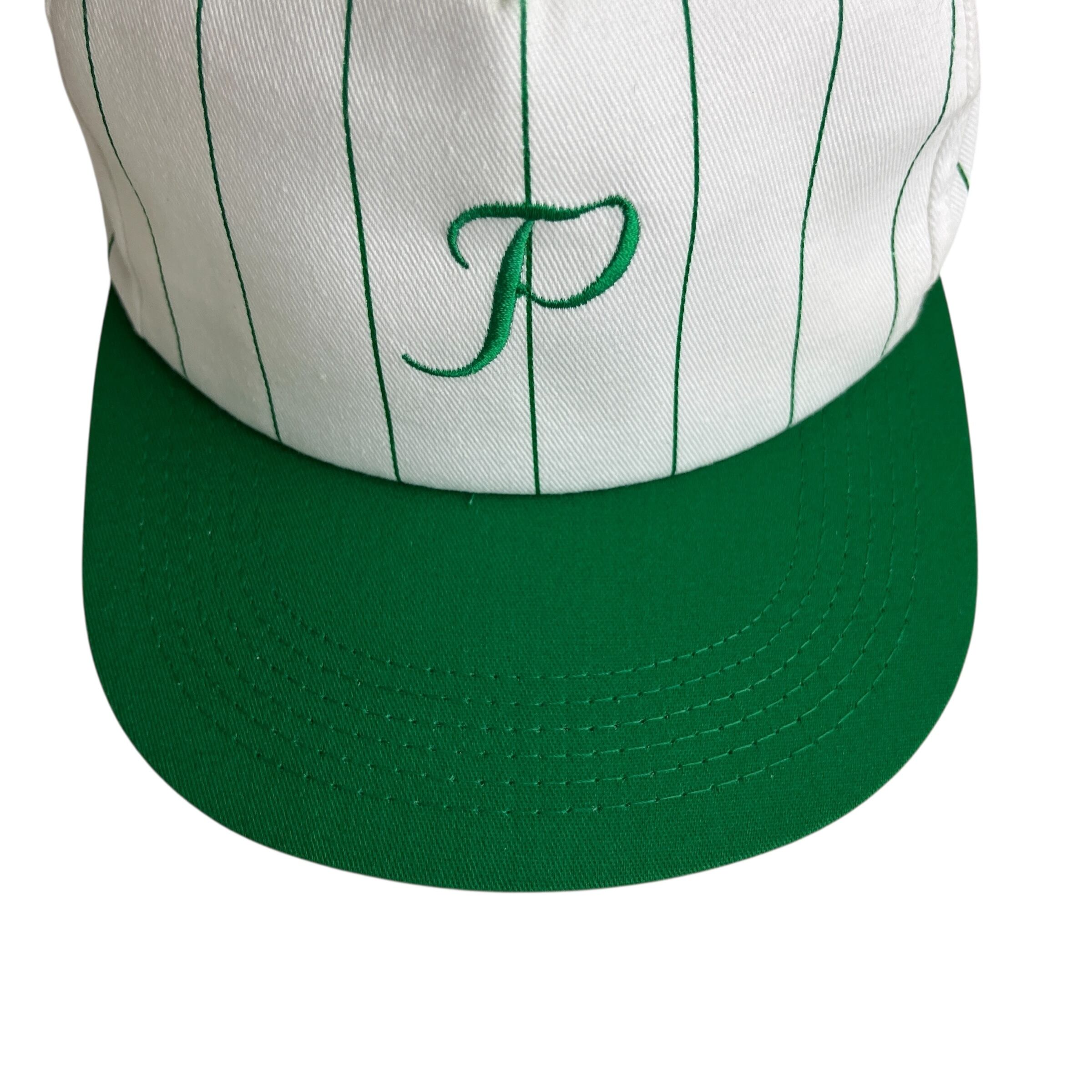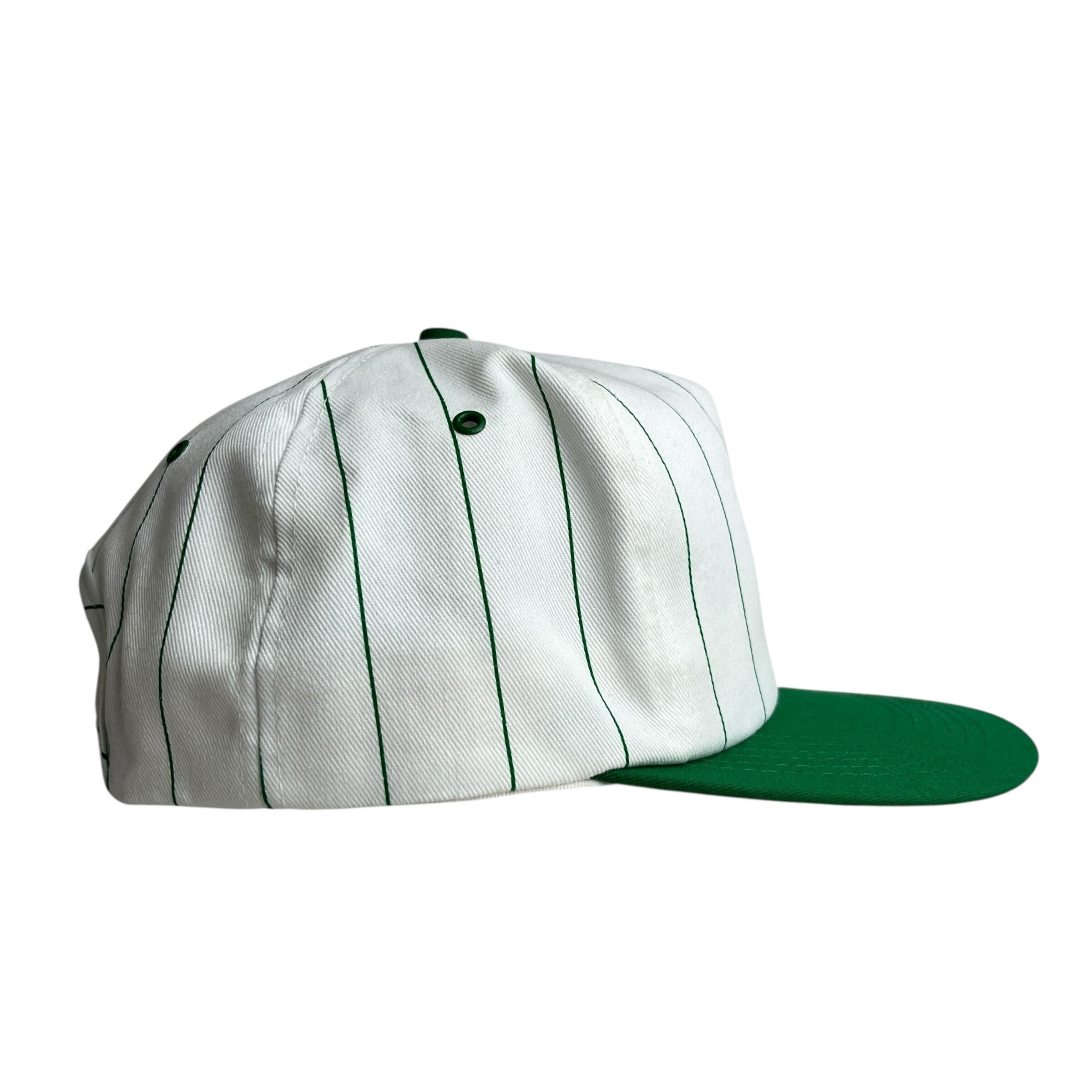 こちらは、グリーンのピンストライプ柄とシンプルな「P」刺繍がフロントに入った、ヴィンテージベースボールキャップです。ホワイトとグリーンの爽やかなカラーリングで、ブリムやスナップバックも同色のグリーンに統一されています。製造はアメリカ製で、内側スナップ部に「K-Products」の刻印があり、しっかりとした作りが特徴。K-Productsは企業・チームロゴ入りキャップの製造で知られ、耐久性とフィット感に優れた高品質な製品を展開していました。レトロな野球スタイルやコレクション用に最適な一点です。