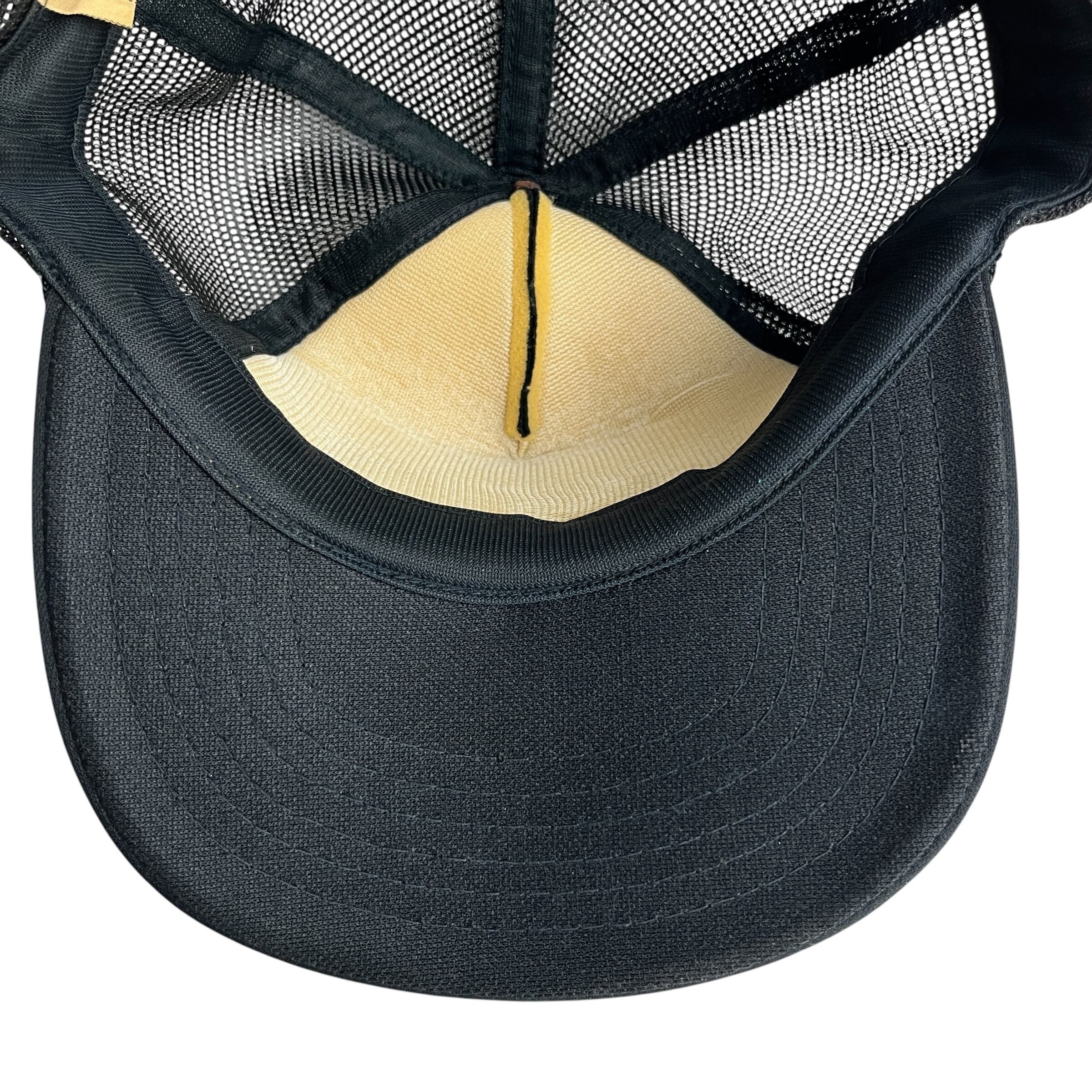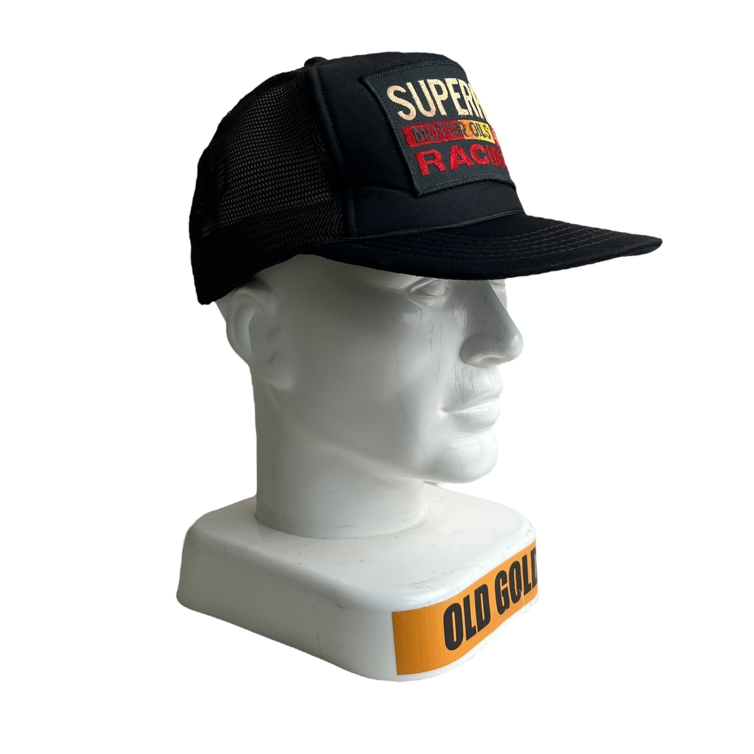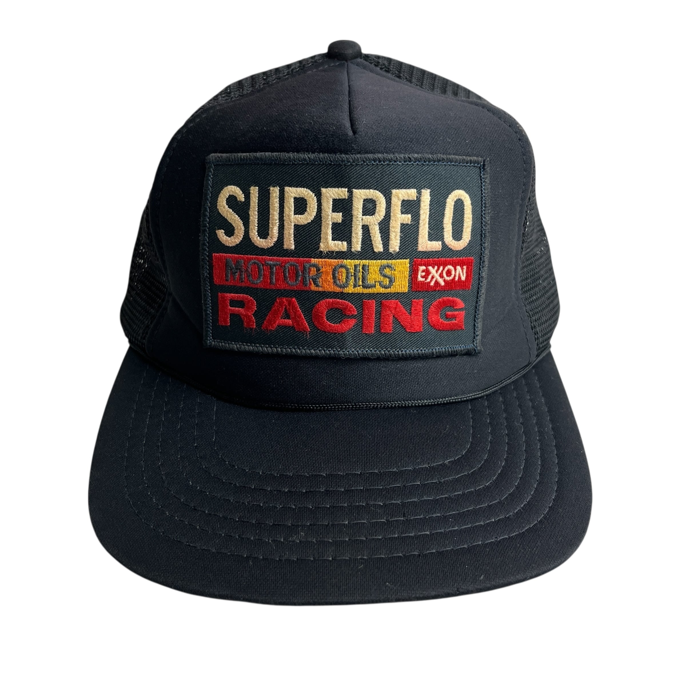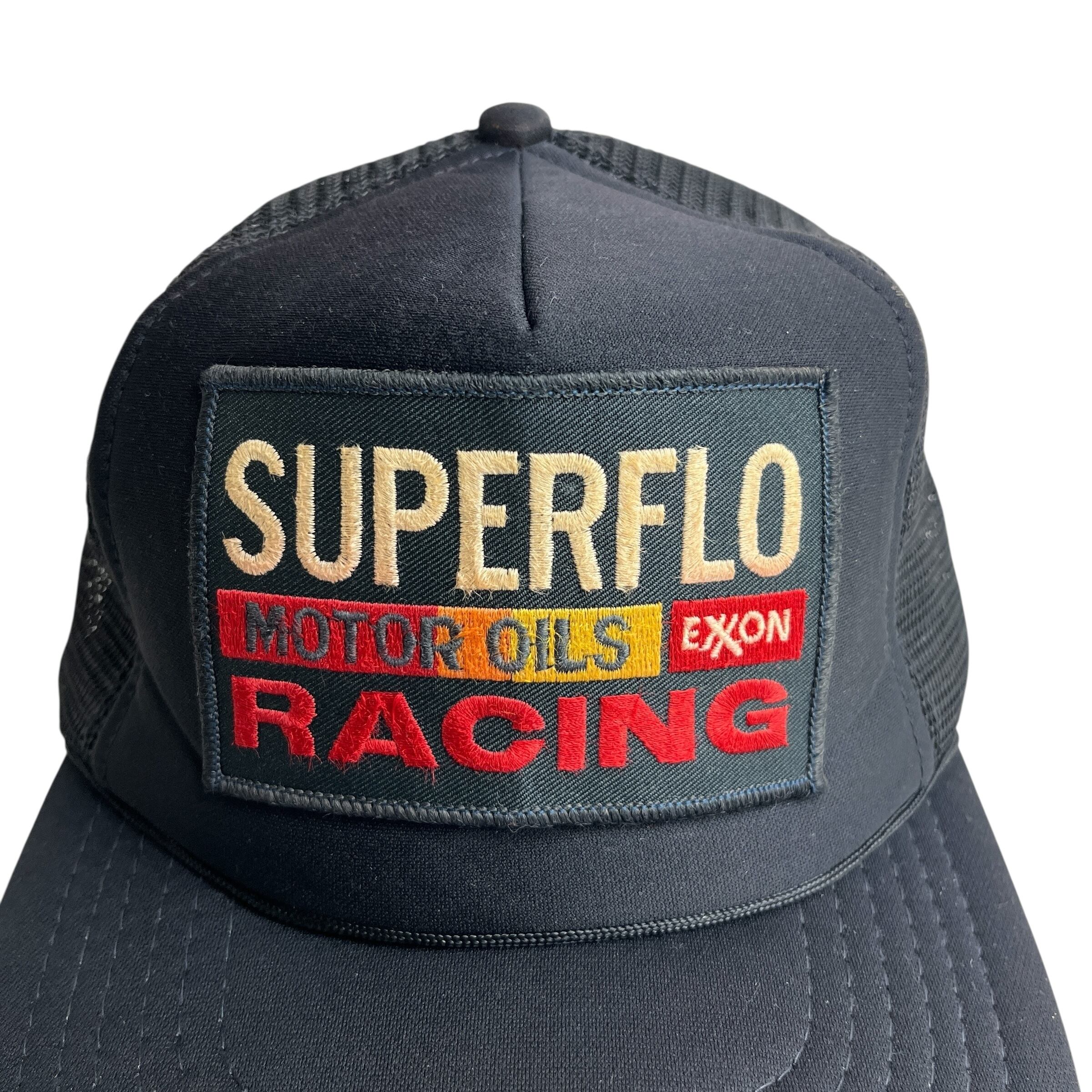 80年代〜90年代初頭頃のヴィンテージ・トラッカーキャップです。石油大手EXXONのモーターオイルブランド「SUPERFLO」の希少なレーシングプロモーションアイテム。当時のモータースポーツシーンを彷彿とさせる、レトロなカラーリングの刺繍ワッペンが抜群の存在感を放ちます。無骨なブラックボディとの対比もクールな一品。古着好き、企業物コレクター、モータースポーツファンにおすすめです。