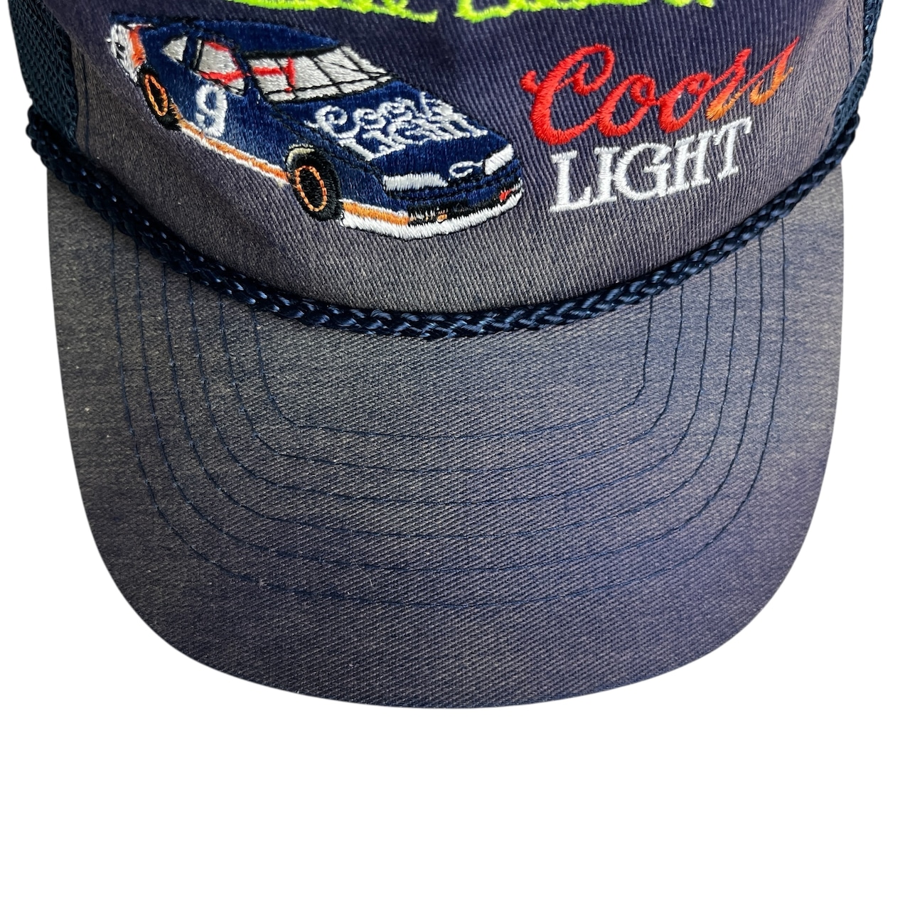 フロントには、NASCARの伝説的ドライバー、ビル・エリオットのシグネチャーと、彼の象徴的な9号車のレースカー、そしてメインスポンサーであった「クアーズ・ライト」のロゴが色鮮やかな刺繍で施されています。ネイビーカラーを基調としたボディとメッシュの組み合わせが、当時の雰囲気を色濃く反映しており、モータースポーツファンや古着コレクターにはたまらない一品です。