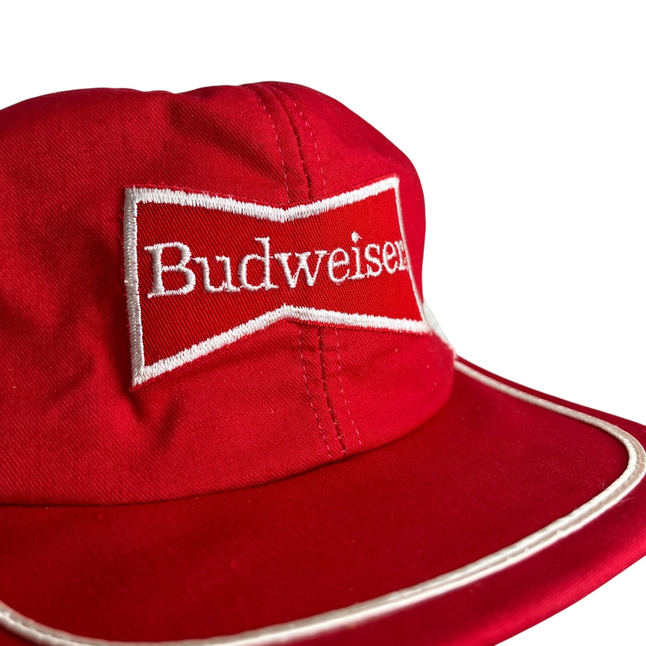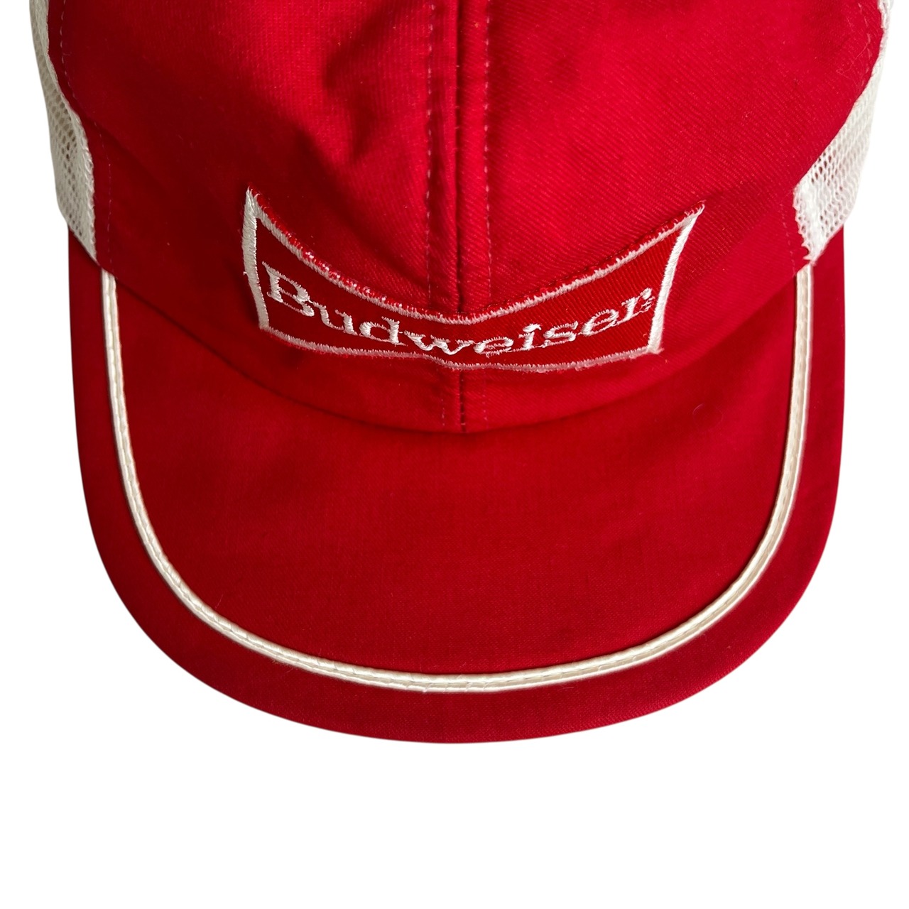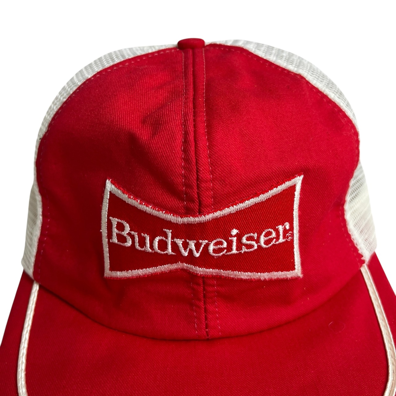 フロントには"KING OF BEERS"として世界的に知られる「Budweiser (バドバイザー)」の定番ロゴワッペンが大きく配置されています。赤と白のアイコニックなカラーリングが80年代の雰囲気を醸し出す、シンプルながら存在感のある一品。アジャスターに「MADE IN USA」の刻印が入る、ヴィンテージファンには嬉しいポイントです。
