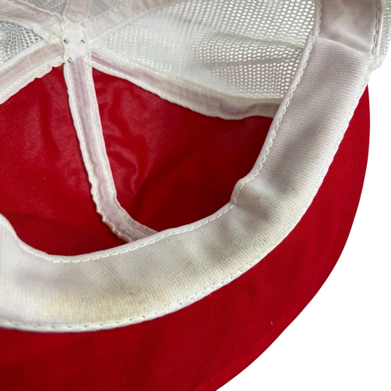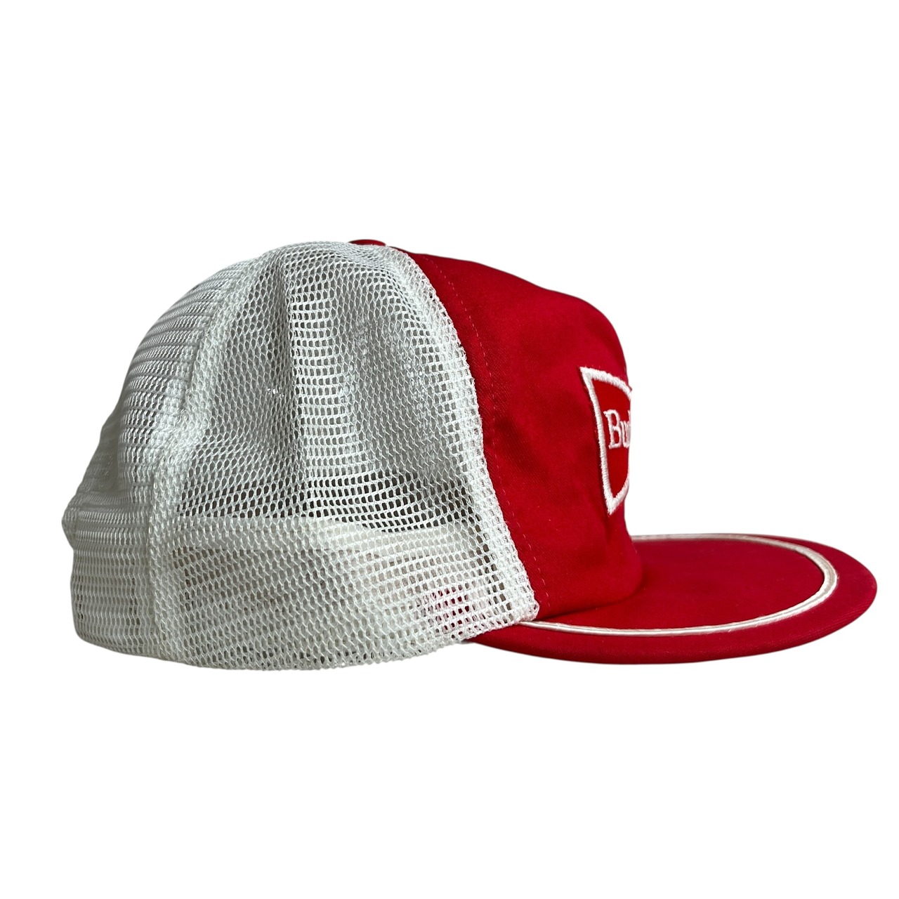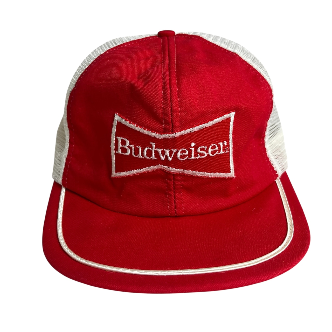 フロントには"KING OF BEERS"として世界的に知られる「Budweiser (バドバイザー)」の定番ロゴワッペンが大きく配置されています。赤と白のアイコニックなカラーリングが80年代の雰囲気を醸し出す、シンプルながら存在感のある一品。アジャスターに「MADE IN USA」の刻印が入る、ヴィンテージファンには嬉しいポイントです。
