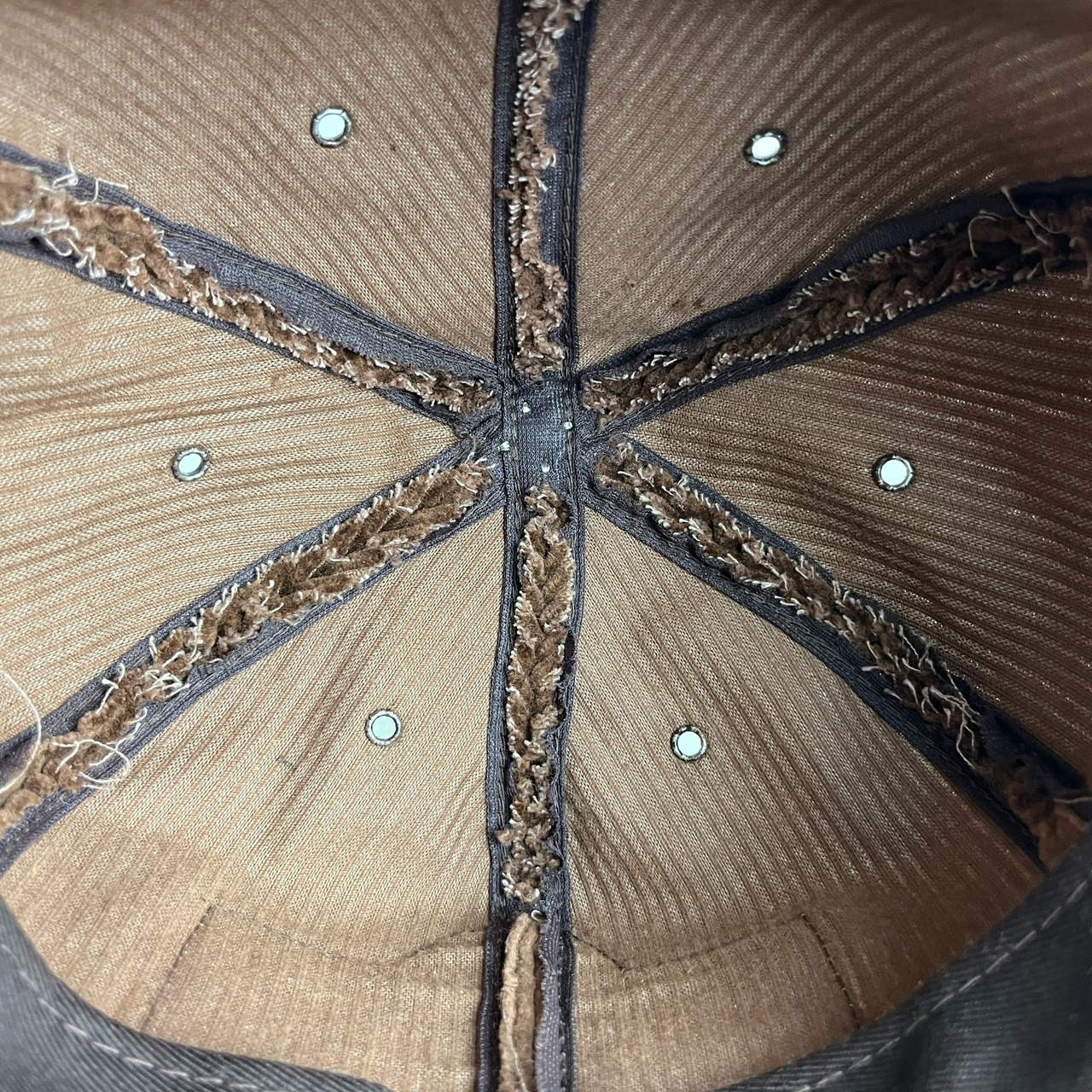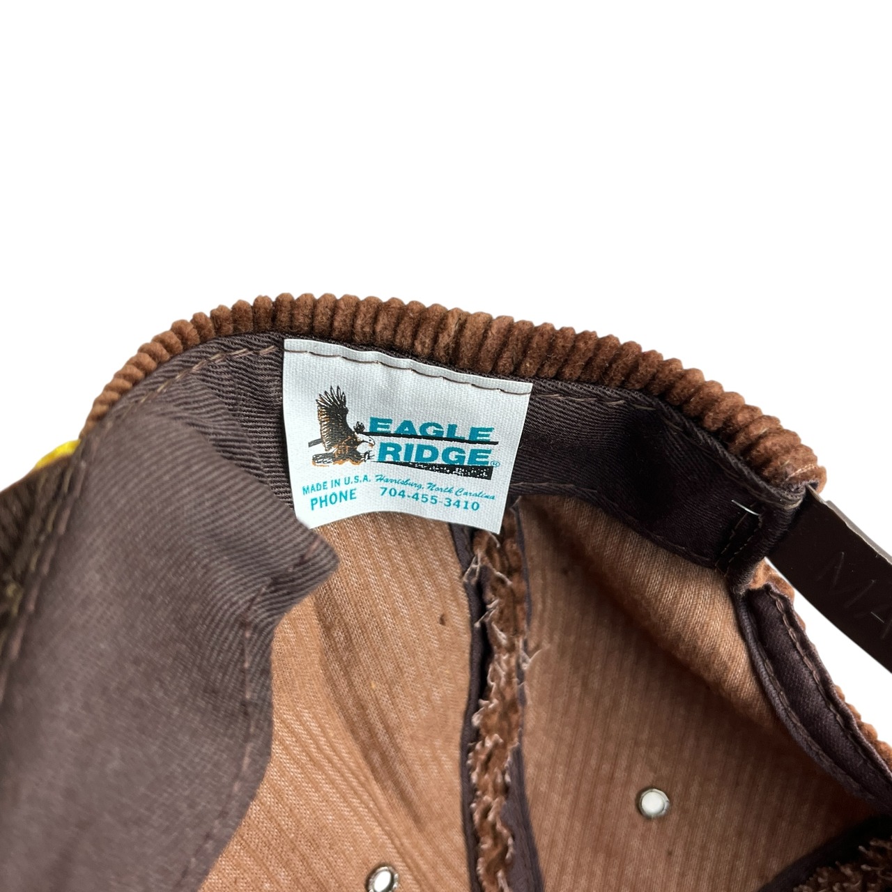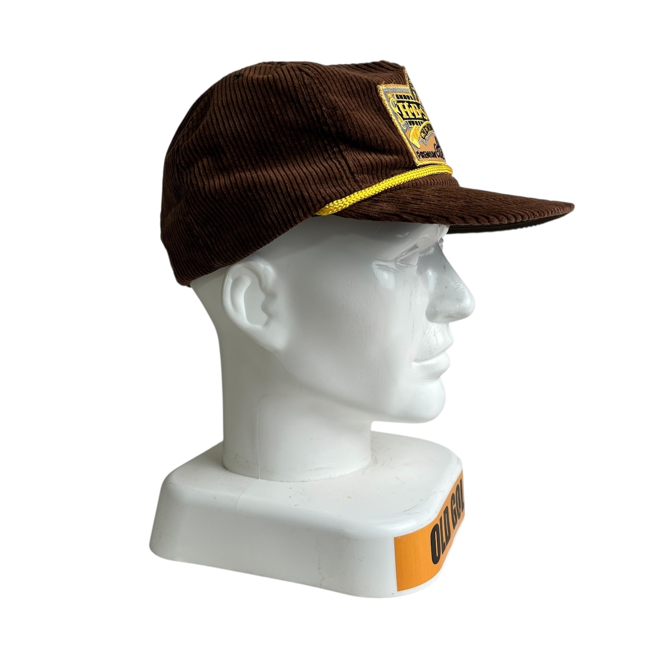 80年代にアメリカで製造された、EAGLE RIDGE社製のヴィンテージキャップです。温かみのあるブラウンのコーデュロイ素材と、フロントのロープが当時の雰囲気を醸し出しています。H.B.スコット・チューイングタバコの非常に精巧な刺繍ワッペンがデザインの決め手。企業の販促品ながらファッション性が高く、古着スタイルに深みを与えてくれる一品です。