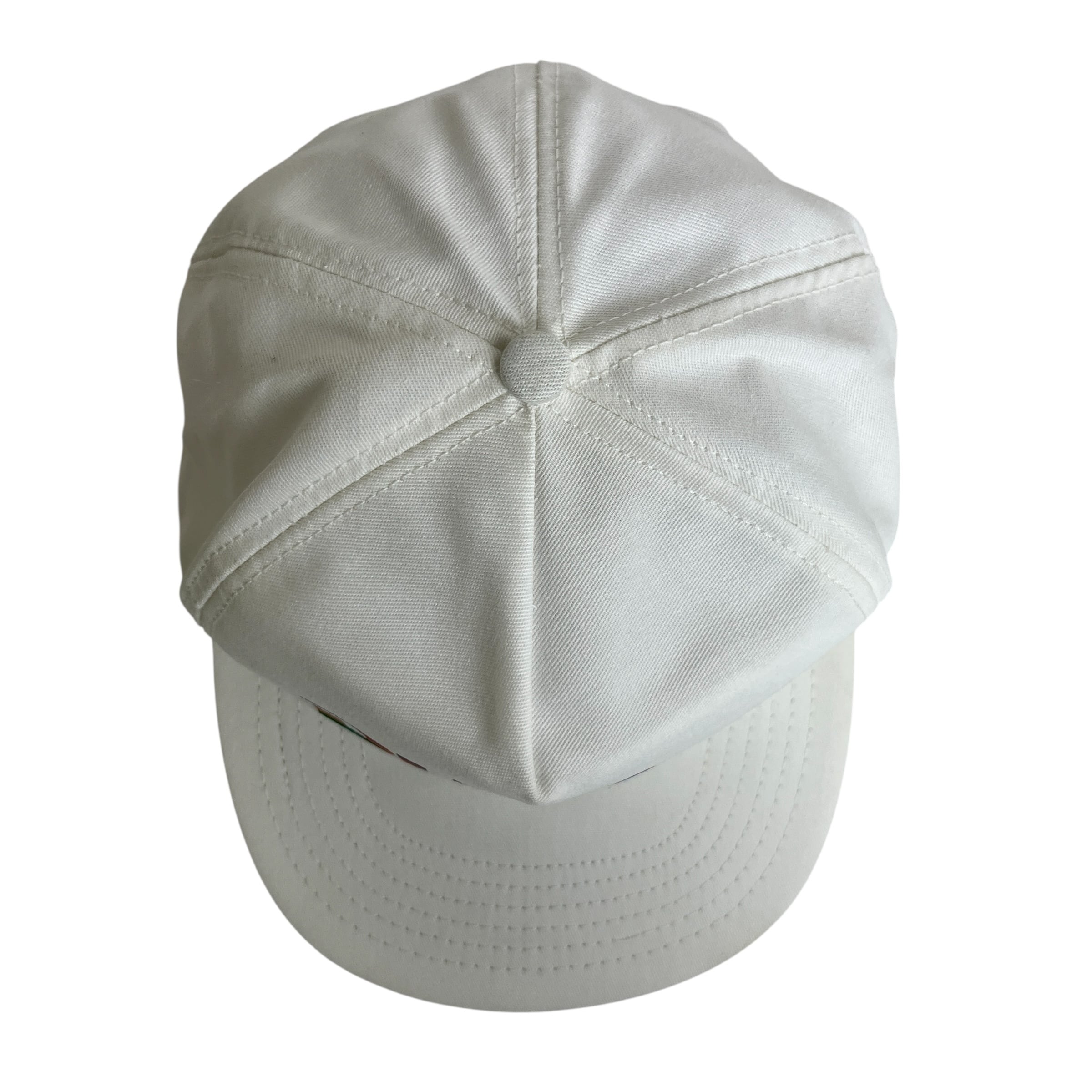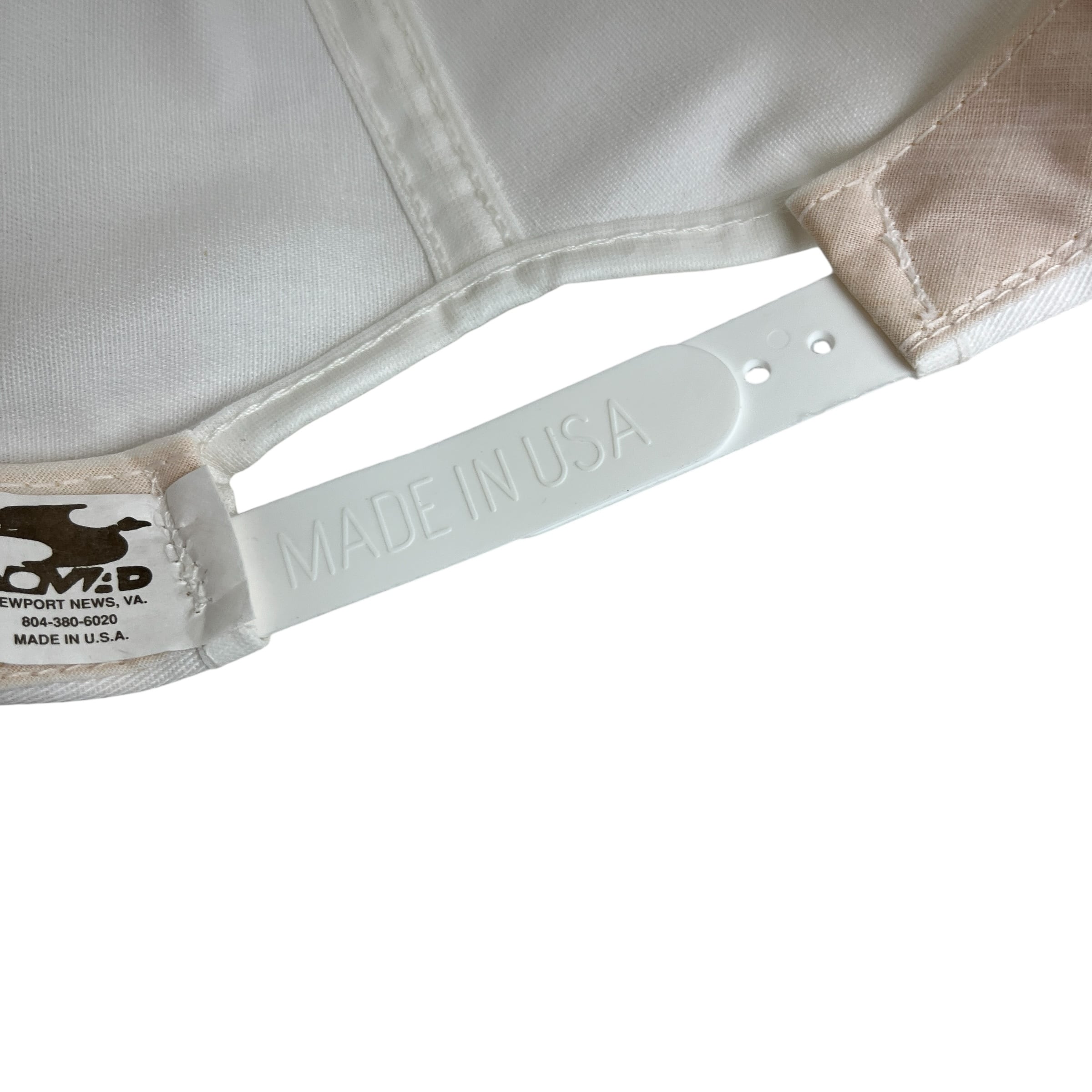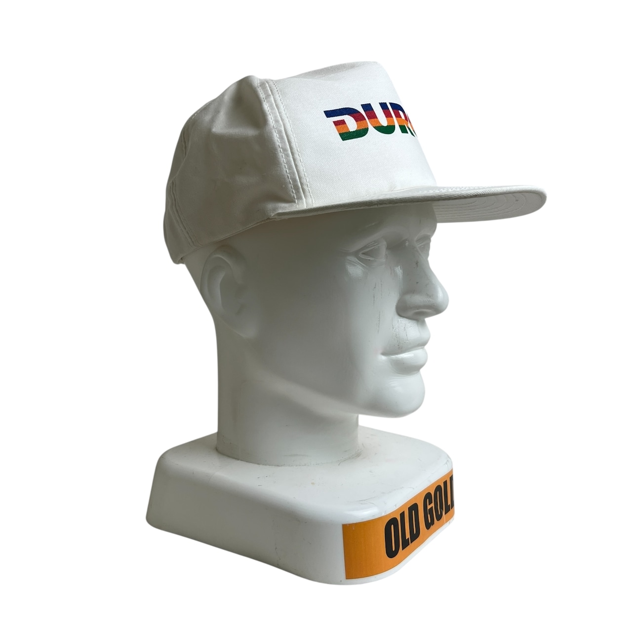 クリーンなホワイトのボディに、力強いレインボーカラーのロゴ刺繍が映える、ビンテージのDURON Paints & Wallcoverings(塗料会社)のキャップです。ロゴのマルチカラーは、塗料メーカーの「色彩」というアイデンティティを表現しています。内側のタグには「NOMAD, MADE IN U.S.A.」とあり、製造年代は1980年代後半から1990年代前半のアメリカ製と特定できます。