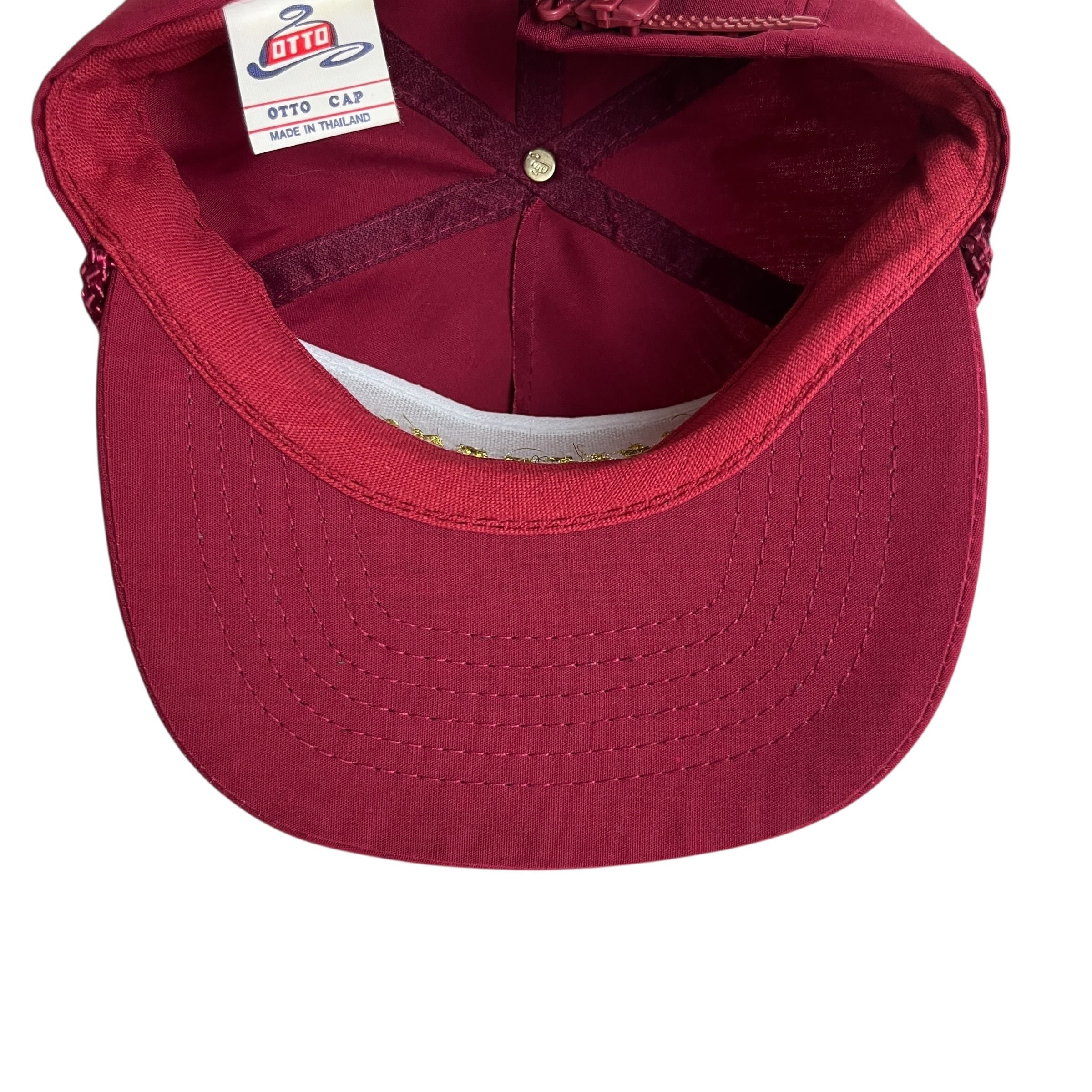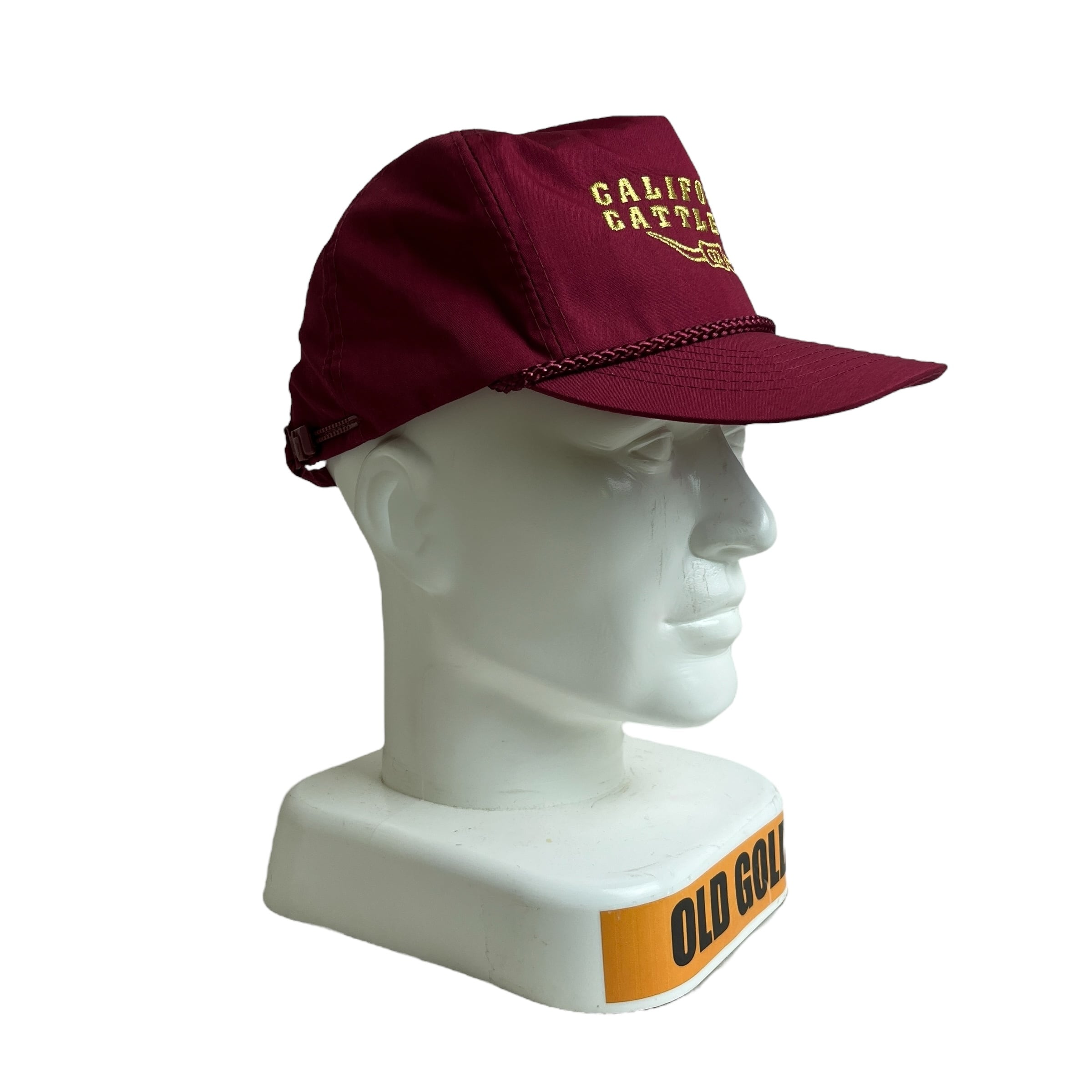 深みのあるマルーン(赤茶色)のボディに、金色の刺繍が重厚な印象を与えるCalifornia Cattlemen's Association (CCA) のキャップです。ロゴには「CALIFORNIA CATTLEMAN」の文字と、中央に牛の角のモチーフがデザインされています。内タグはハットメーカー「OTTO CAP」で、製造は1990年代頃と思われます。ツバの上のロープがクラシックな雰囲気を加えており、カリフォルニア州の畜産業界の歴史を伝える、希少なアグリカルチャー系ビンテージアイテムです。