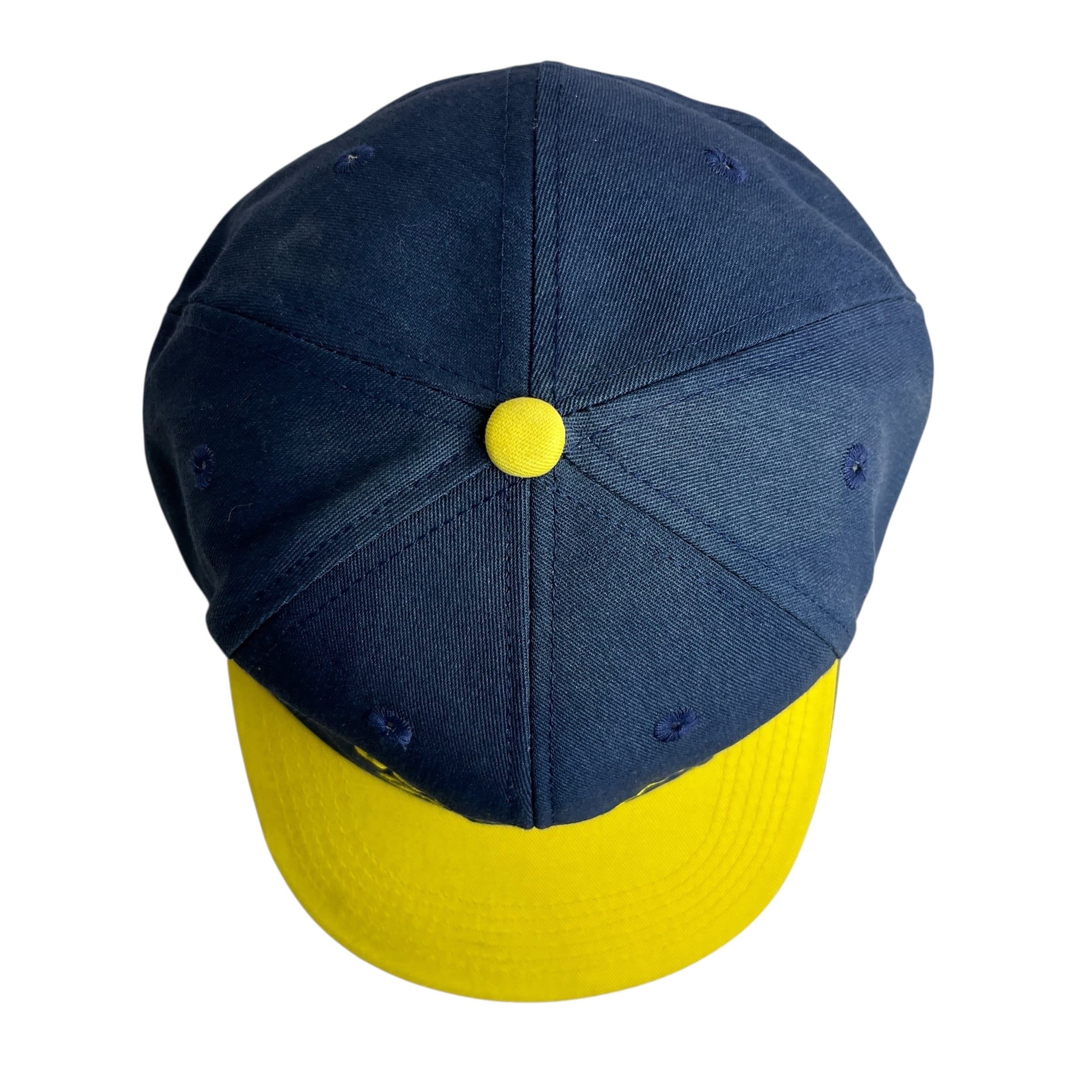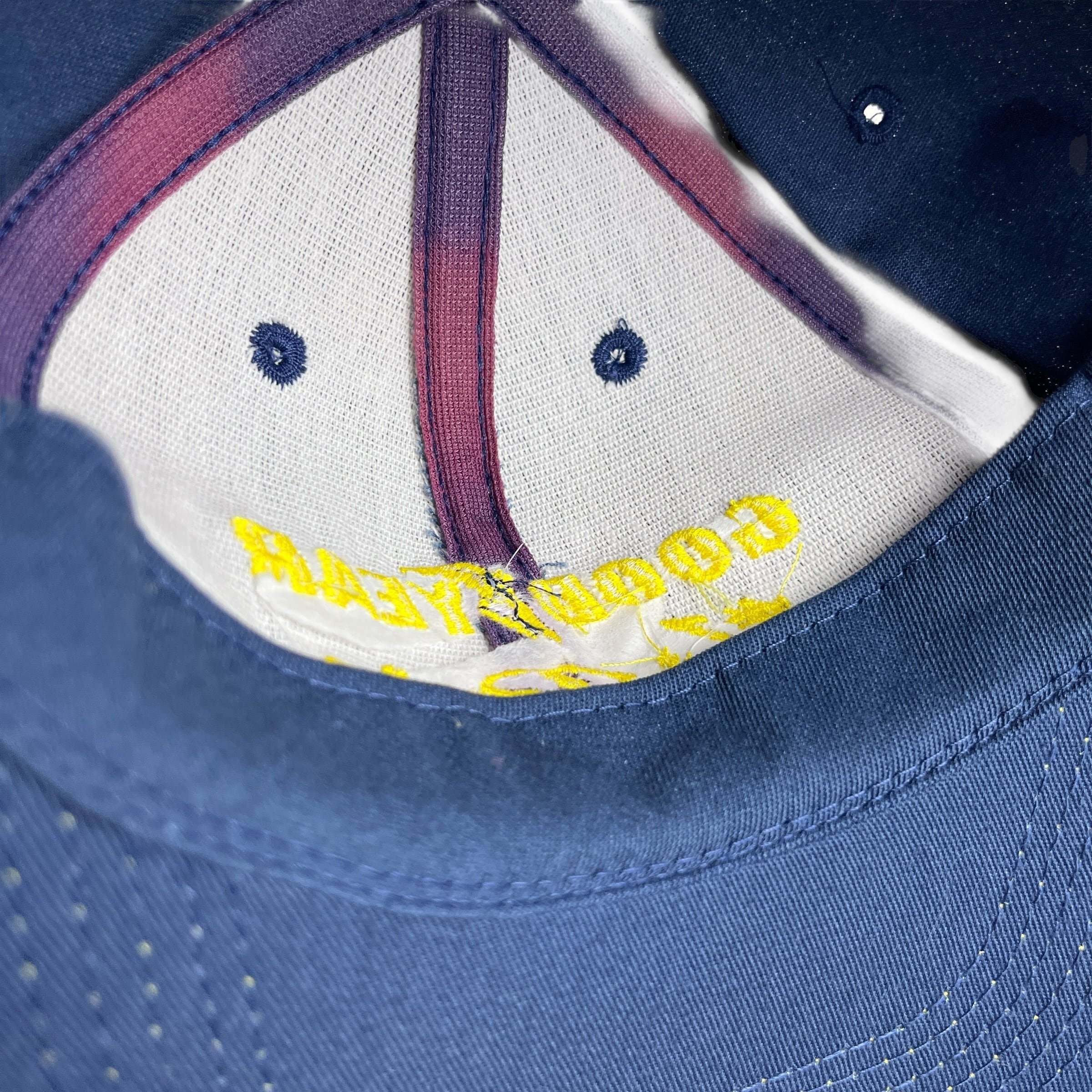 ネイビーの本体と鮮やかなイエローのツバのコントラストが目を引くツートンカラーキャップです。フロントには、タイヤメーカーGOODYEARの象徴的な翼の生えた足のマークと「#1 in Racing」の文字がイエローで刺繍されています。これは、グッドイヤーがモータースポーツ界で果たしてきた役割を強調する、公式の企業ノベルティと思われます。