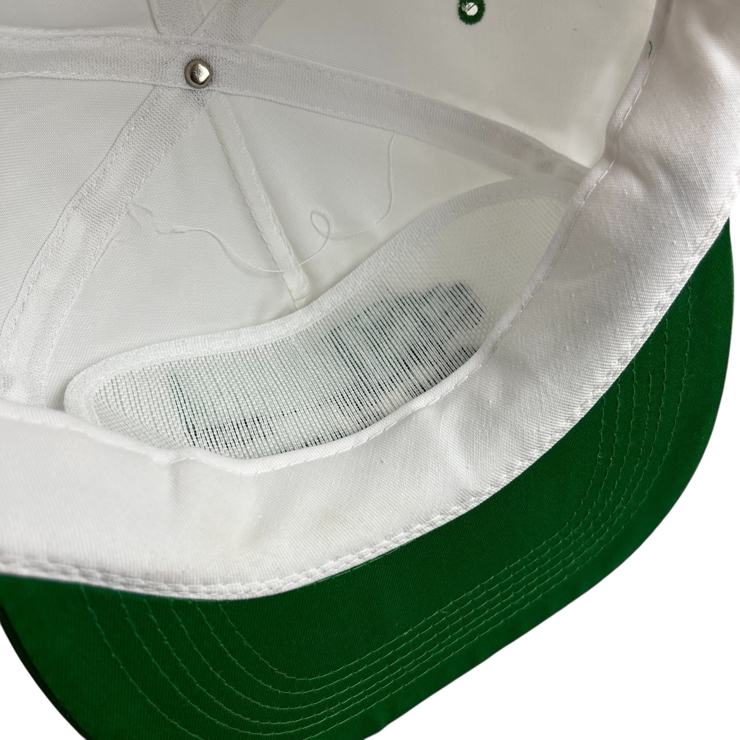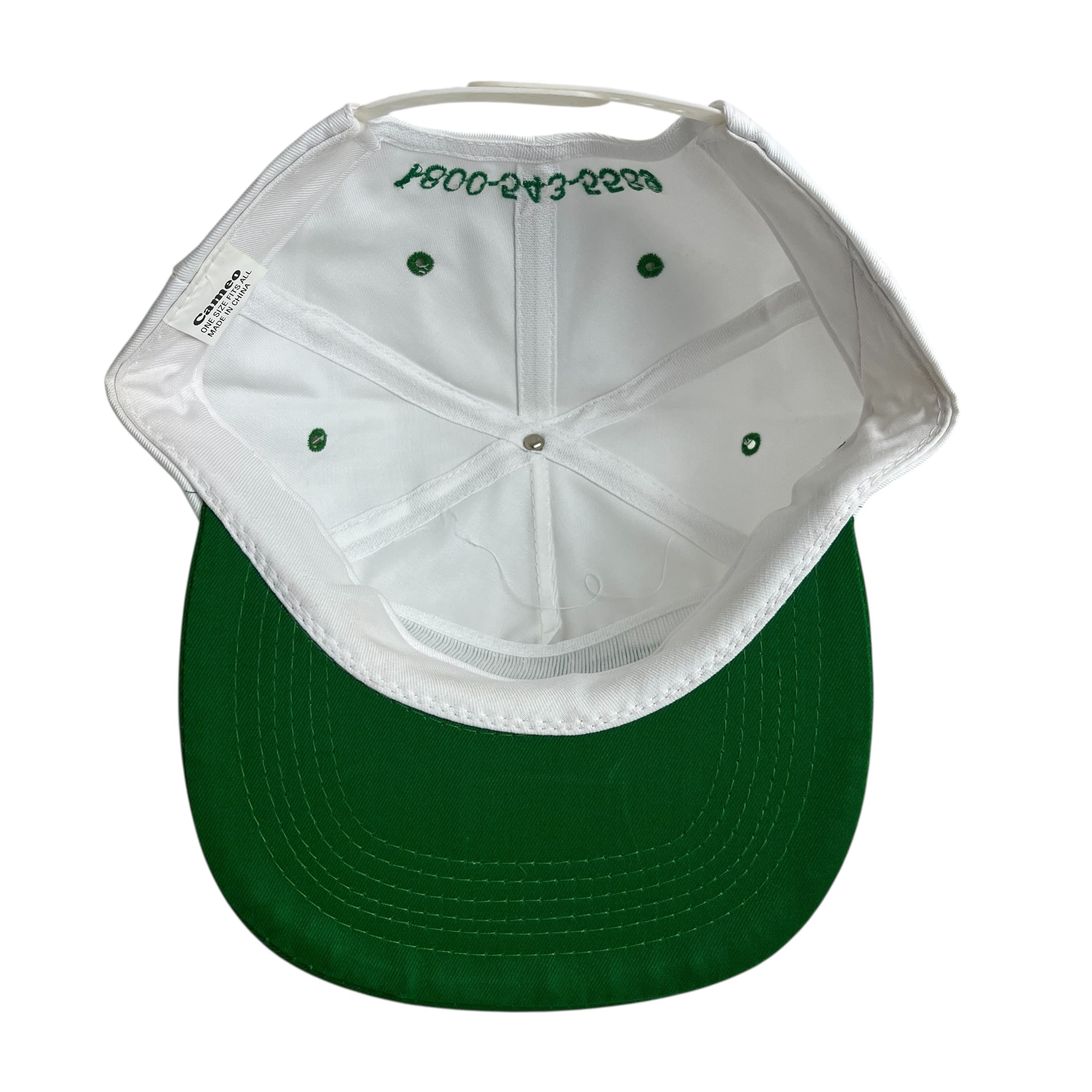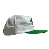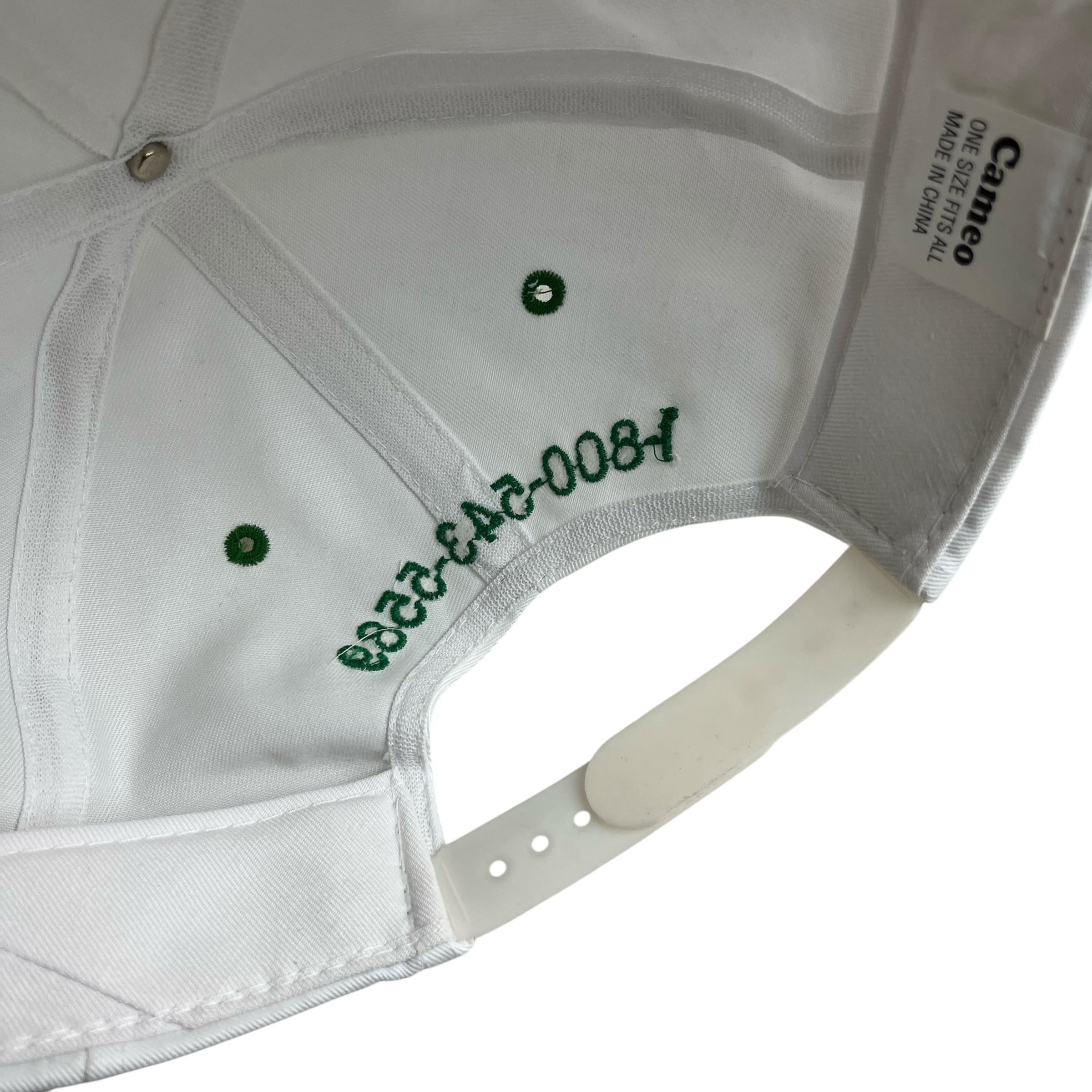 白の本体と鮮やかなグリーンのツバが特徴のツートンカラーキャップです。フロントには、緑色の糸でR+L Carriersのトラクターとトレーラーのイラスト、そして「R+L GATOR GREENWOOD」の文字が刺繍されています。これは、運送会社R+L Carriersが、特定の部署または地域(グリーンウッド)のチーム向けに使用した企業ノベルティと思われます。