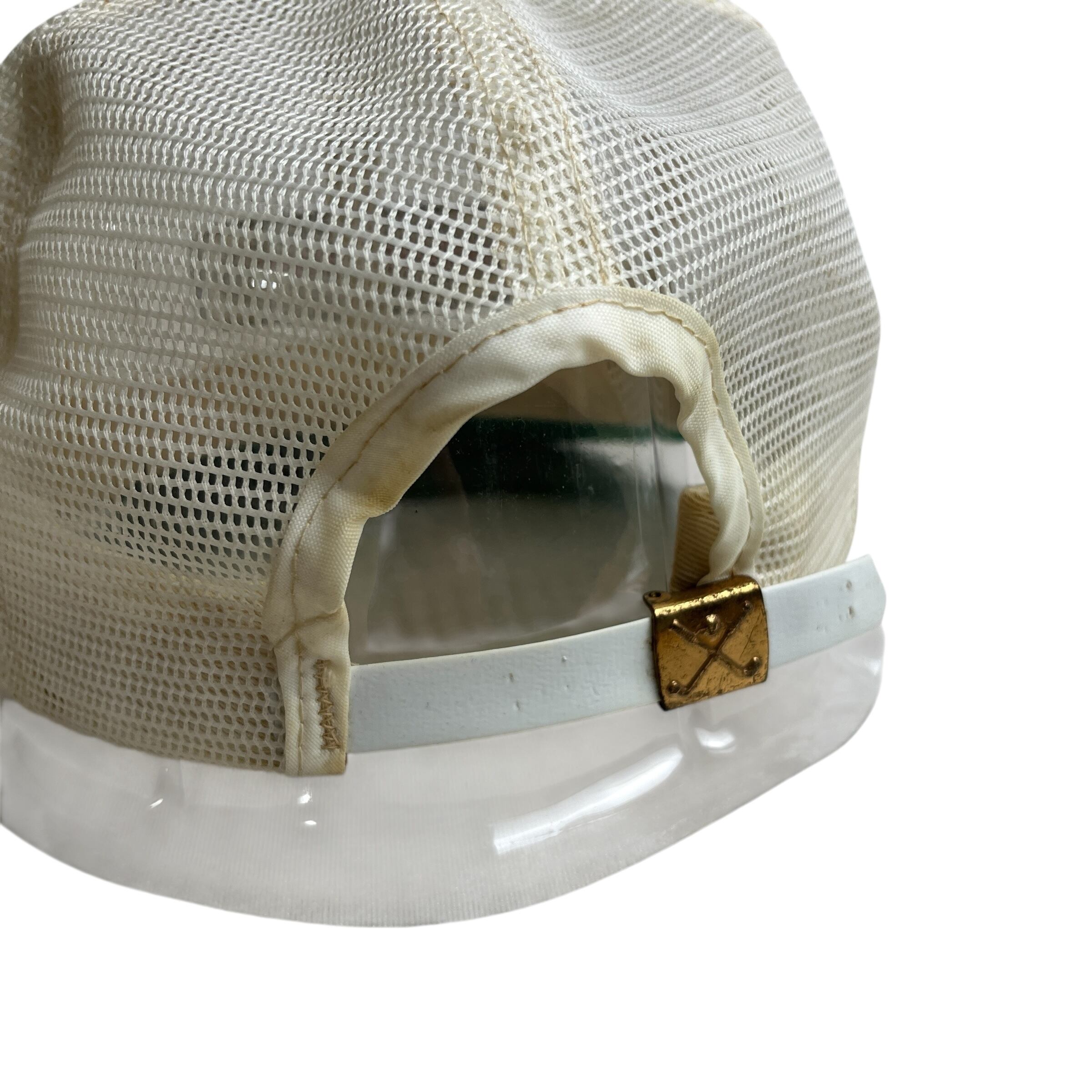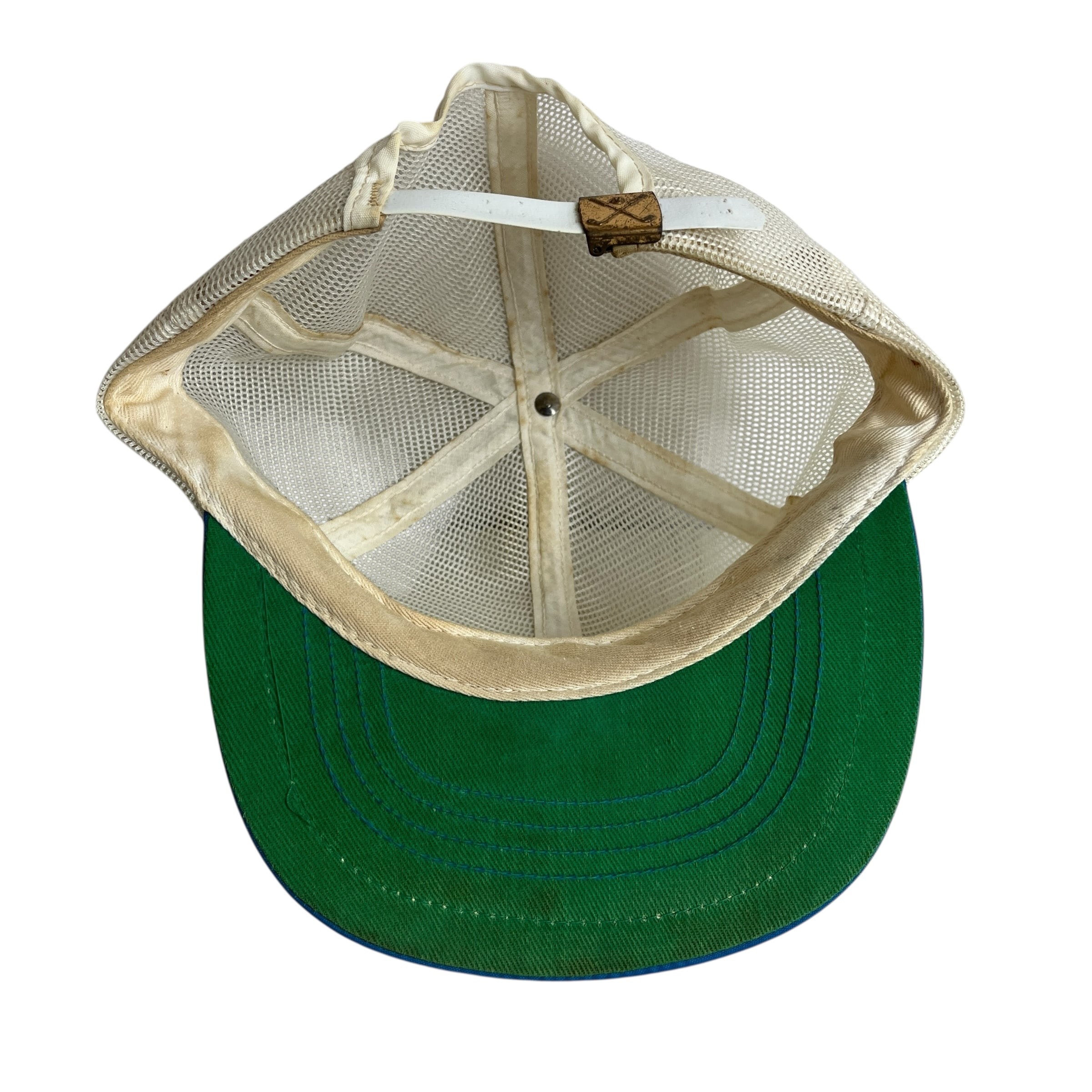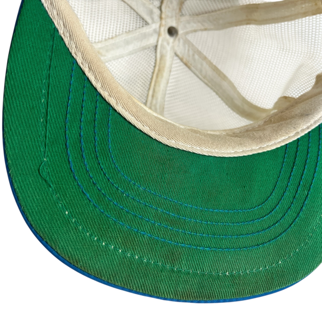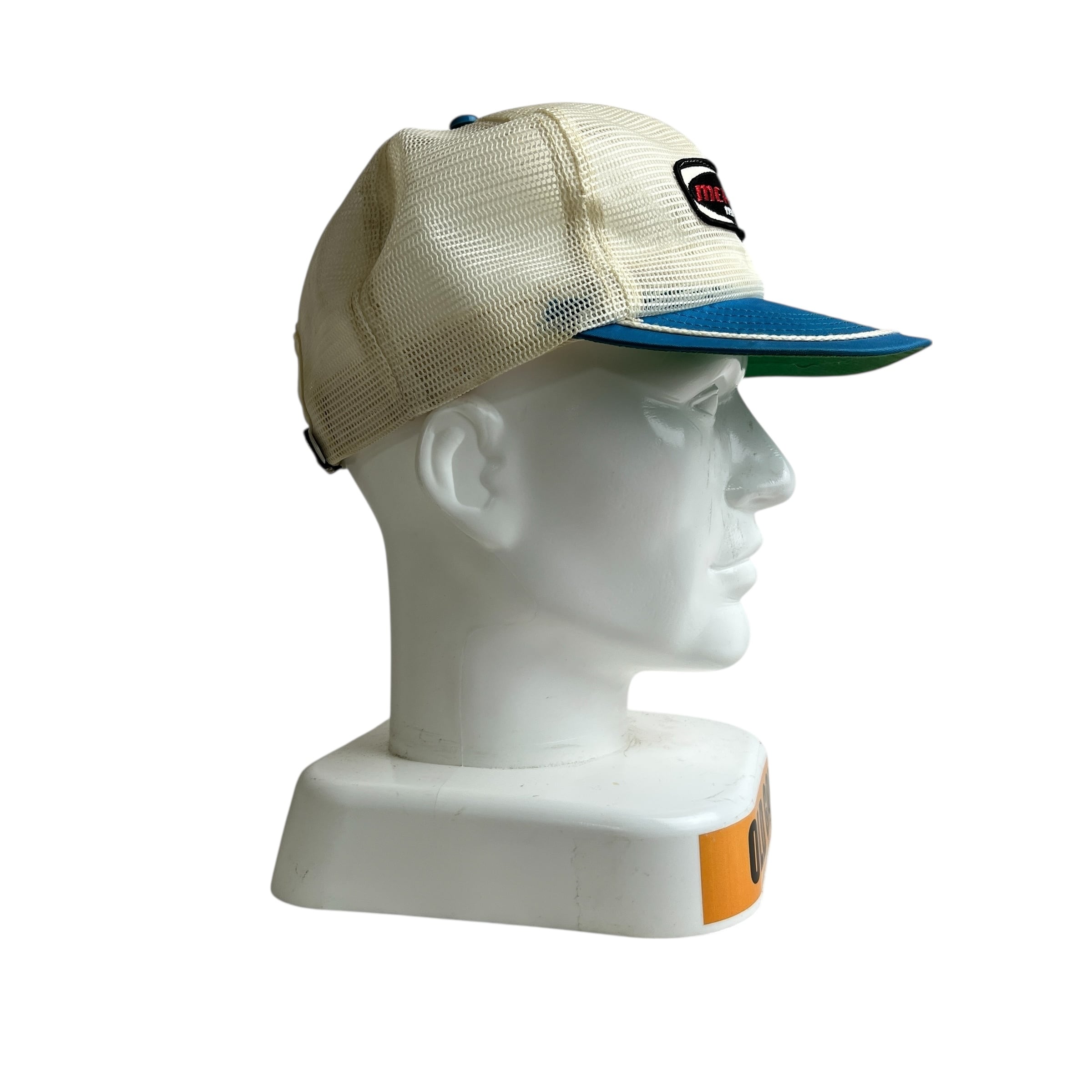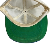 本体は通気性の良いオフホワイトのメッシュ素材、ツバは青色で裏側が緑色という、クラシックな配色のトラッカーキャップです。フロントには、船外機メーカーMERCURY MARINEのオールドロゴがワッペンで貼られています。ロゴのレトロなフォントとカラーリングが、1970年代~1980年代のビンテージな雰囲気を醸し出しています。