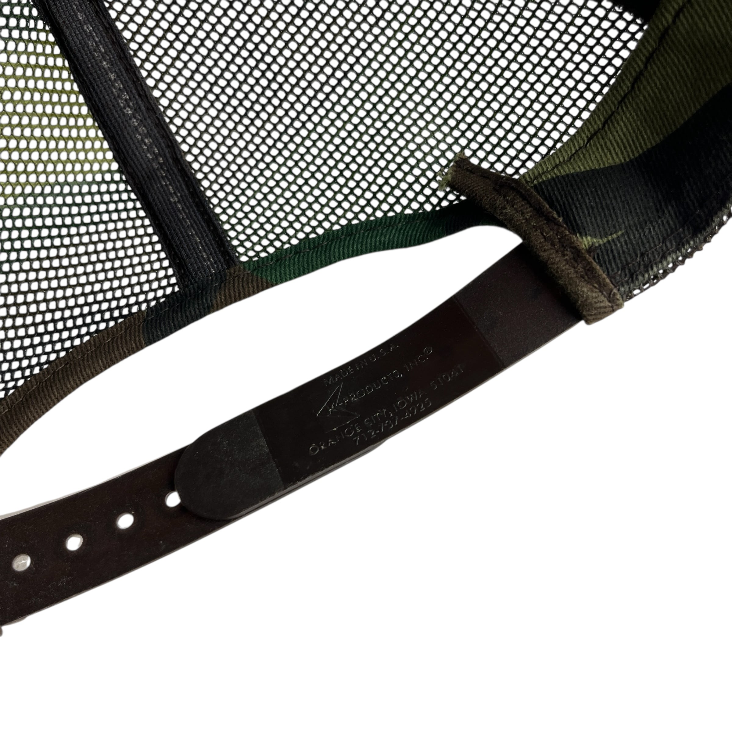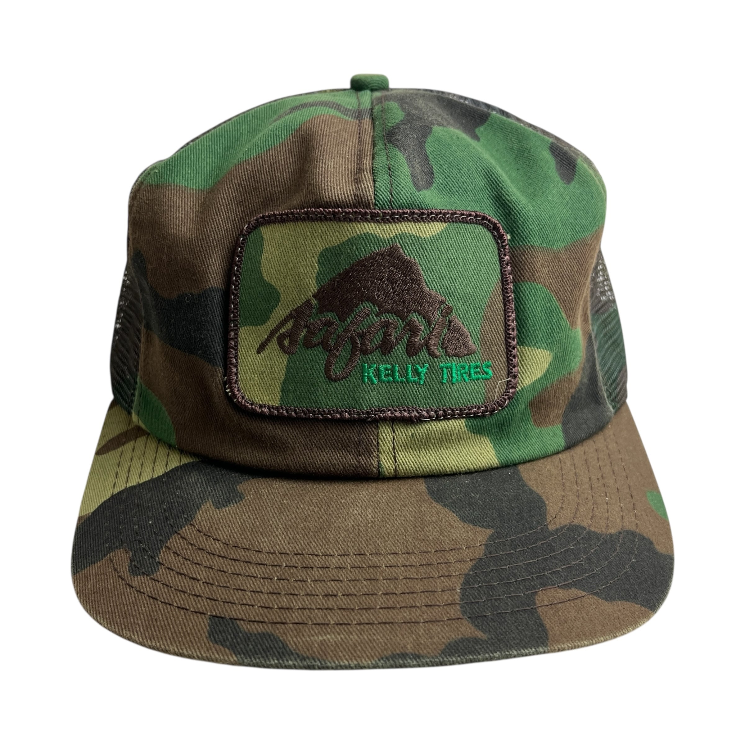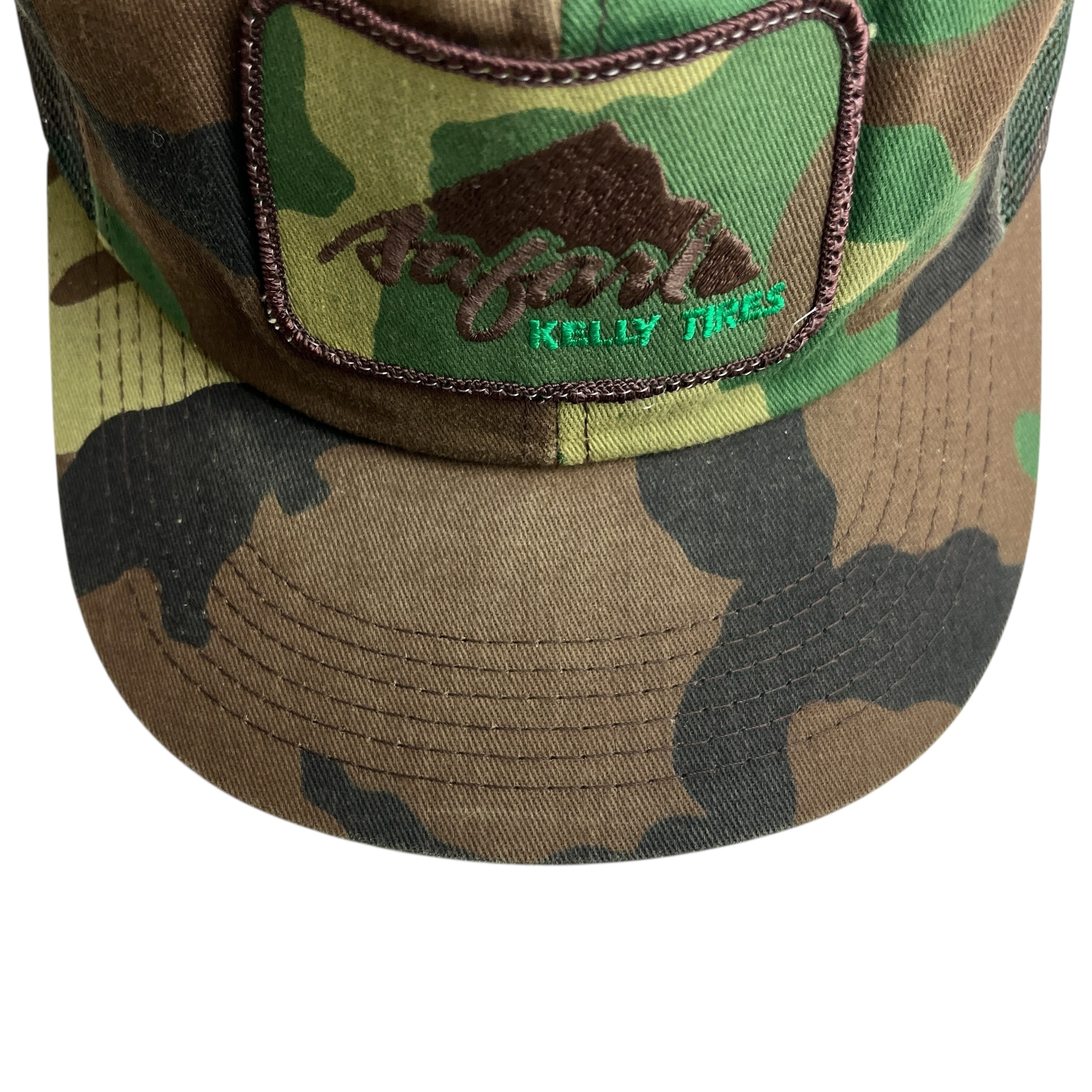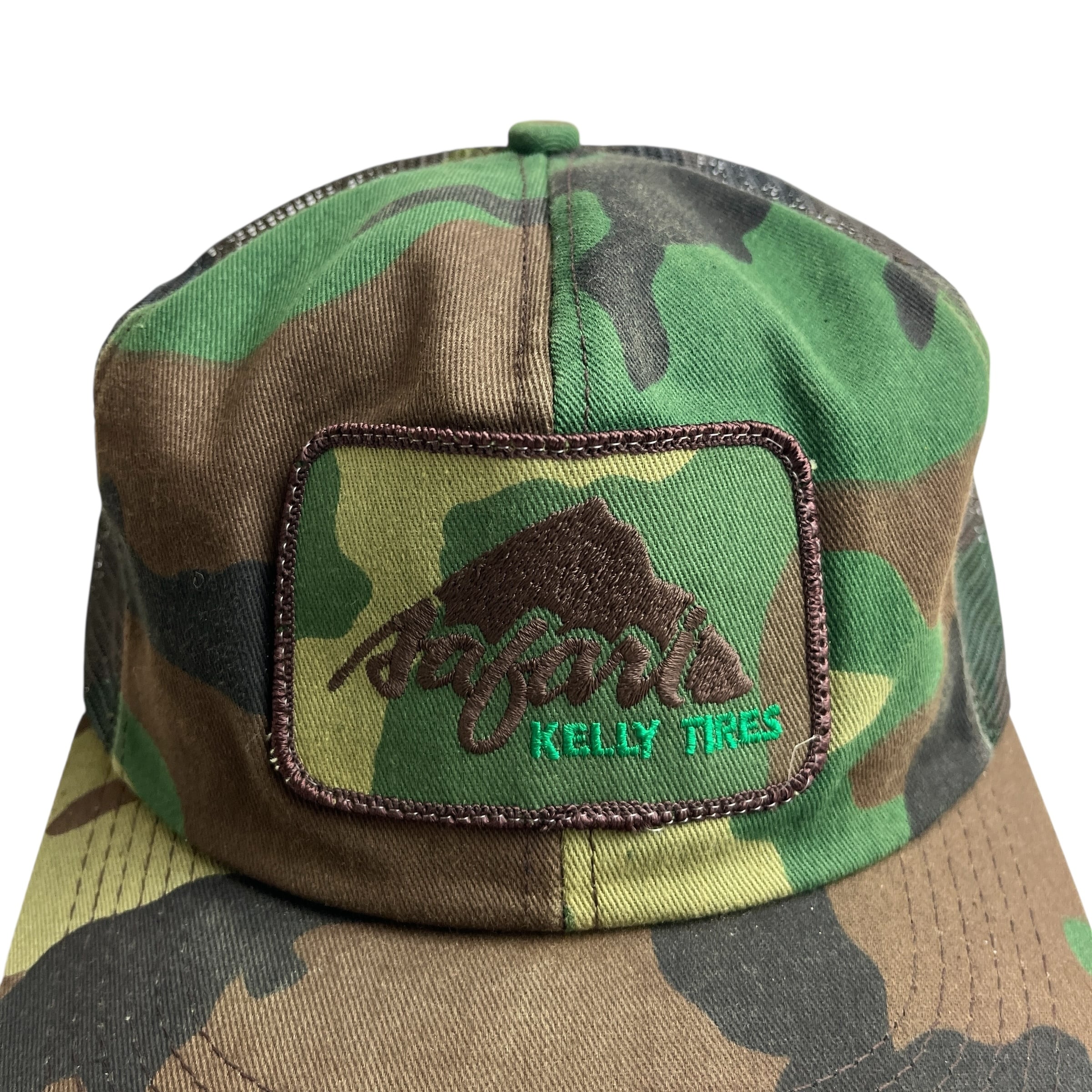 【キャップ/帽子】80-90s アメリカ製 USA製 Kelly Tires (カラータイヤーズ) ビンテージキャップ カモ柄 ワッペン 総柄 メッシュキャップ