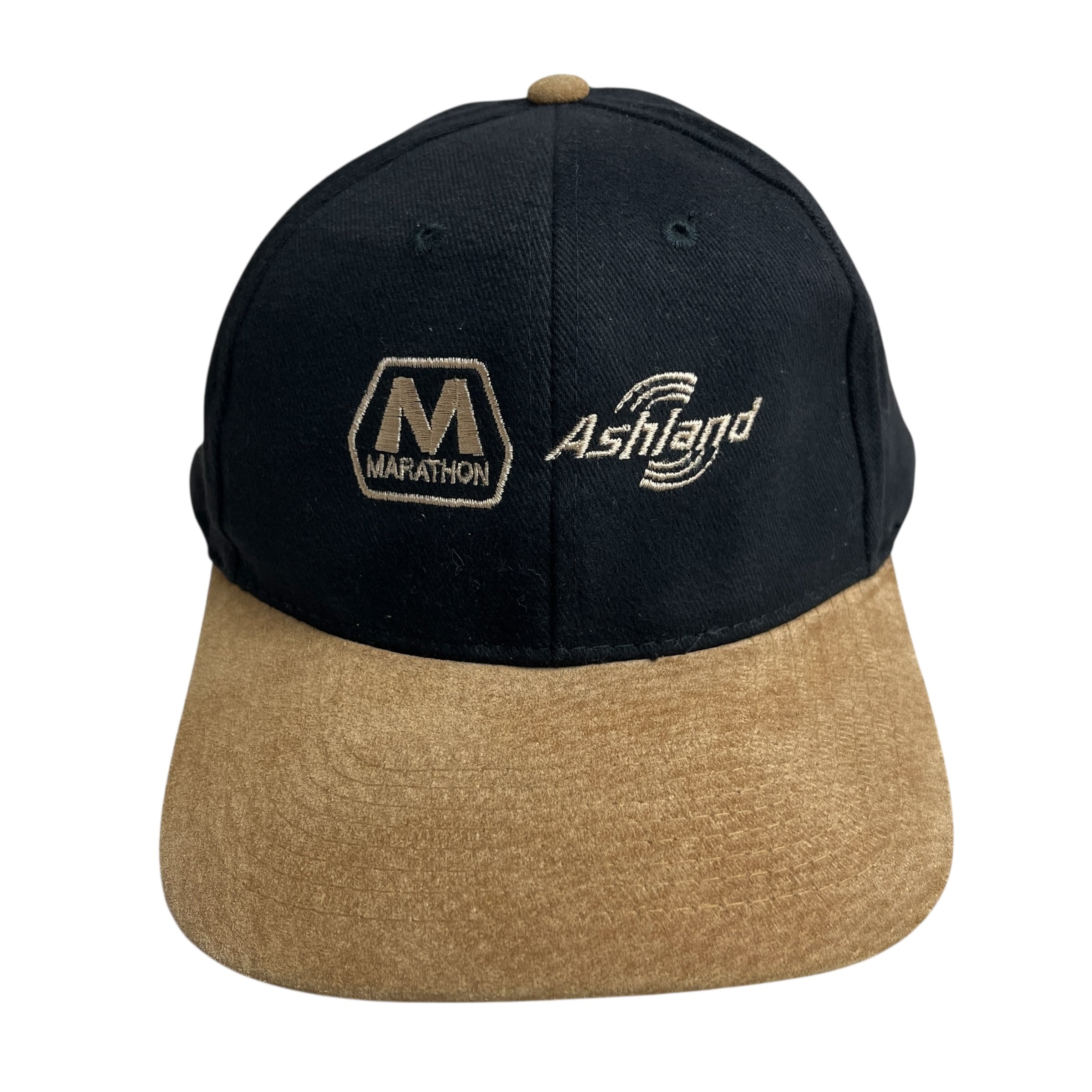 ブラックのクラウンに、スエード調のキャメルカラーのブリムを組み合わせたツートンキャップです。フロントには、石油関連企業であるMarathon(マラソン)とAshland(アッシュランド)の企業名が、繊細な刺繍であしらわれています。