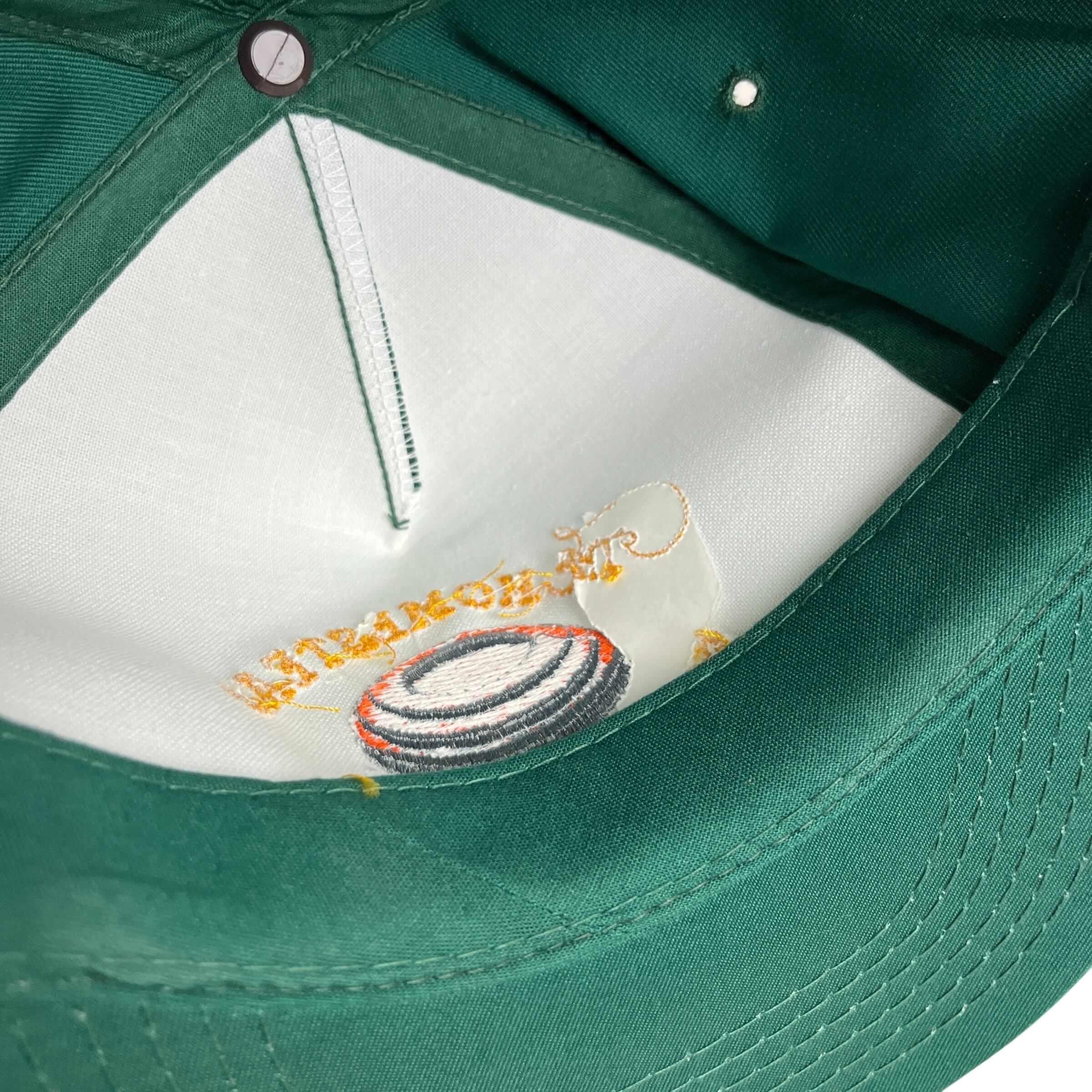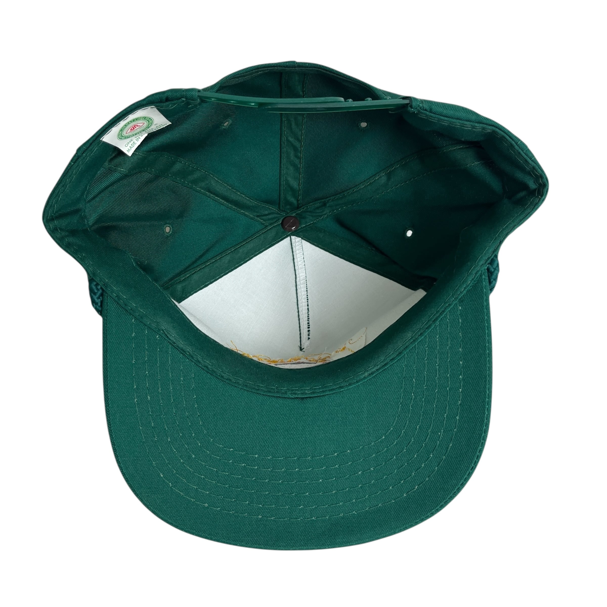 落ち着いたグリーンのボディに、オレンジとゴールドの刺繍、バイザーの付け根には同色のロープが配されたクラシックなデザインです。帽子メーカー「Young An Hat」社製で素材はコットン100%を使用しています。背面のプラスチックスナップバックでサイズ調整が可能な仕様です。リゾートアイテムらしい独特の趣と、ヴィンテージ品ならではの風合いを兼ね備えた一品です。