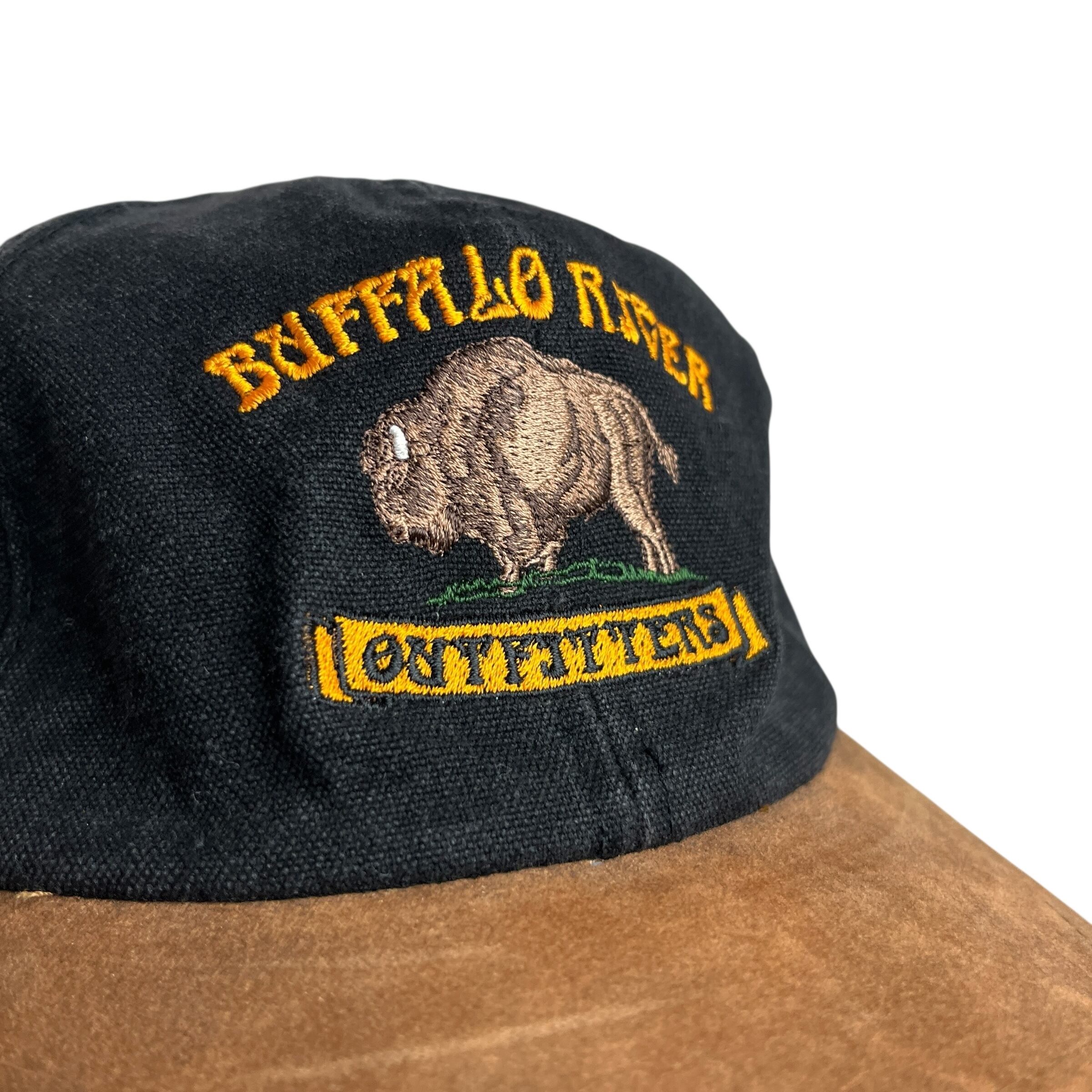 アメリカのアウトドア用品店「BUFFALO RIVER OUTFITTERS」のアドバタイジング・キャップです。ウォッシュ加工が施されたような風合いのあるブラックのクラウンに、ブラウンのバイザーを合わせたバイカラーデザインが特徴です。