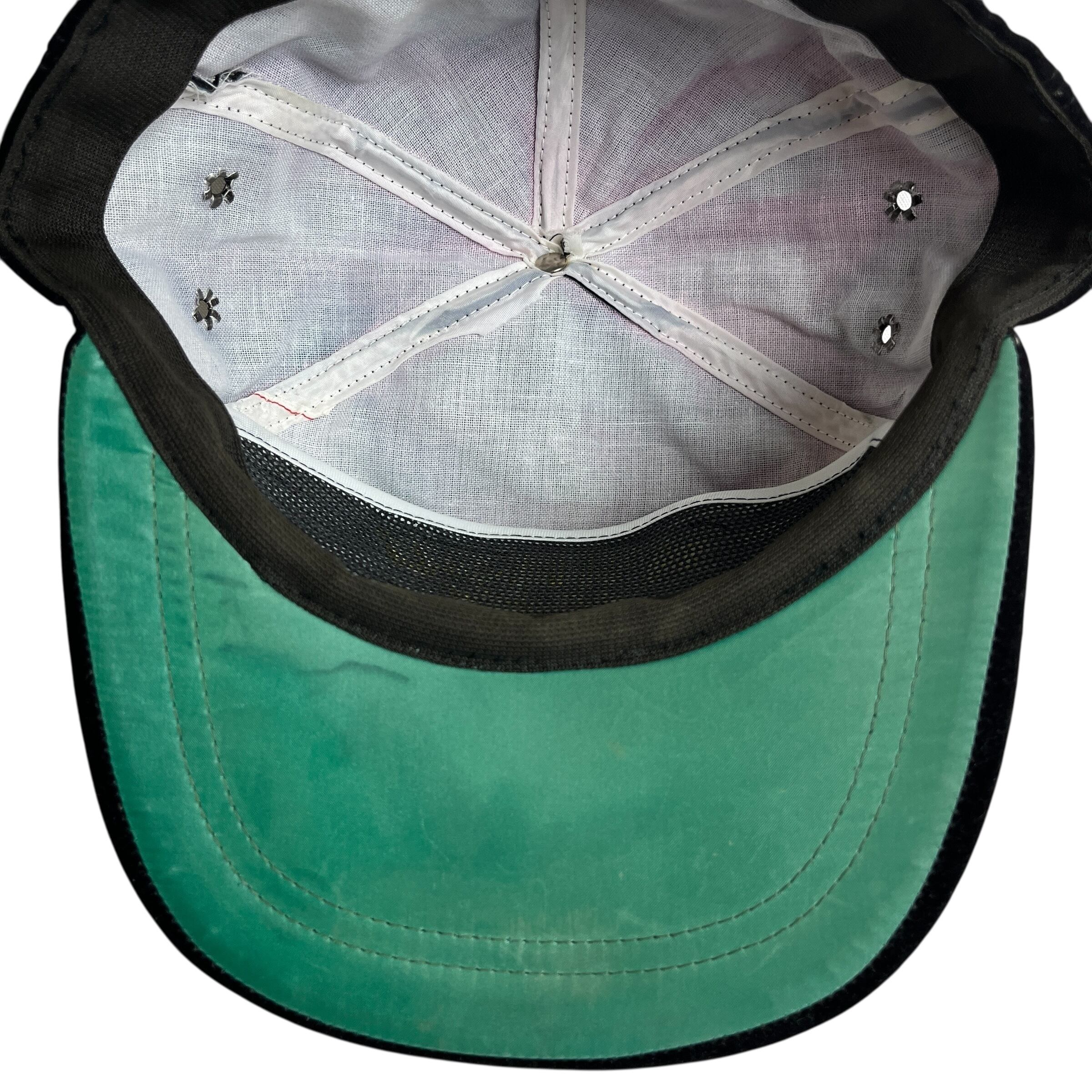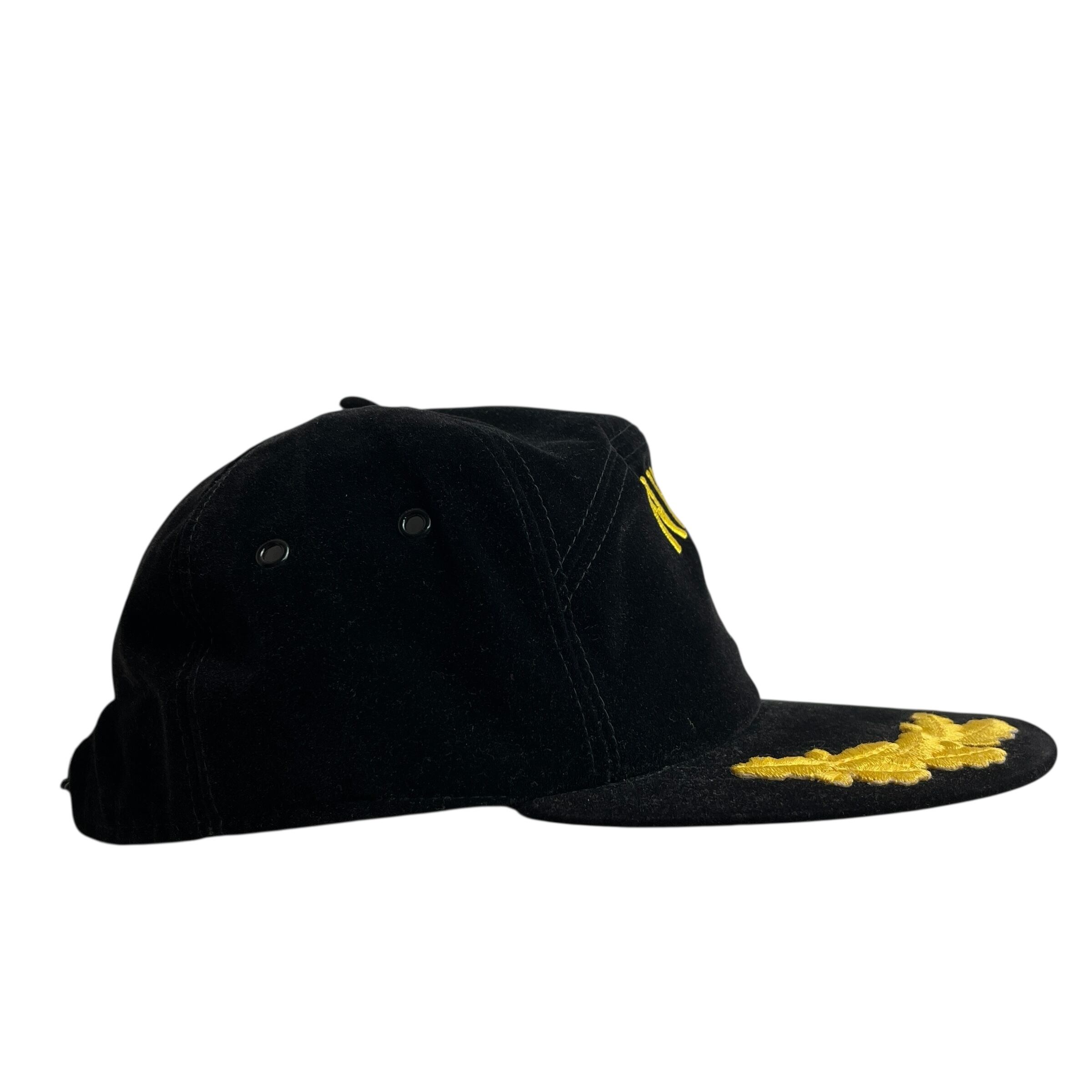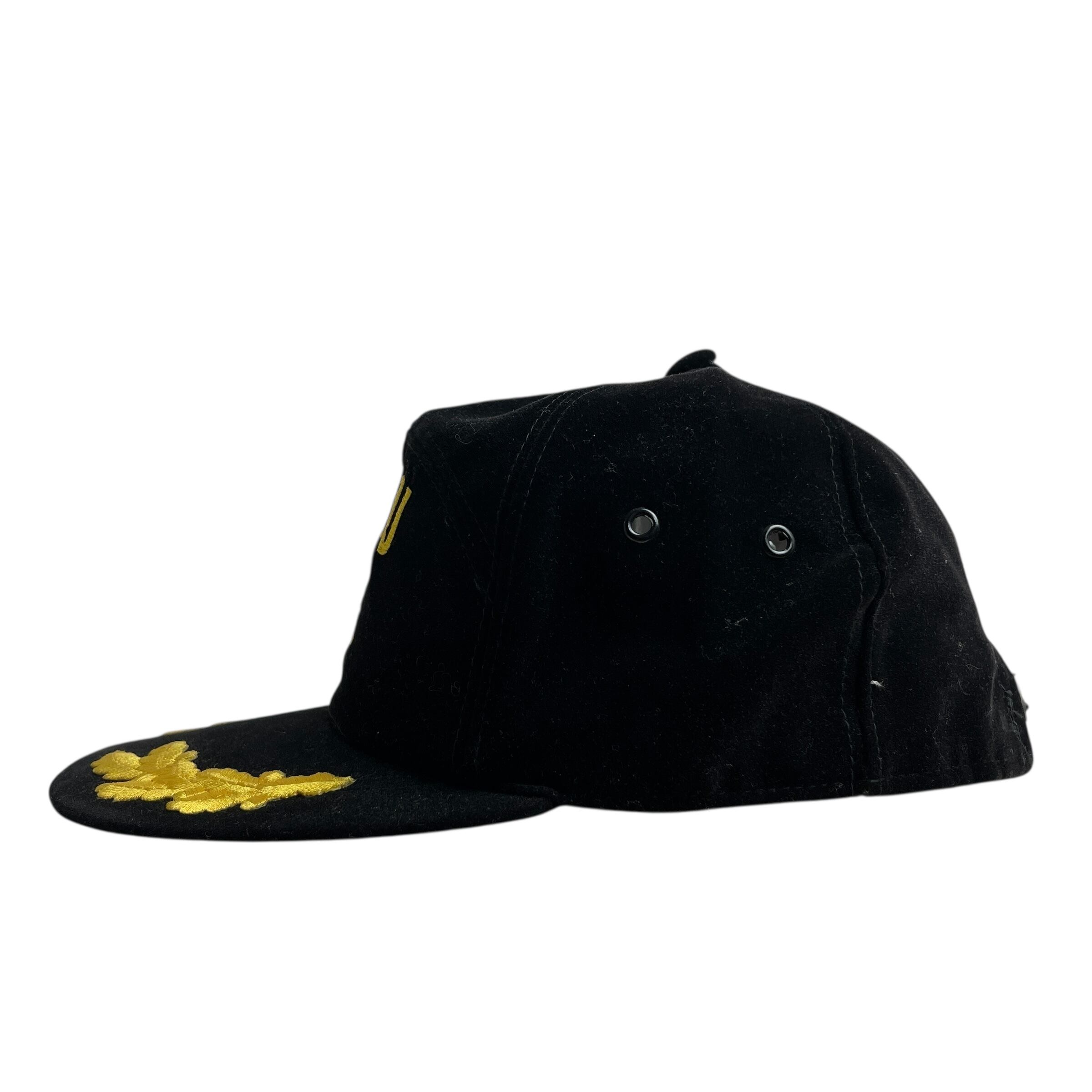 ブラックのボディに映えるイエローの豪華な刺繍が特徴で、ツバには「スクランブルエッグ」と呼ばれる将校クラスを象徴する葉の刺繍が施されています。内側はヴィンテージらしいミントグリーンのアンダーバイザー(ツバ裏)仕様。スナップバック式でサイズ調整も可能です。