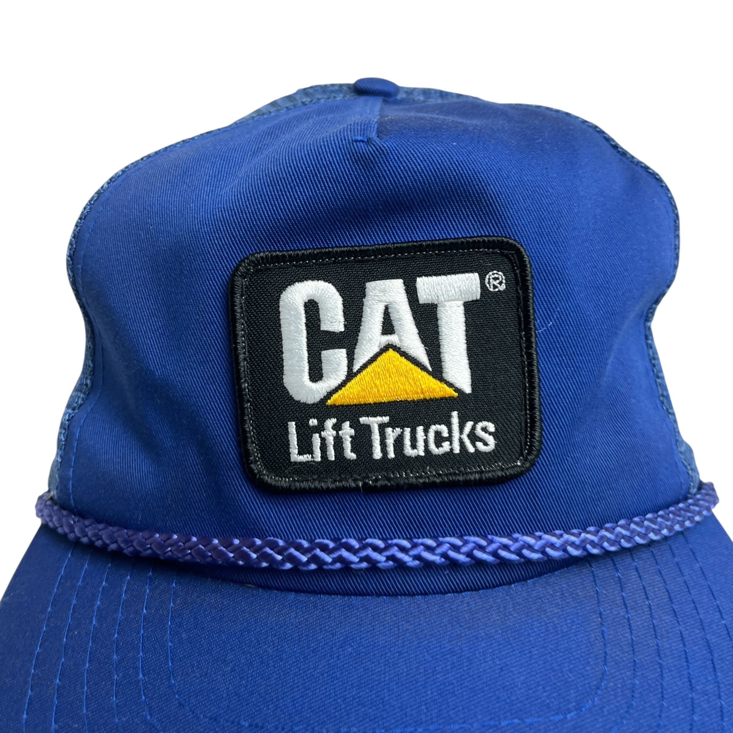 【キャップ/帽子】80-90s CAT Lift Trucks (キャタピラー) ビンテージ メッシュキャップ ワッペン 企業物 企業ロゴ ブルー 青 ブラック 黒
