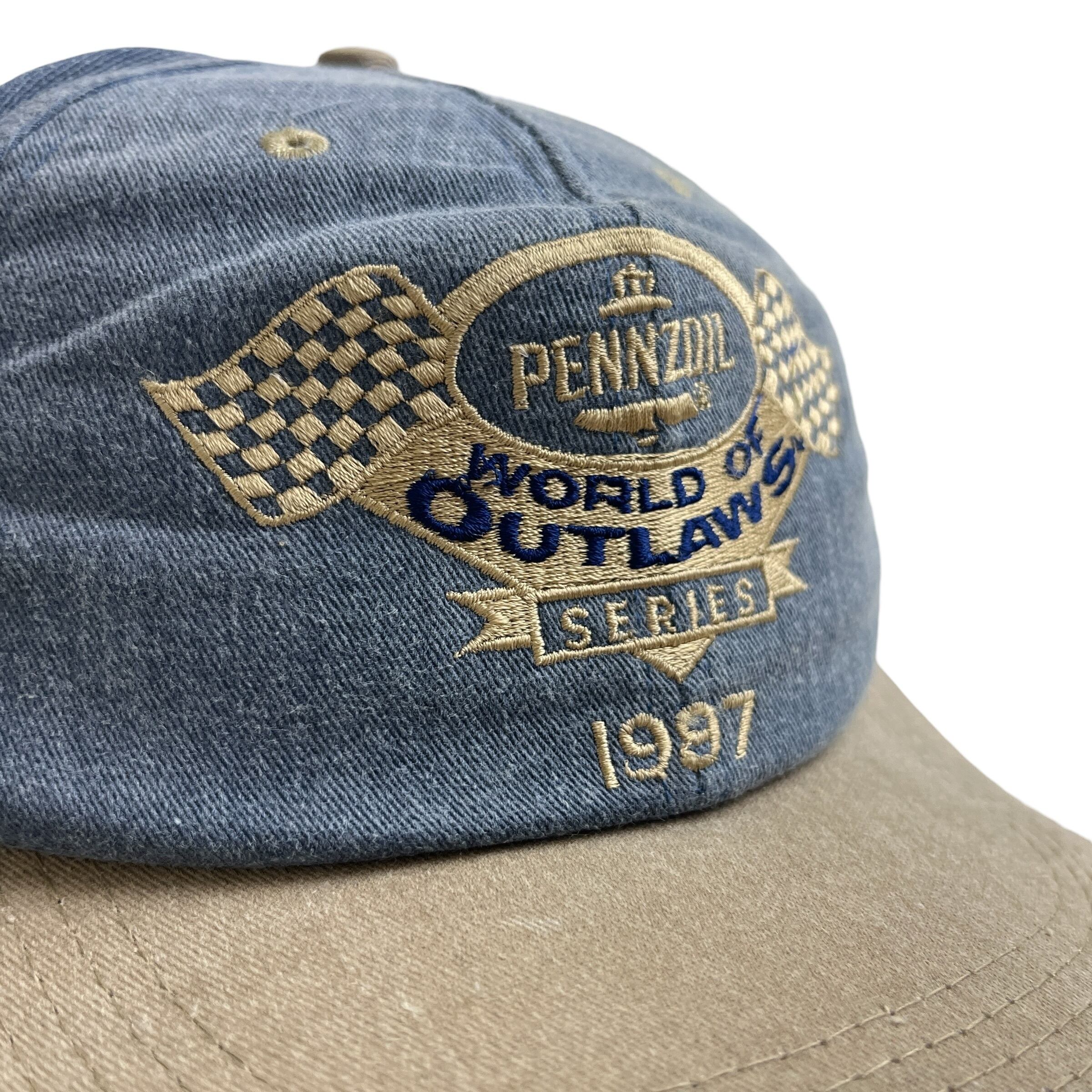 【キャップ/帽子】90s USA製 CAPS社 Pennzoil World of Outlaws (ペンゾイル) ビンテージキャップ ツートンカラー ライトブルー