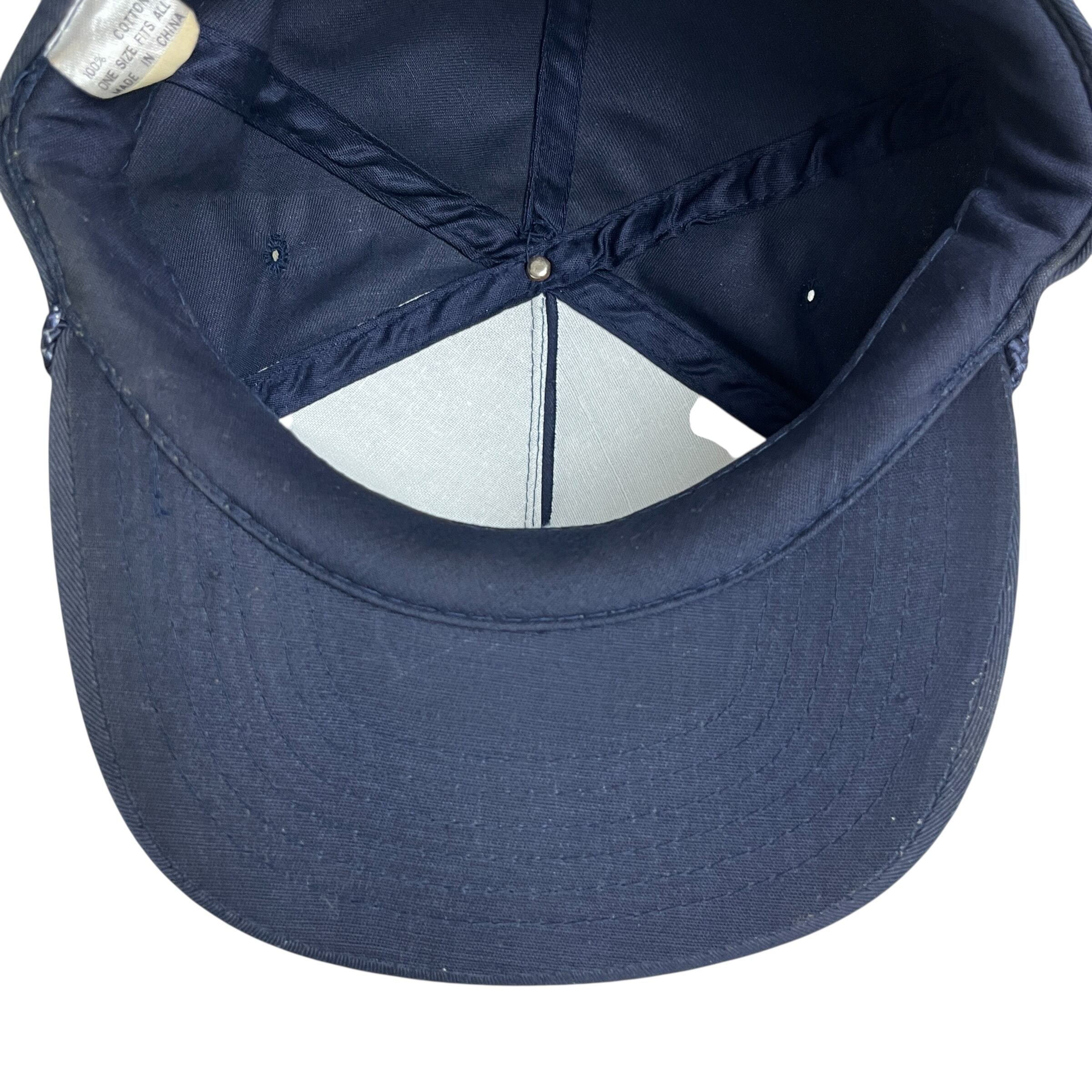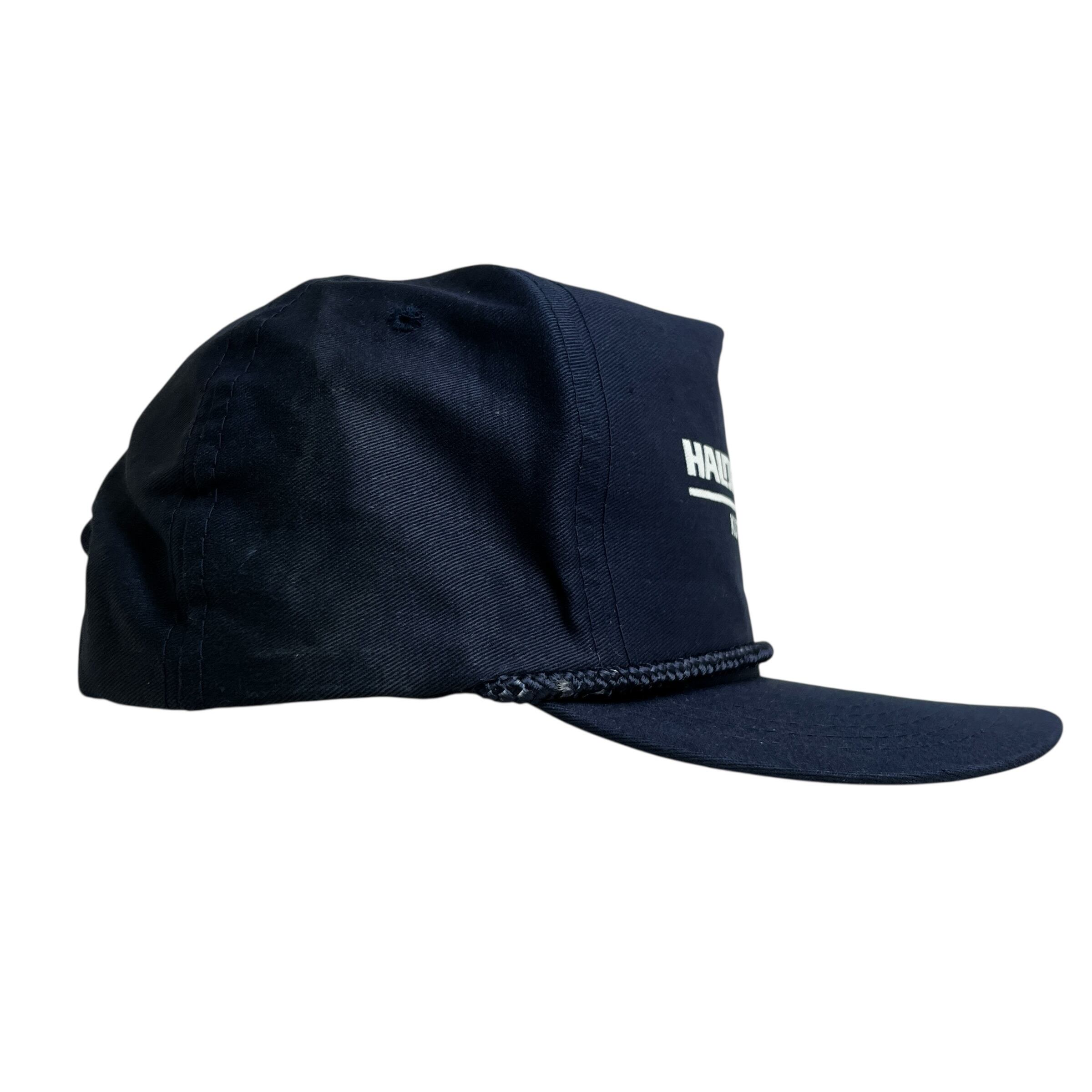 深みのあるネイビーカラーのコットンボディに、フロントには企業ロゴと地名がバランス良くプリントされており、バイザーの付け根にあしらわれた編み込みロープがクラシックなアメリカン・ワークスタイルを演出しています。当時のディーラーでノベルティとして配られていたと思われる非売品ならではの佇まいで、現行品にはない使い込まれたような風合いが魅力の一品です。