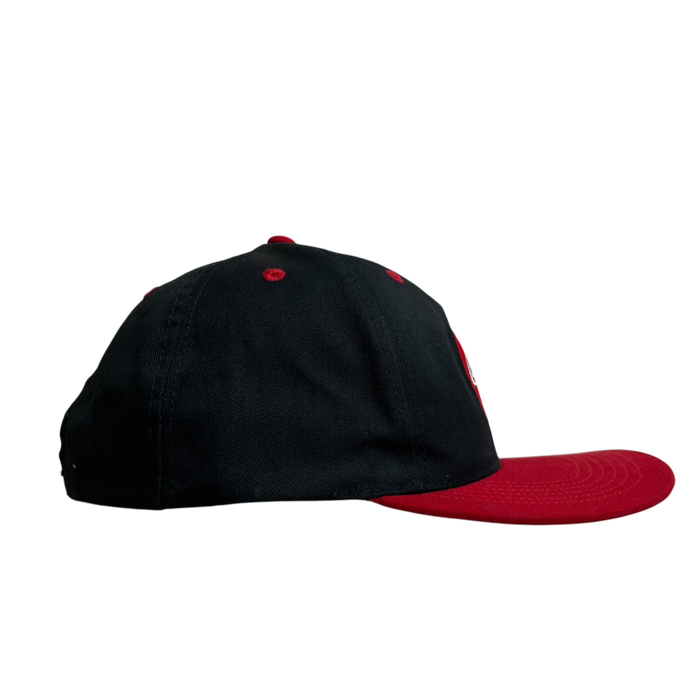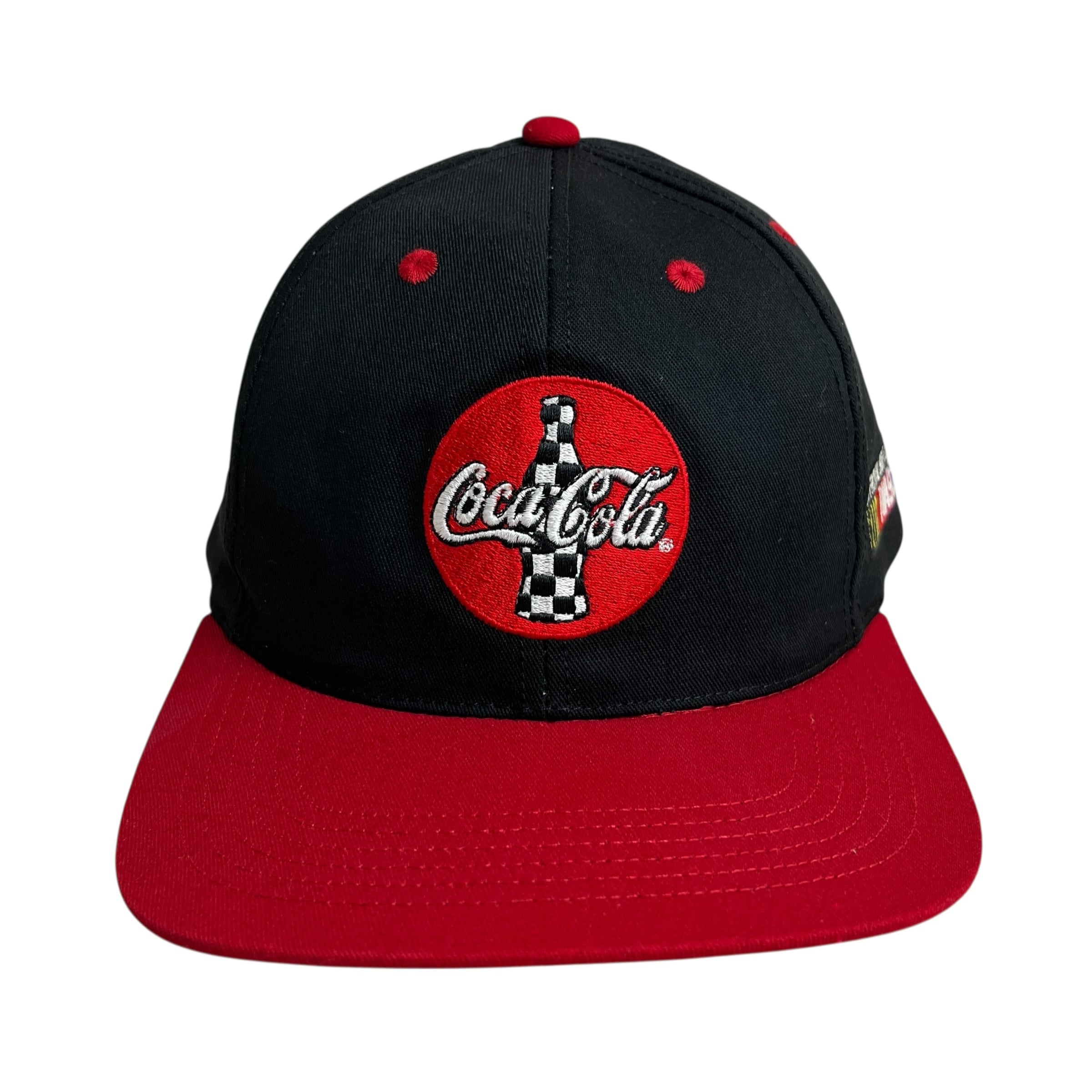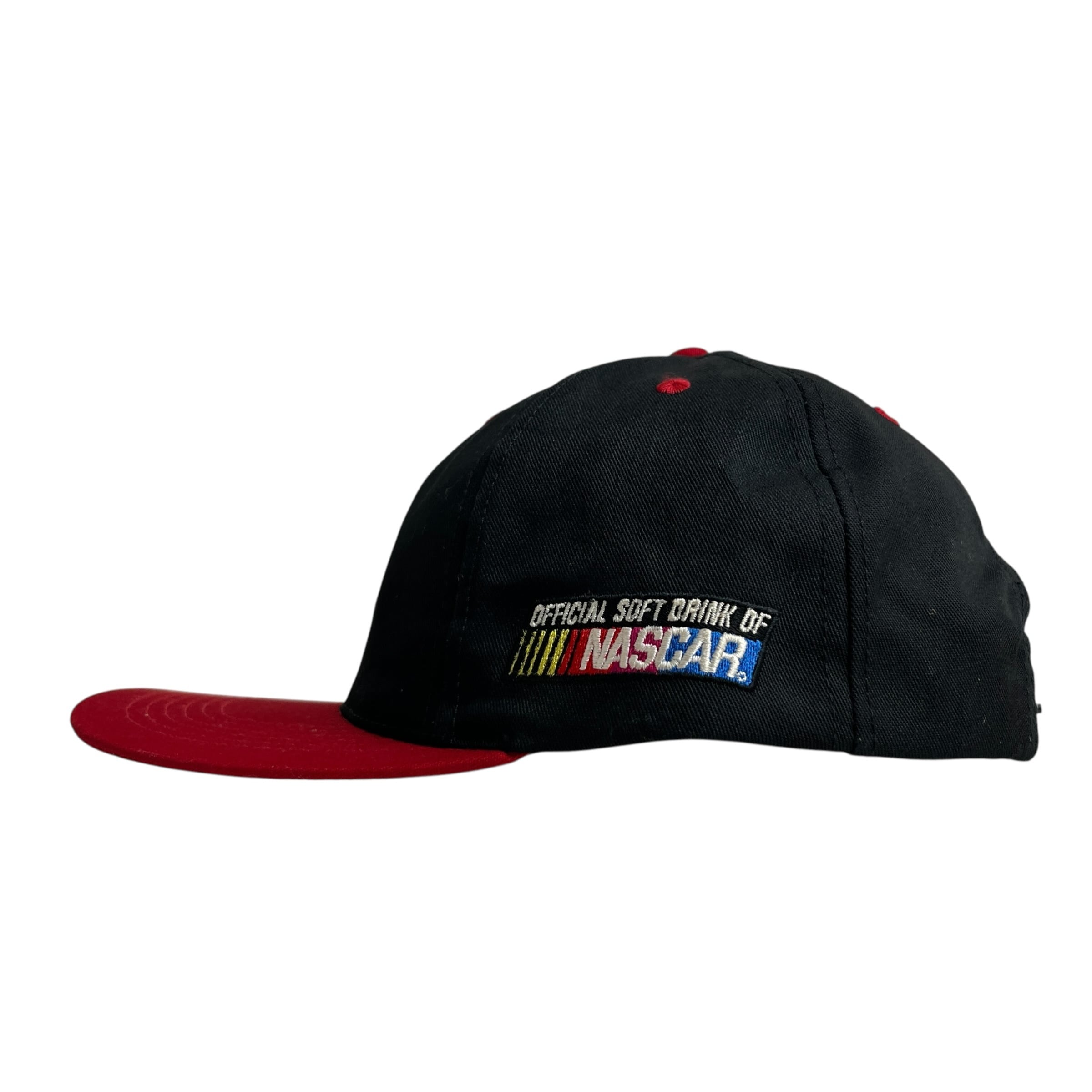 ブラックのボディに鮮やかなレッドのバイザーを組み合わせた2トーンカラーが目を惹き、フロントにはチェッカーフラッグ柄のボトルが描かれたクラシックなロゴワッペンが贅沢に施されています。サイドには「OFFICIAL SOFT DRINK OF NASCAR」の公式刺繍が入っており、当時のモータースポーツ文化とアメリカを象徴する飲料ブランドが融合した、非常にコレクタブルなデザインが魅力です。