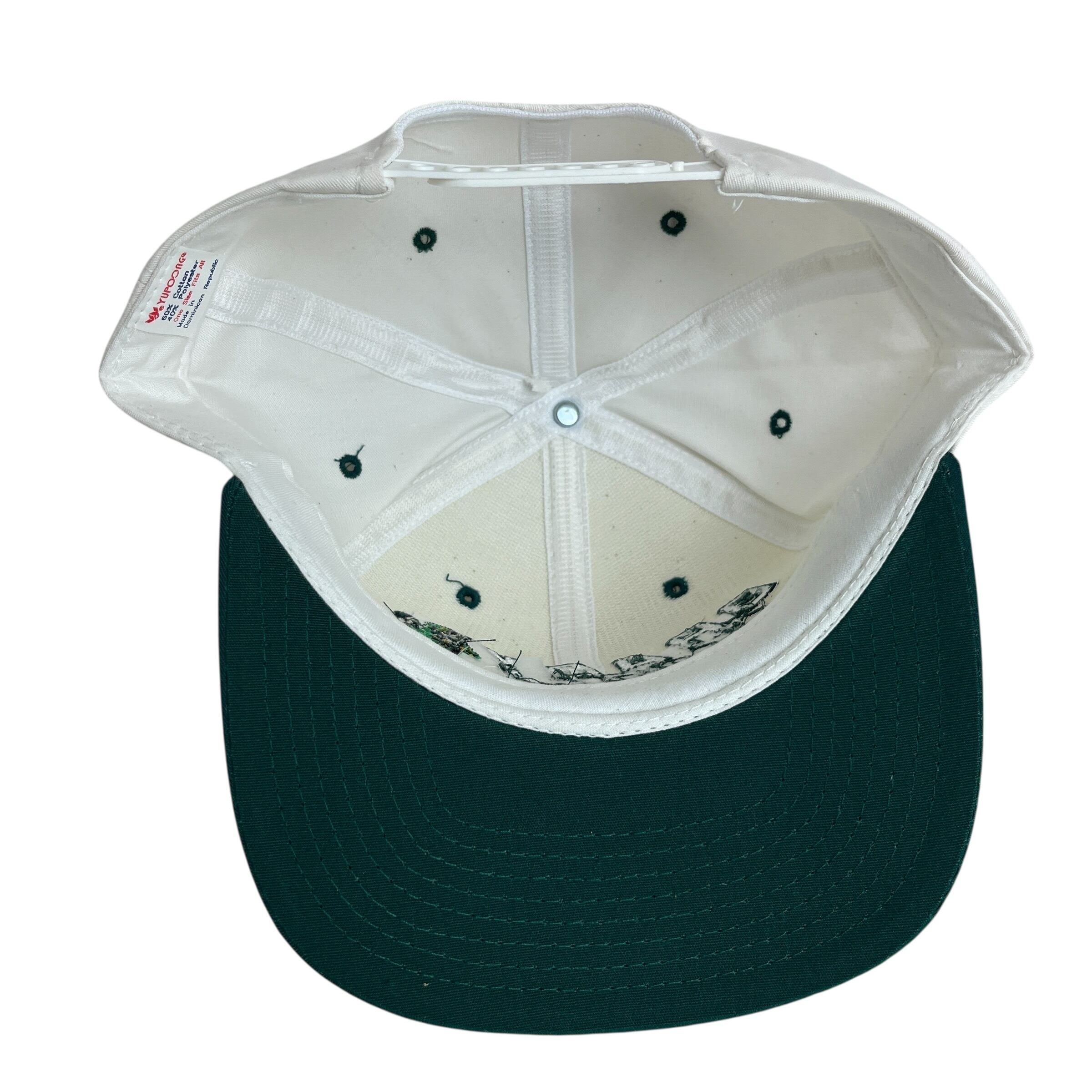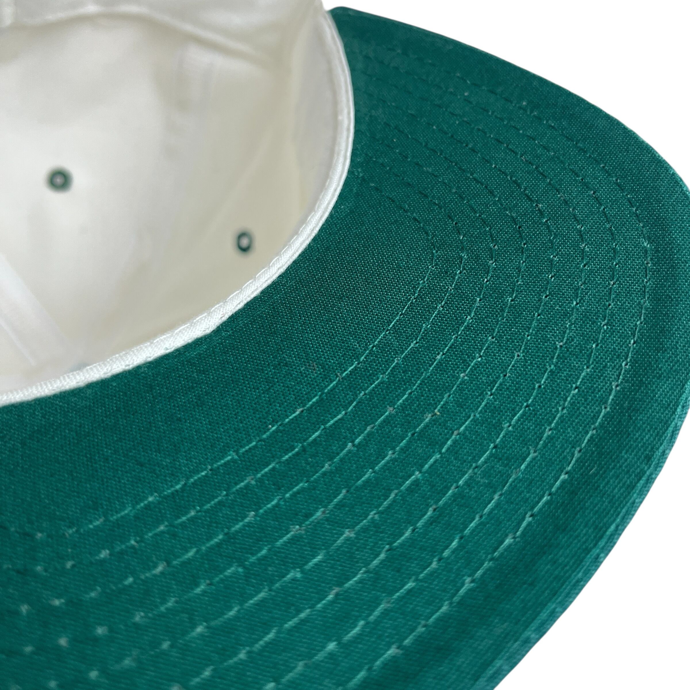 白と緑のクラシックなツートンカラーに、レトロなレプラコーンのキャラクター刺繍が目を引く、いかにもアメリカのローカルワークウェアらしい一品です。ボディは信頼のYupoong製で、ドミニカ共和国製の希少なオールドタグが残っています。適度な使用感はありますが、古着ならではの風合いが魅力で、アメカジやストリートスタイルのアクセントに最適です。