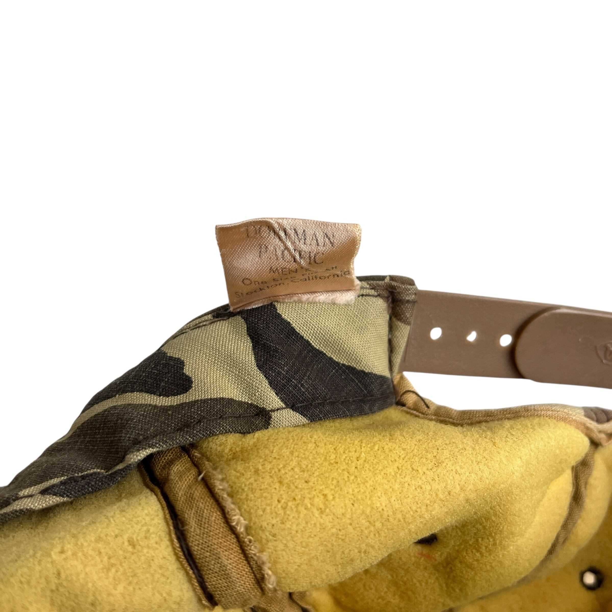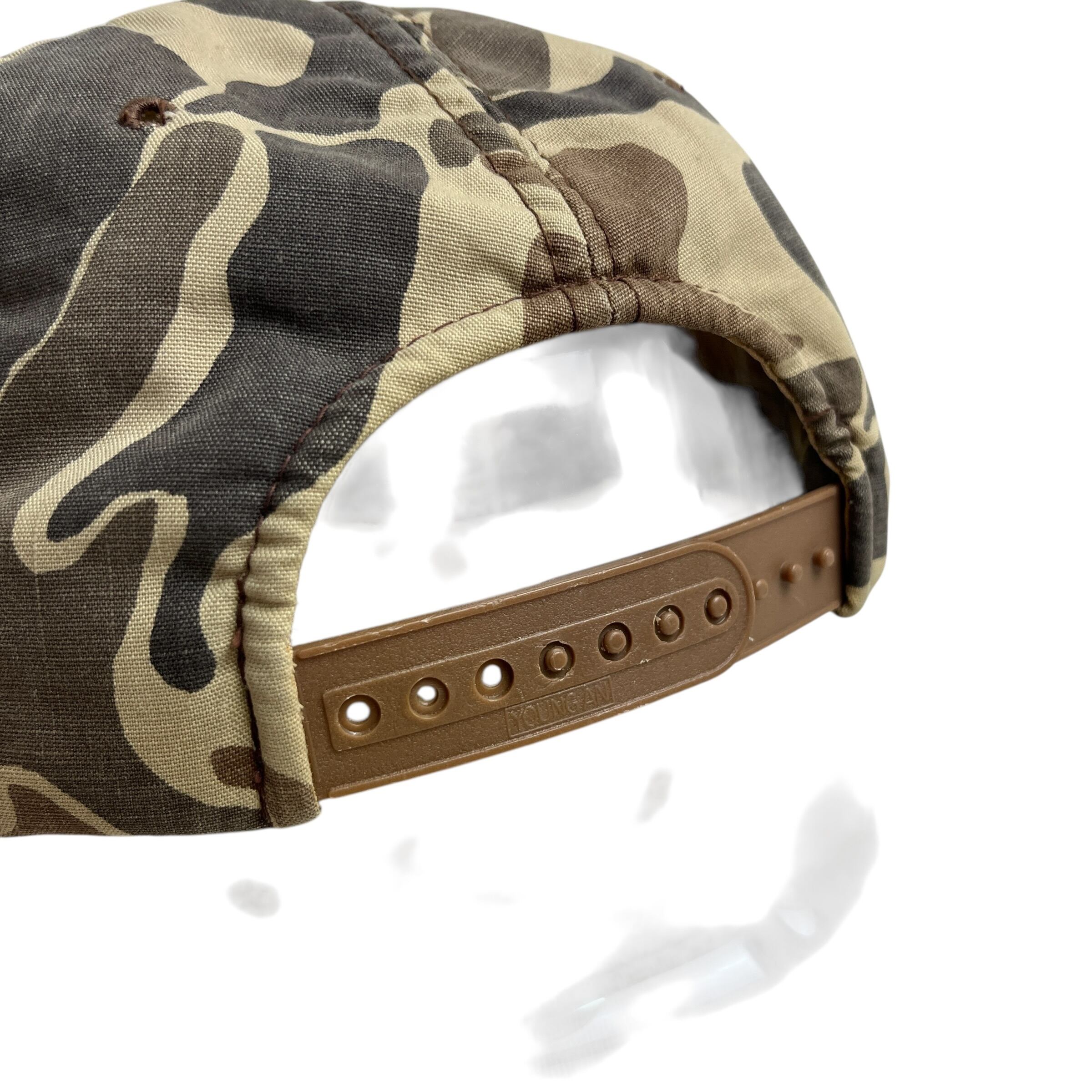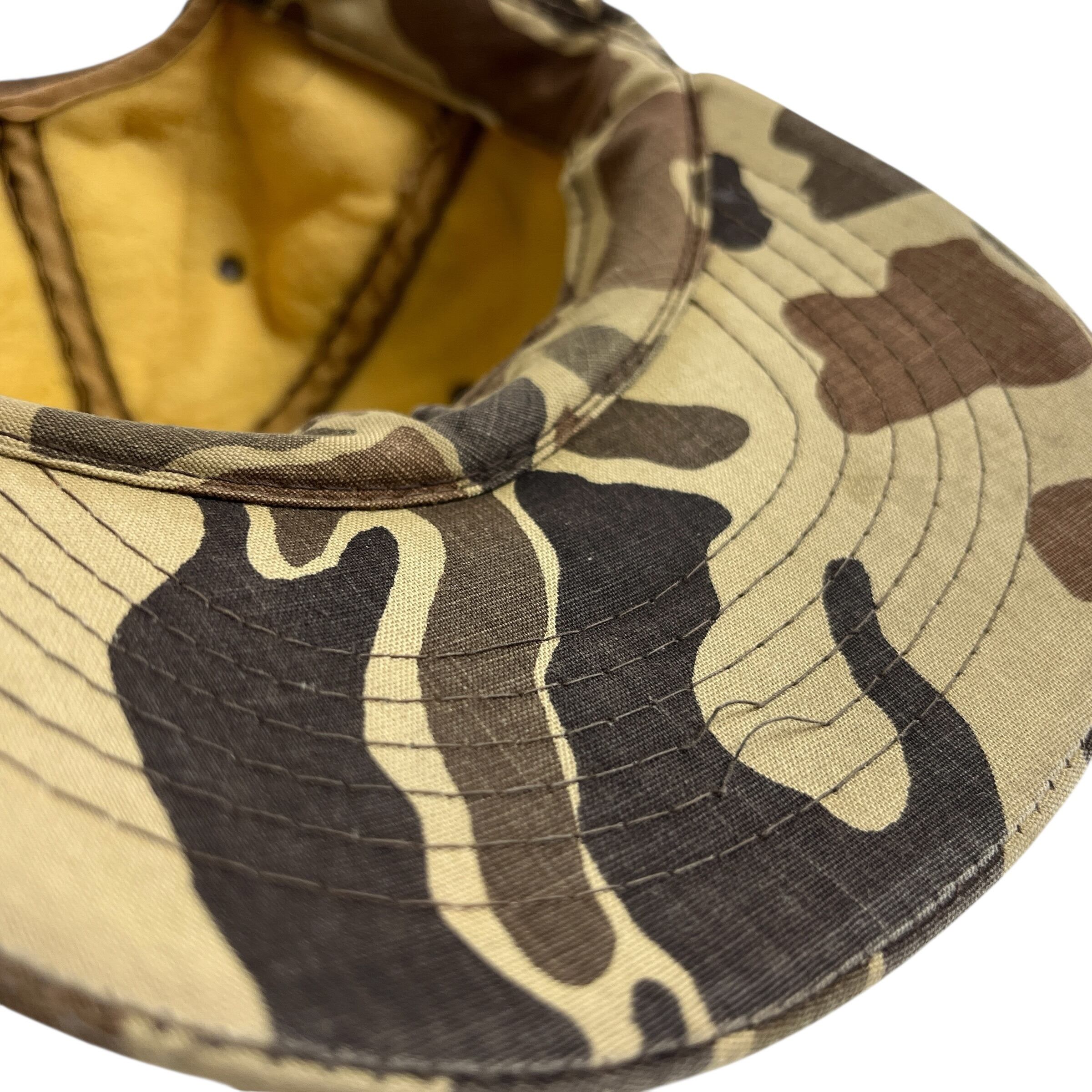 ボディにはヴィンテージハンティングウェアの代名詞である「ダックハンターカモ(フロッグスキンカモ)」を採用。落ち着いたベージュトーンのパネルに、カモフラージュ柄のバイザーが映える絶妙なコントラストが魅力です。アウトドアシーンはもちろん、アメカジやストリートスタイルの外しのアイテムとしても非常に存在感があり、当時のハンティング文化の空気感をそのままに楽しめる一点です。