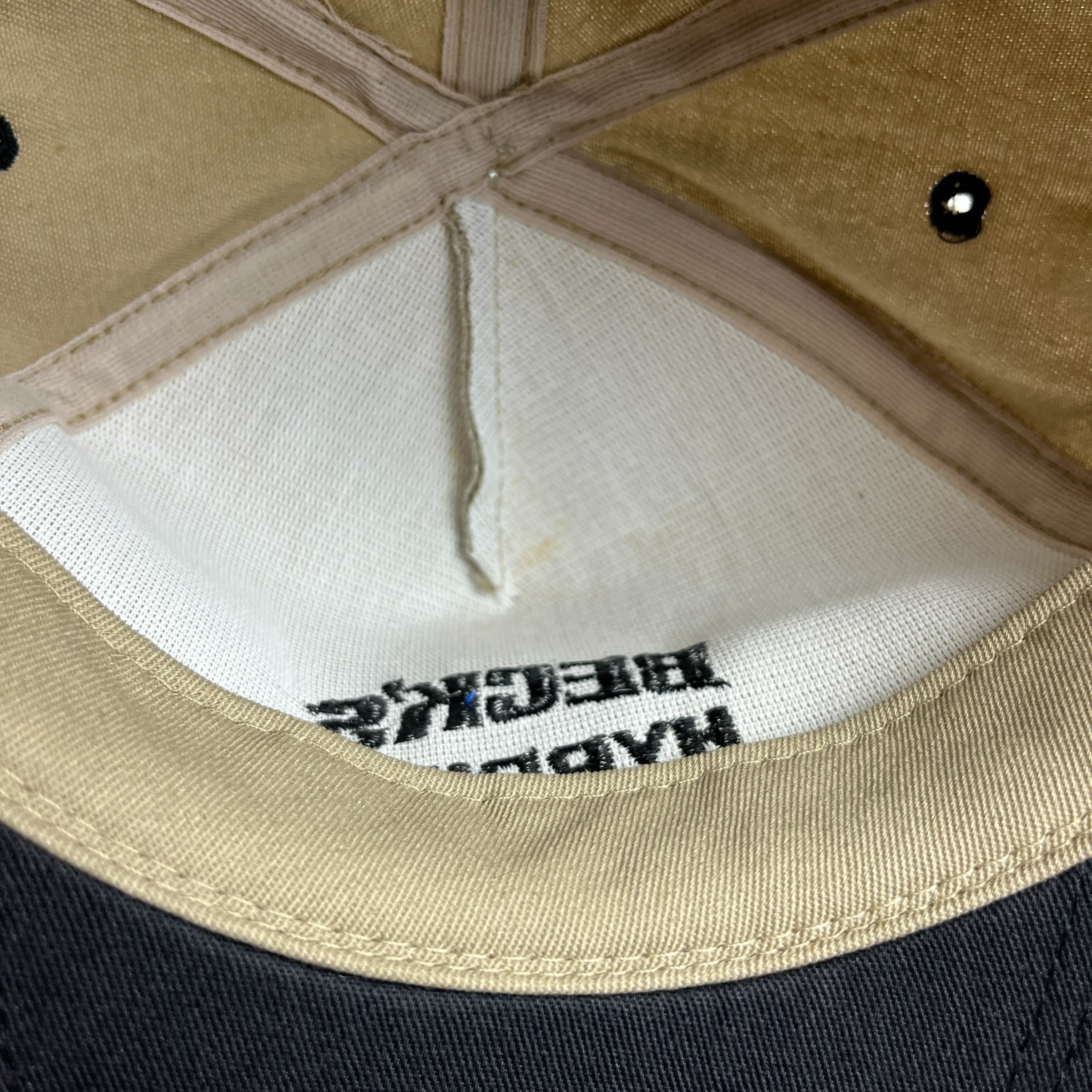 背面には「22 SERIES」や「Farm with a Winner」の文字とともに、チェッカーフラッグが配されています。アジャスター部分には「Legend」の刻印があり、希少なアメリカ製(Made in U.S.A.)です。その作りから1990年代頃のもので間違いなく、ベージュとブラックのバイカラーが渋い一品です。