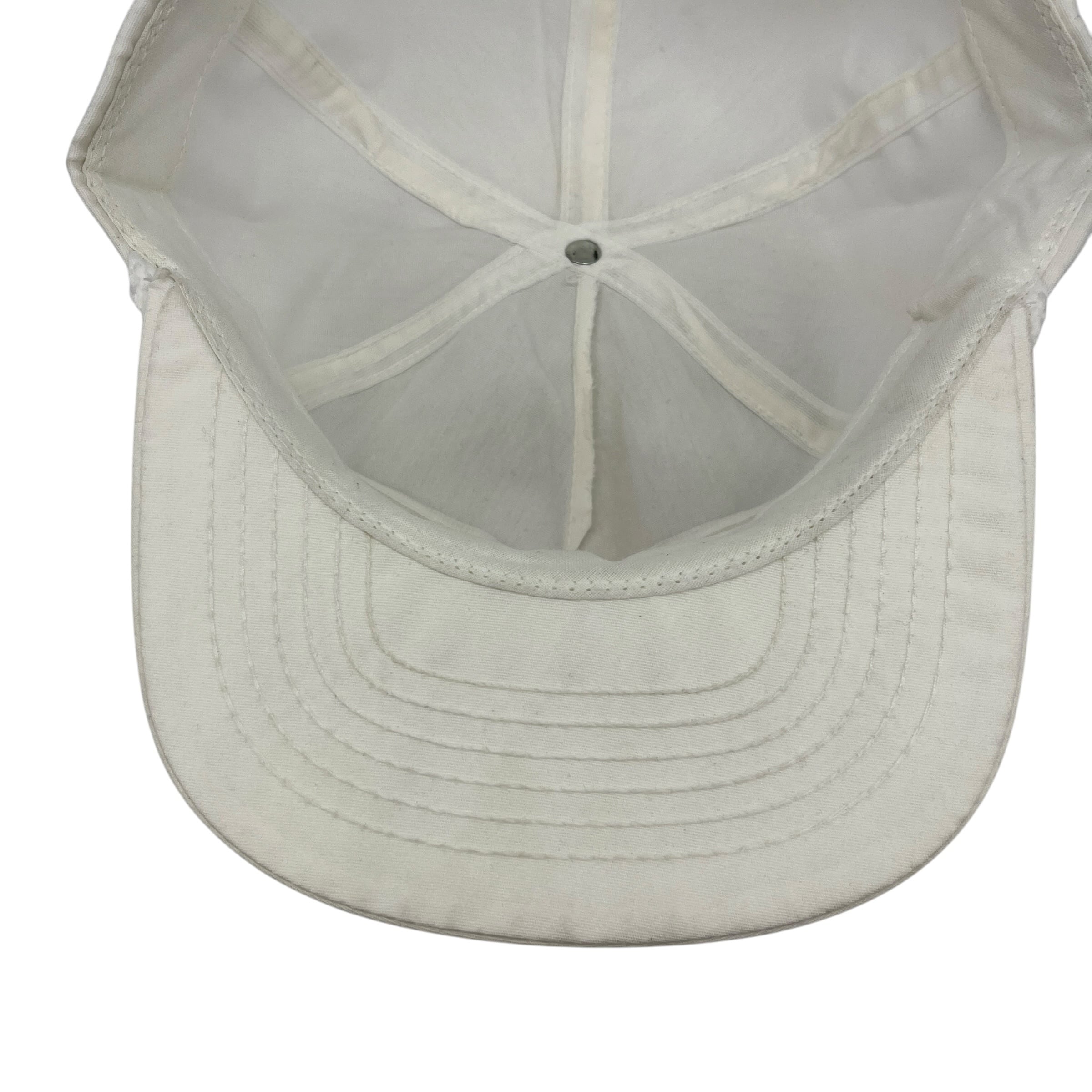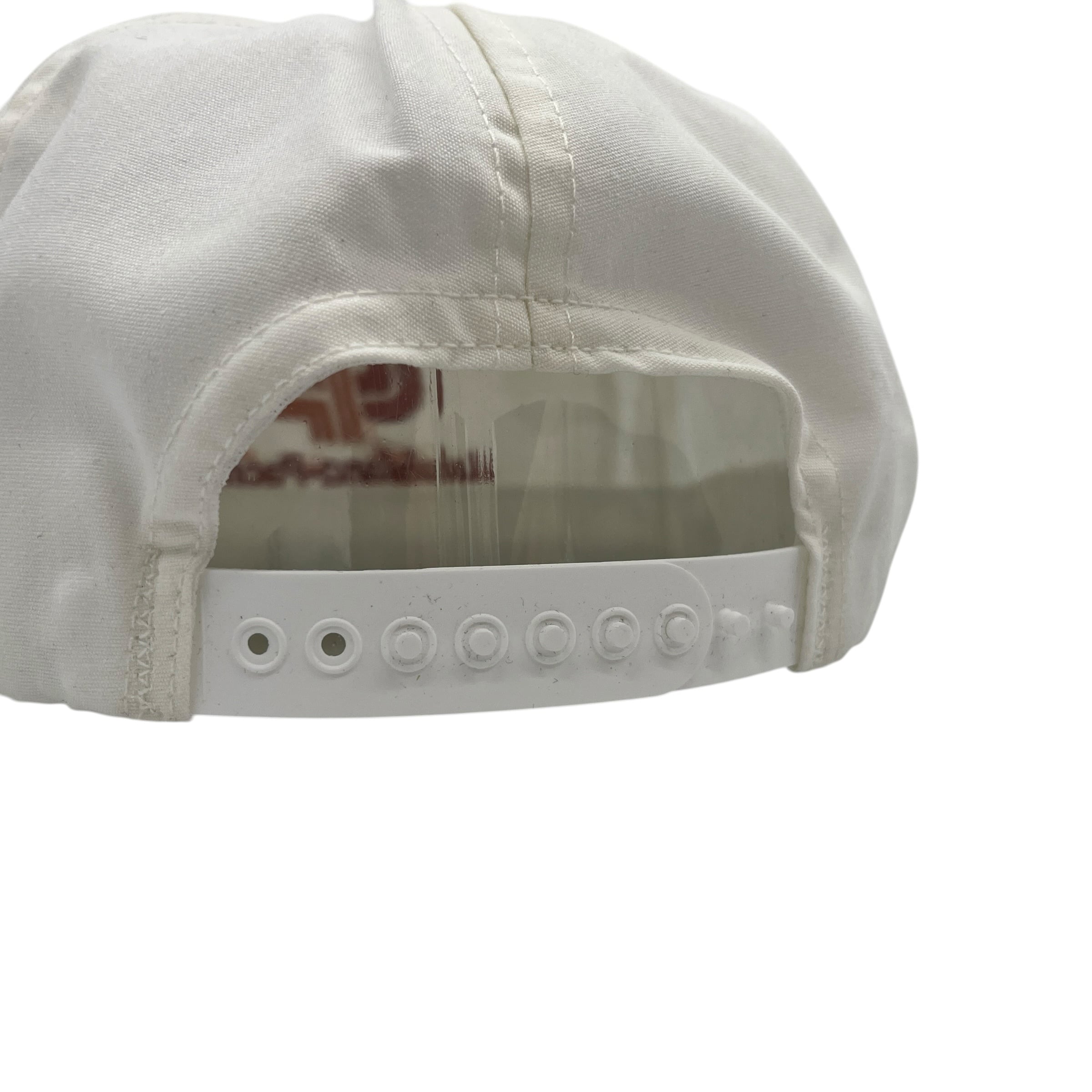 ホワイトボディに映えるオレンジとブラウンの企業ロゴ刺繍が特徴的で、フロントのロープ装飾がクラシックな雰囲気を引き立てます。ボディは信頼のSwingster製で、アジャスター部分に刻印がある通り、希少なMADE IN U.S.A.(アメリカ製)の一品です。