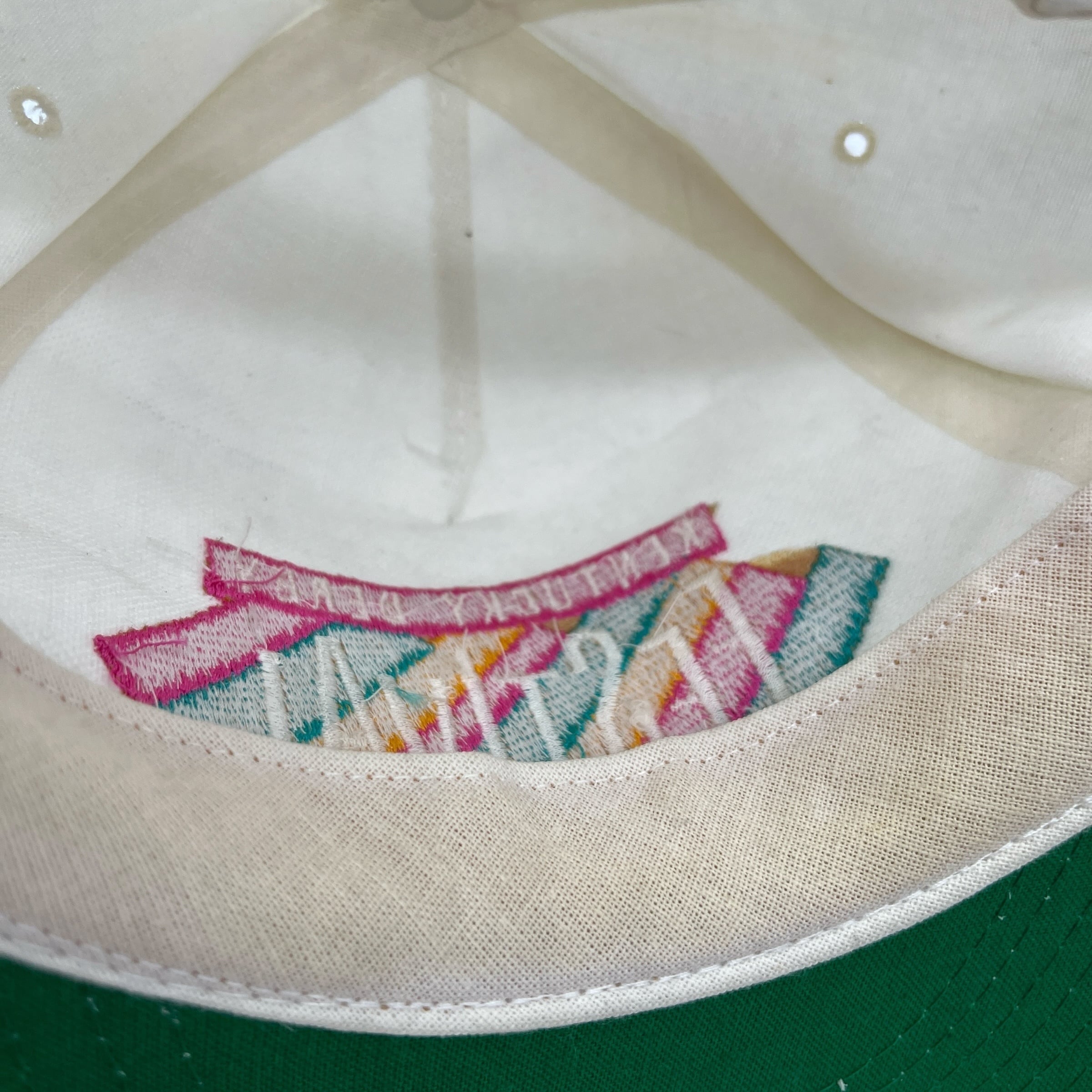 ホワイトボディに当時の空気感を感じさせるマルチカラーの刺繍ロゴが映えるデザインです。フロントのロープ装飾、グリーンのアンダーバイザー、レザーのアジャスターベルトなど、ヴィンテージならではのディティールが詰まった一品です。