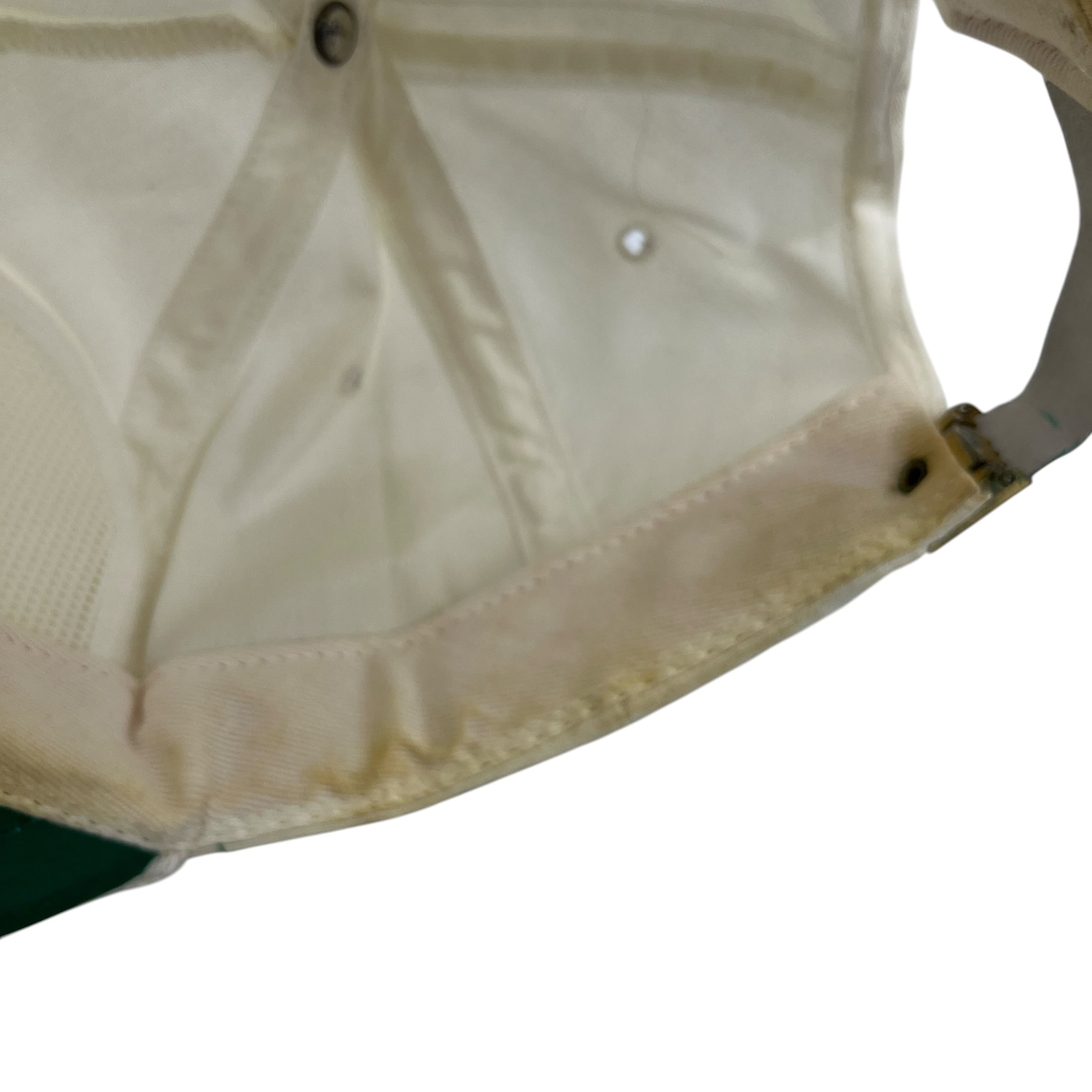 オフホワイトのボディに、ミニマルなグラフィックとタイポグラフィが刺繍された、80〜90年代特有のクリーンで洗練されたデザインです。グリーンのアンダーバイザーとフロントのロープ装飾、レザーのアジャスターベルトが、当時のスポーツエレガンスな雰囲気を醸し出しています。La Mode製のタグにある通り、希少なMADE IN U.S.A.(アメリカ製)の一品です。