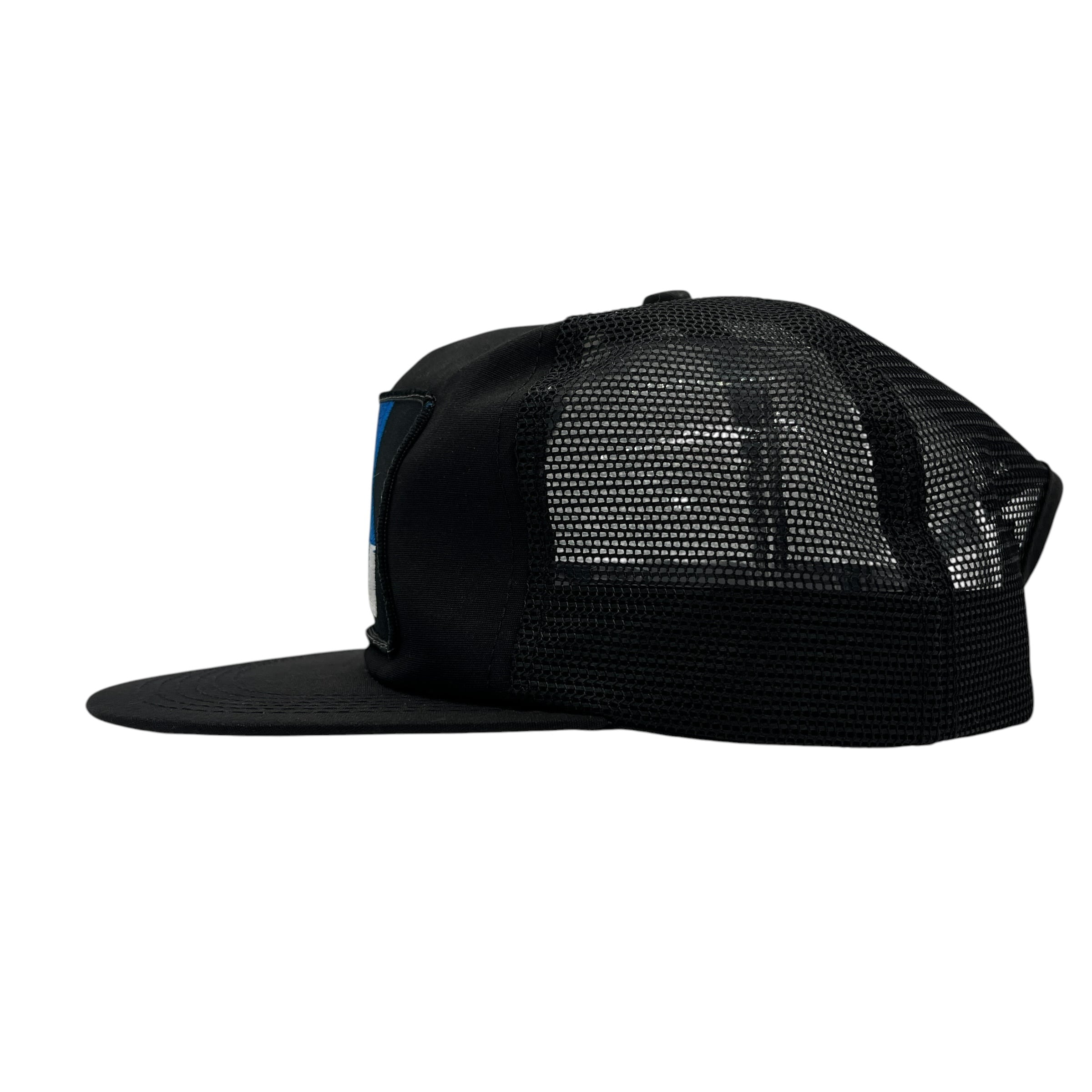 シンプルなブラックボディにブルーのロゴが映える、合わせやすさと個性を兼ね備えたアイテム。アメリカ製ヴィンテージキャップのコレクターや、一点物の企業系・ブランド系アイテムをお探しの方にぜひ。