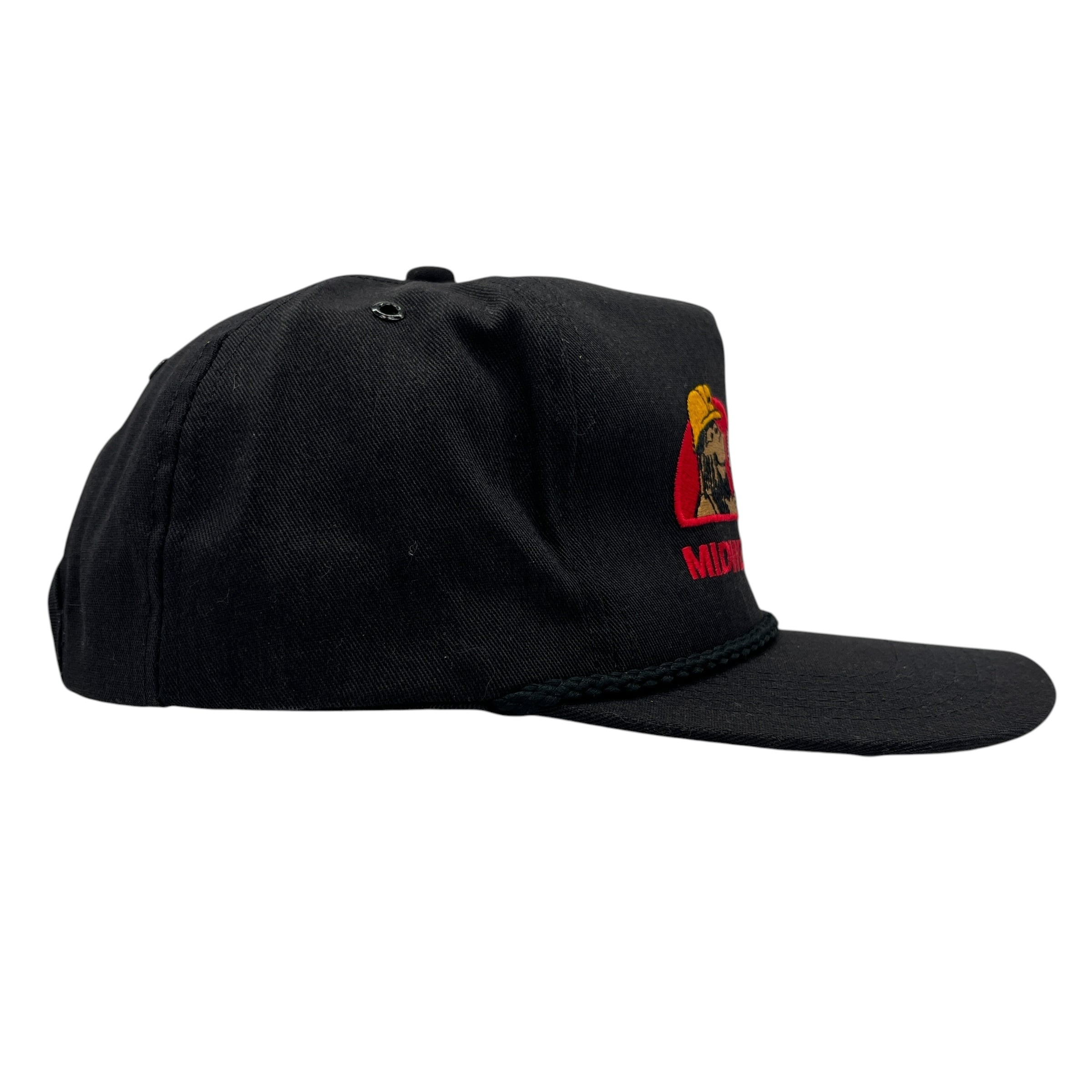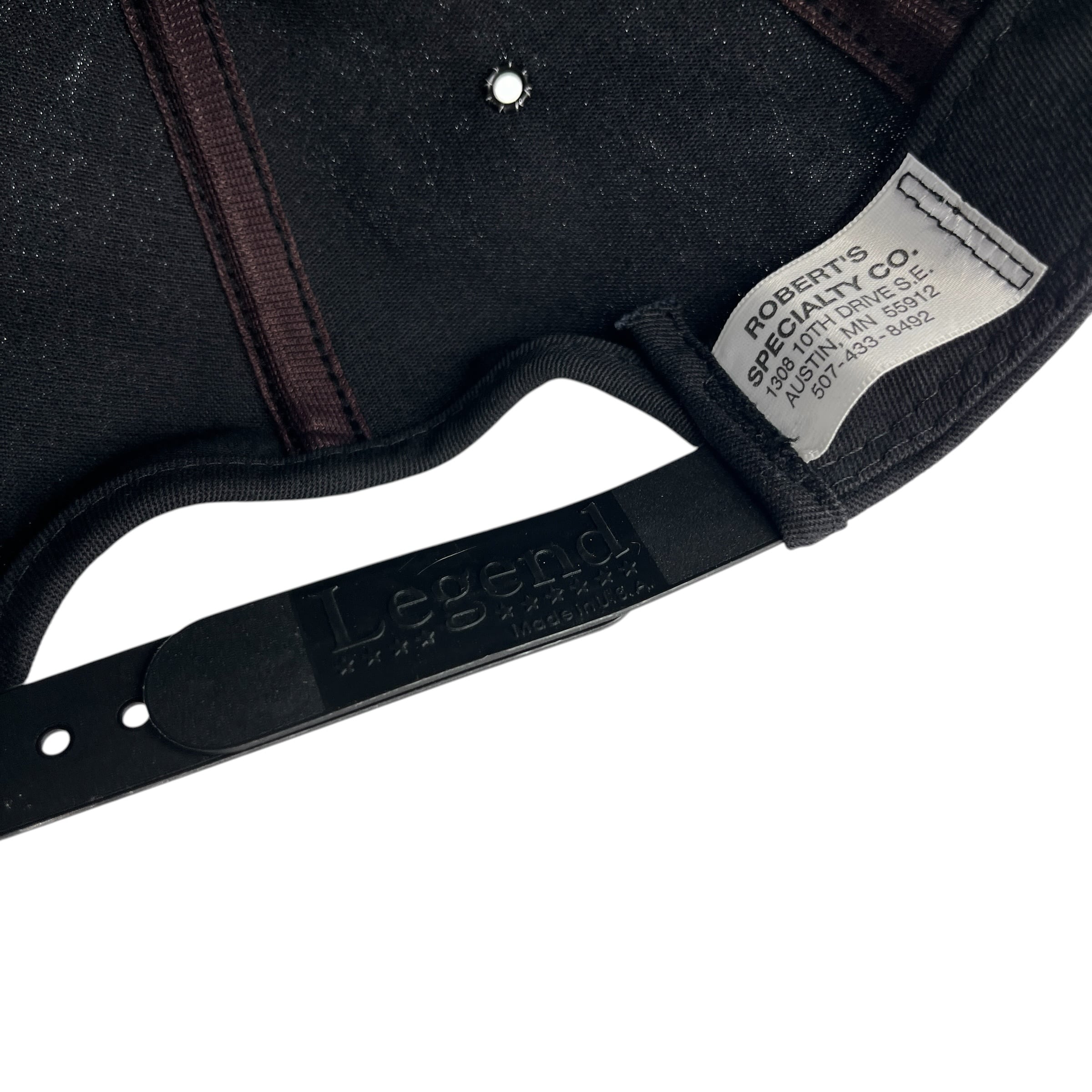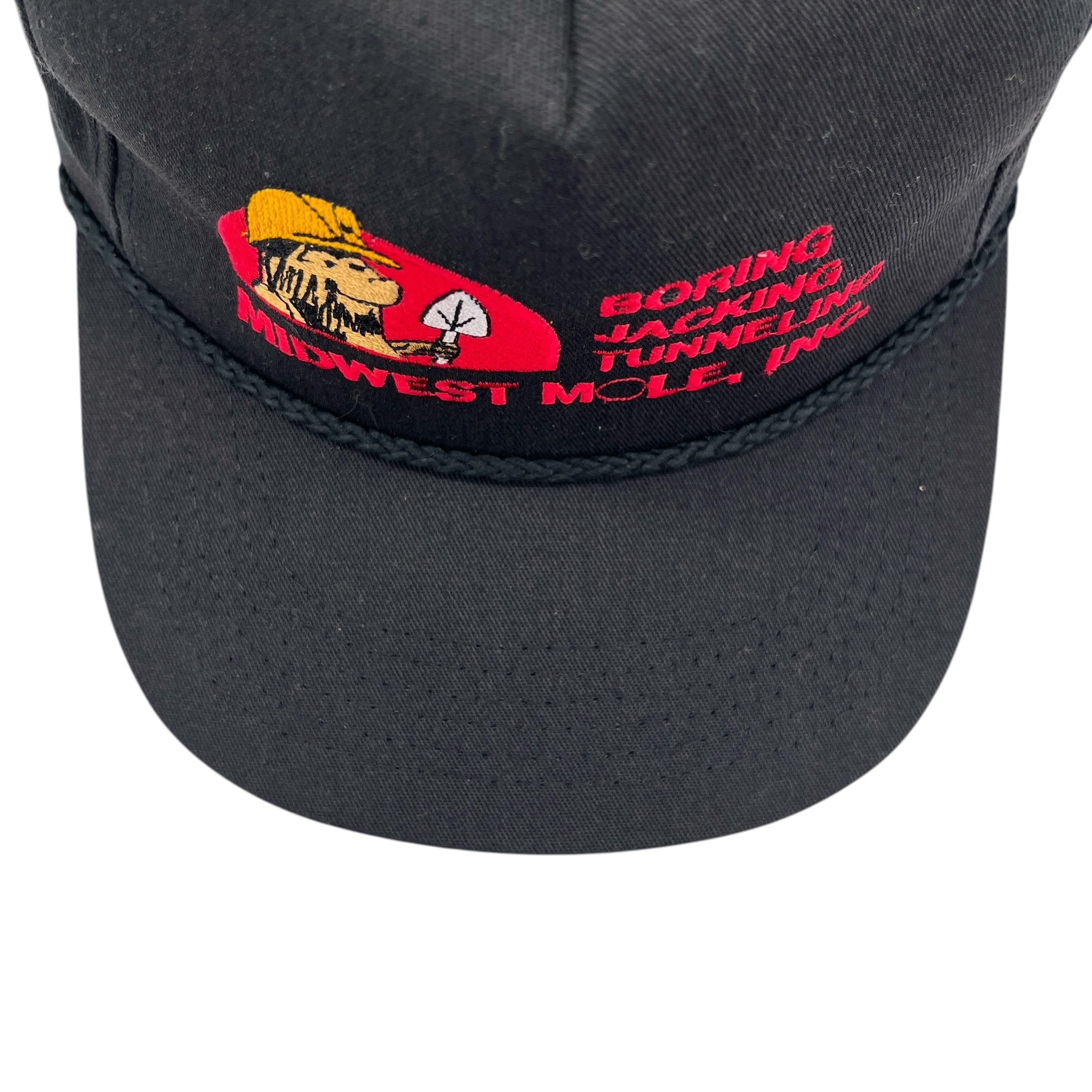 インディアナ州に拠点を置くトンネル掘削専門企業「MIDWEST MOLE, INC.」のビンテージ・スナップバックキャップです。ブラックのボディに、シャベルを抱えヘルメットを被ったモグラのキャラクターと、業務内容である「BORING(ボーリング)」「JACKING(ジャッキング)」「TUNNELING(トンネル掘削)」の文字が鮮やかな刺繍で施されています。内側のタグにはミネソタ州オースティンの「ROBERT'S SPECIALTY CO.」の社名があり、アジャスター部分には「MADE IN U.S.A.」の刻印が確認できる希少なアメリカ製アイテムです。80年代から90年代頃の無骨なワークスタイルの雰囲気と、企業物ならではのユニークなキャラクターデザインが融合した、コレクター必見の一品です。
