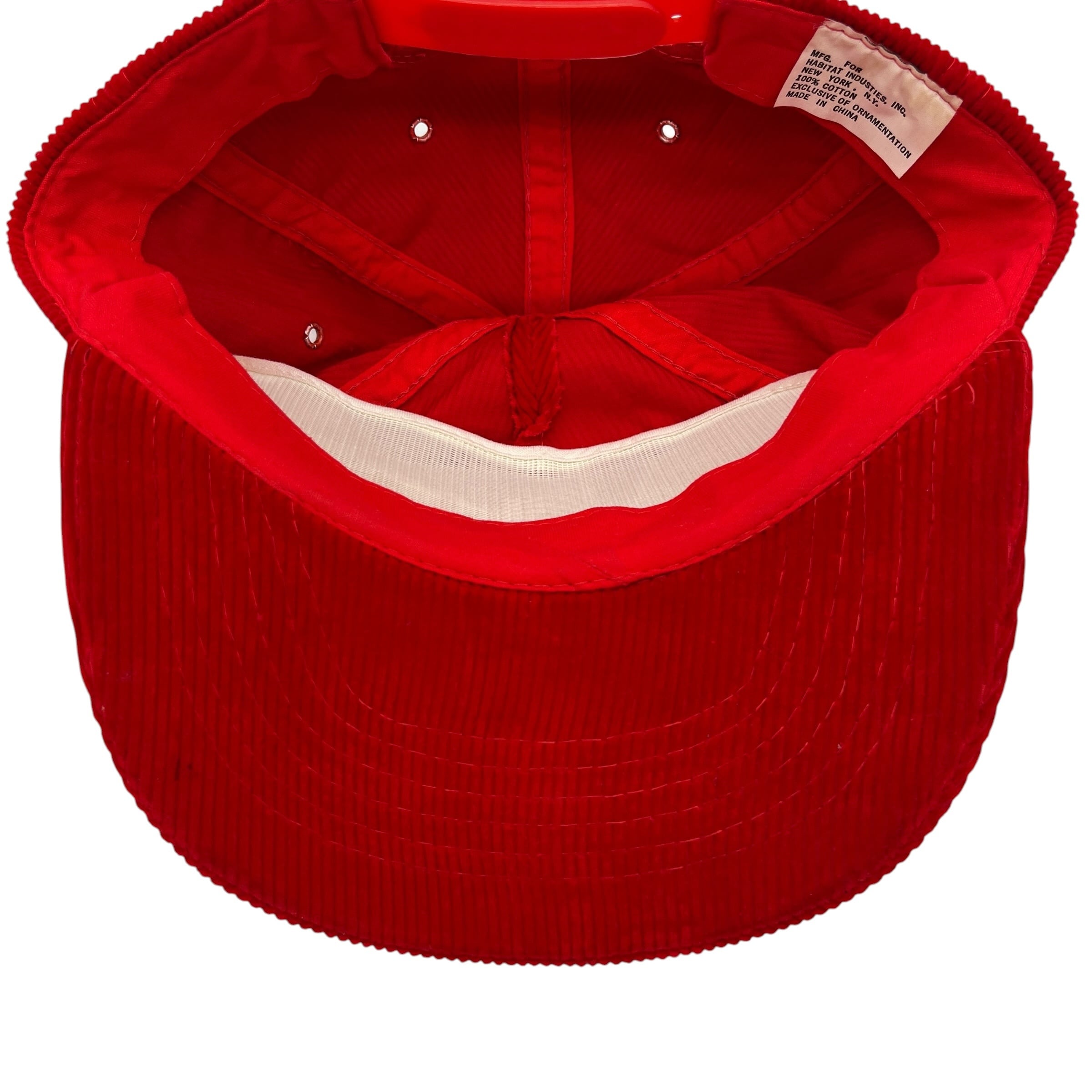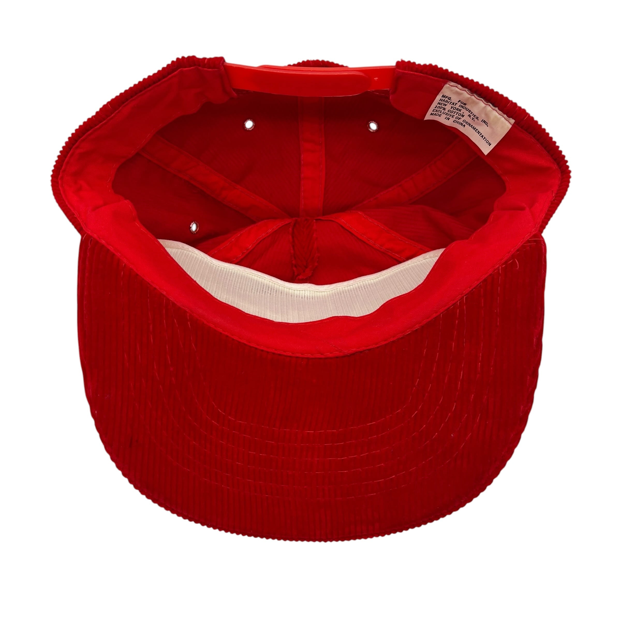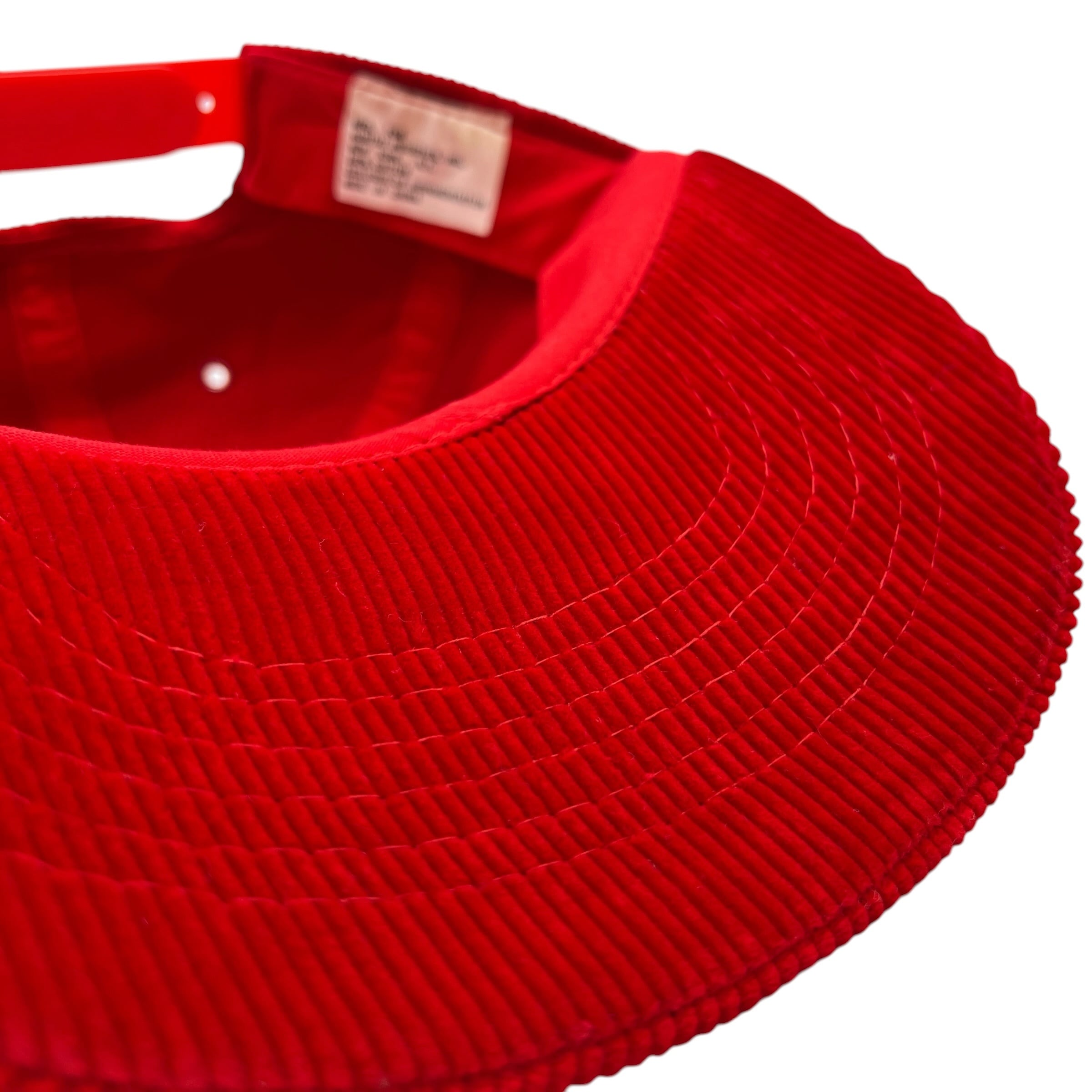 鮮やかなレッドのボディに、フロントの白いブランドロゴ刺繍が映えるクラシックなデザイン。温かみのある太畝のコーデュロイ素材が、ストリートや古着スタイルに絶妙なアクセントを加えます。