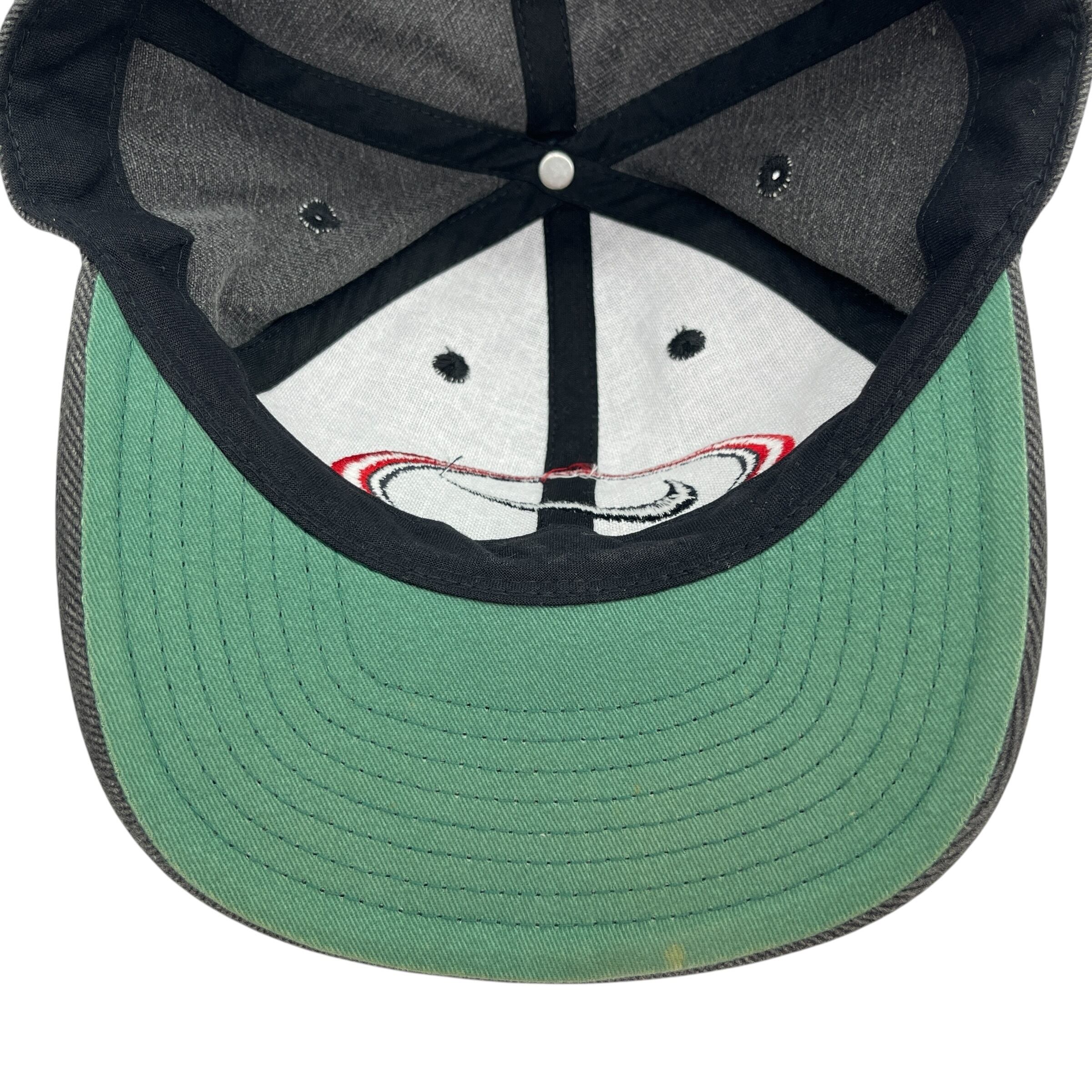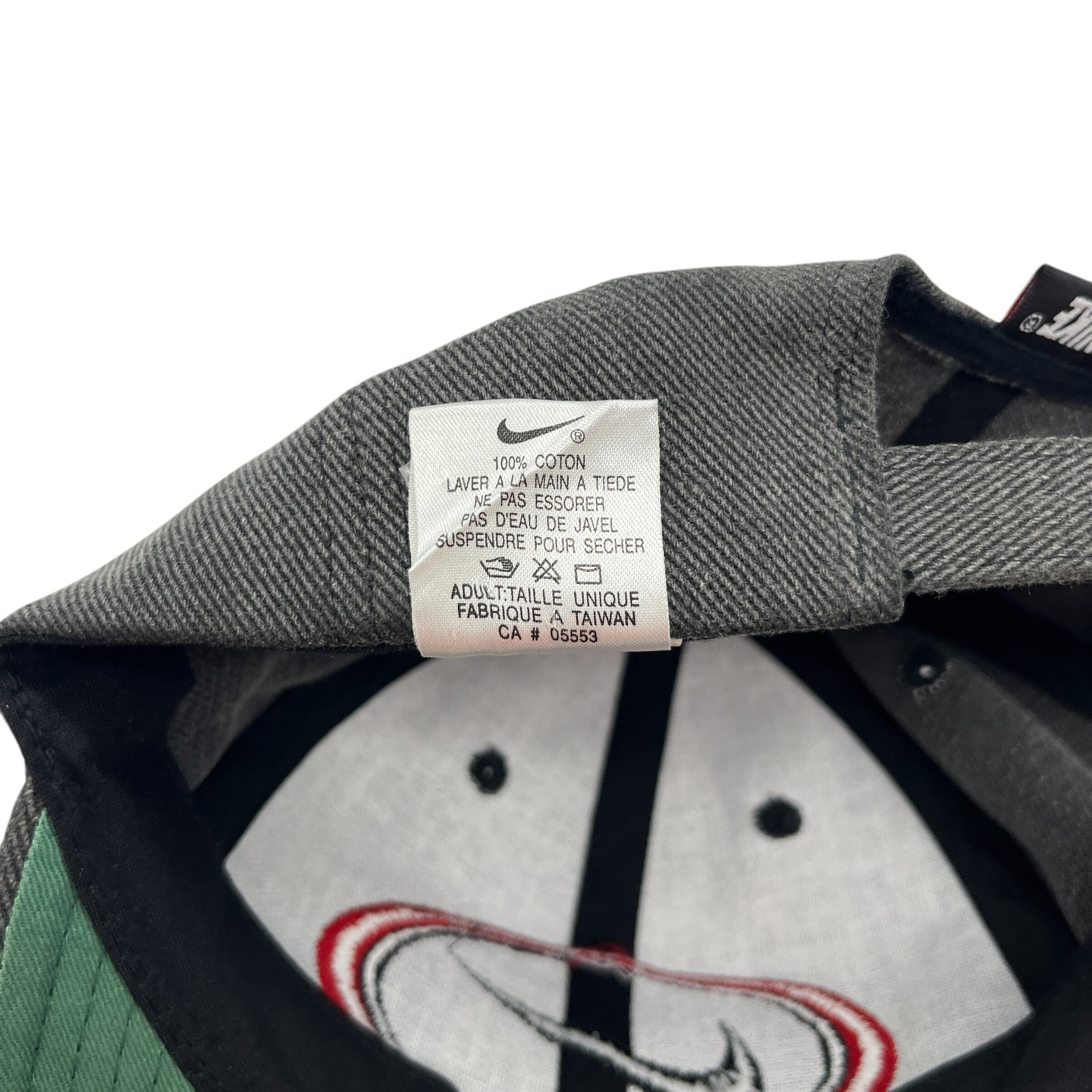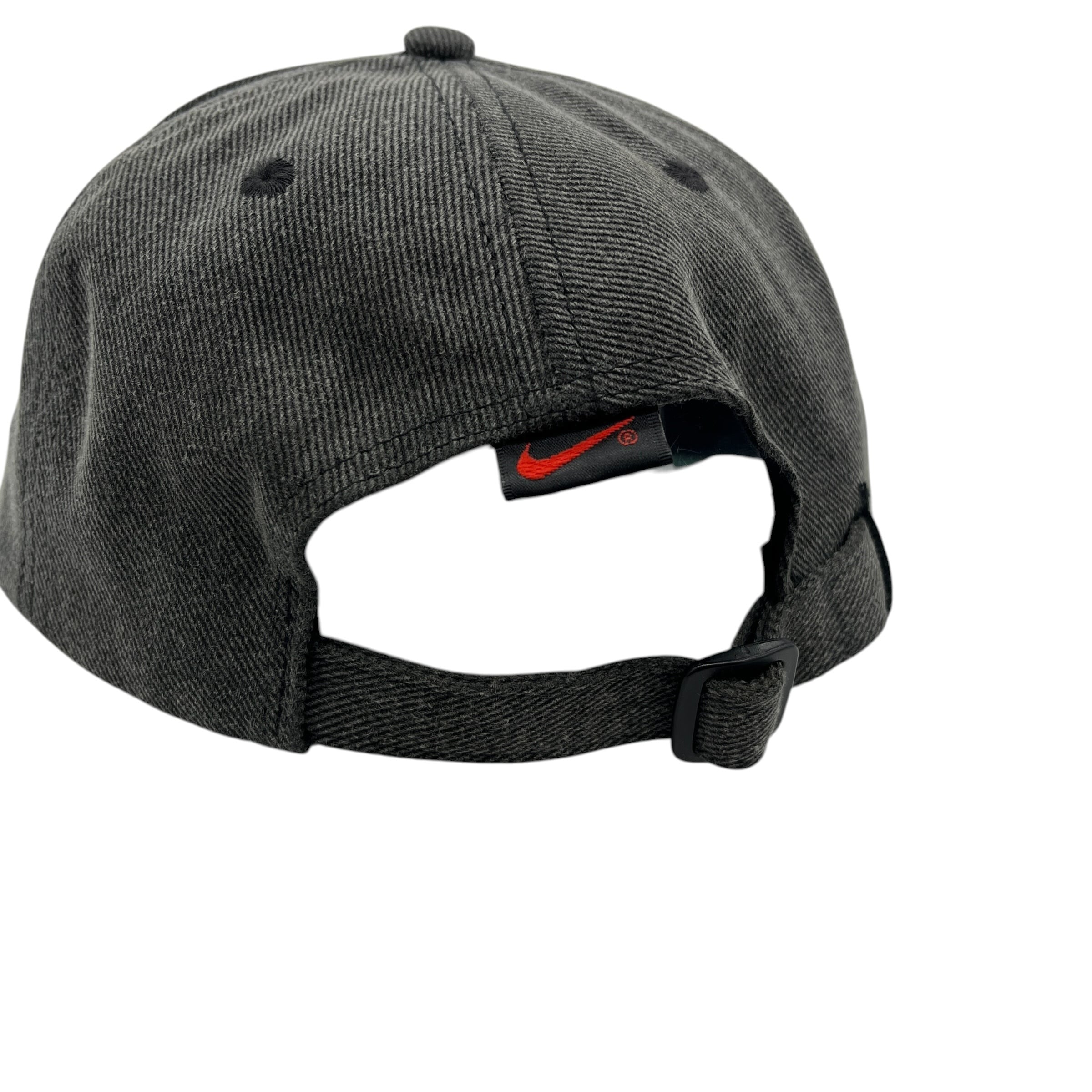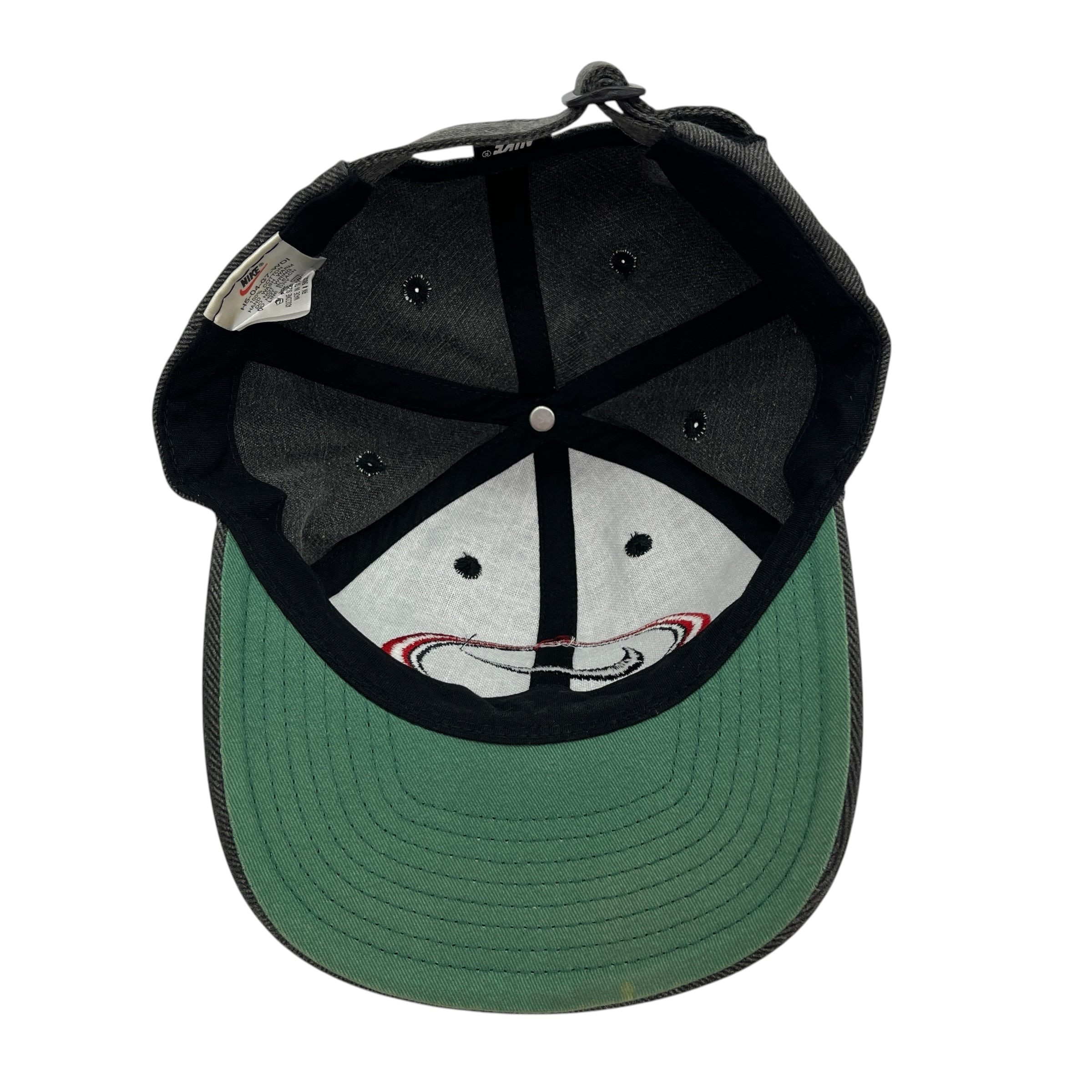 フロントには楕円形のパッチにスウッシュが刺繍された、当時らしいレトロスポーツなデザイン。ボディは表情のあるチャコールグレーのコットン生地で、バイザー裏のグリーンがヴィンテージ特有の渋さを引き立てています。