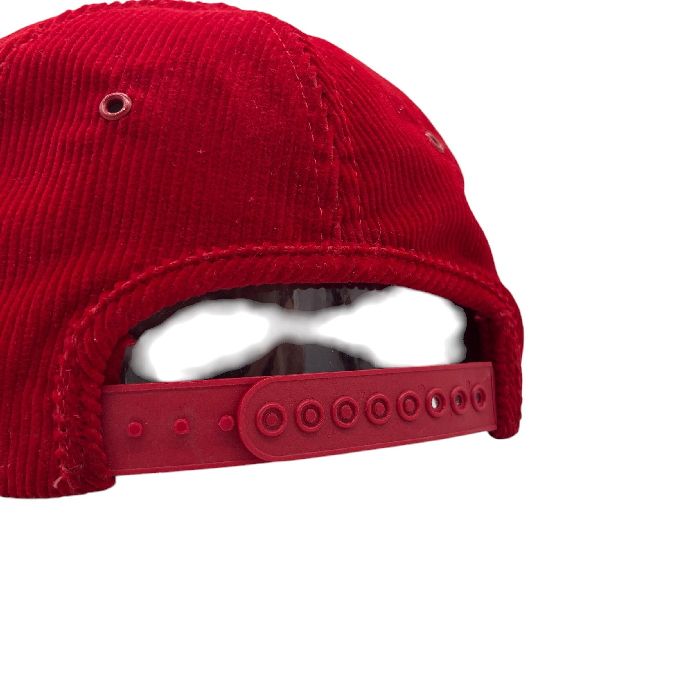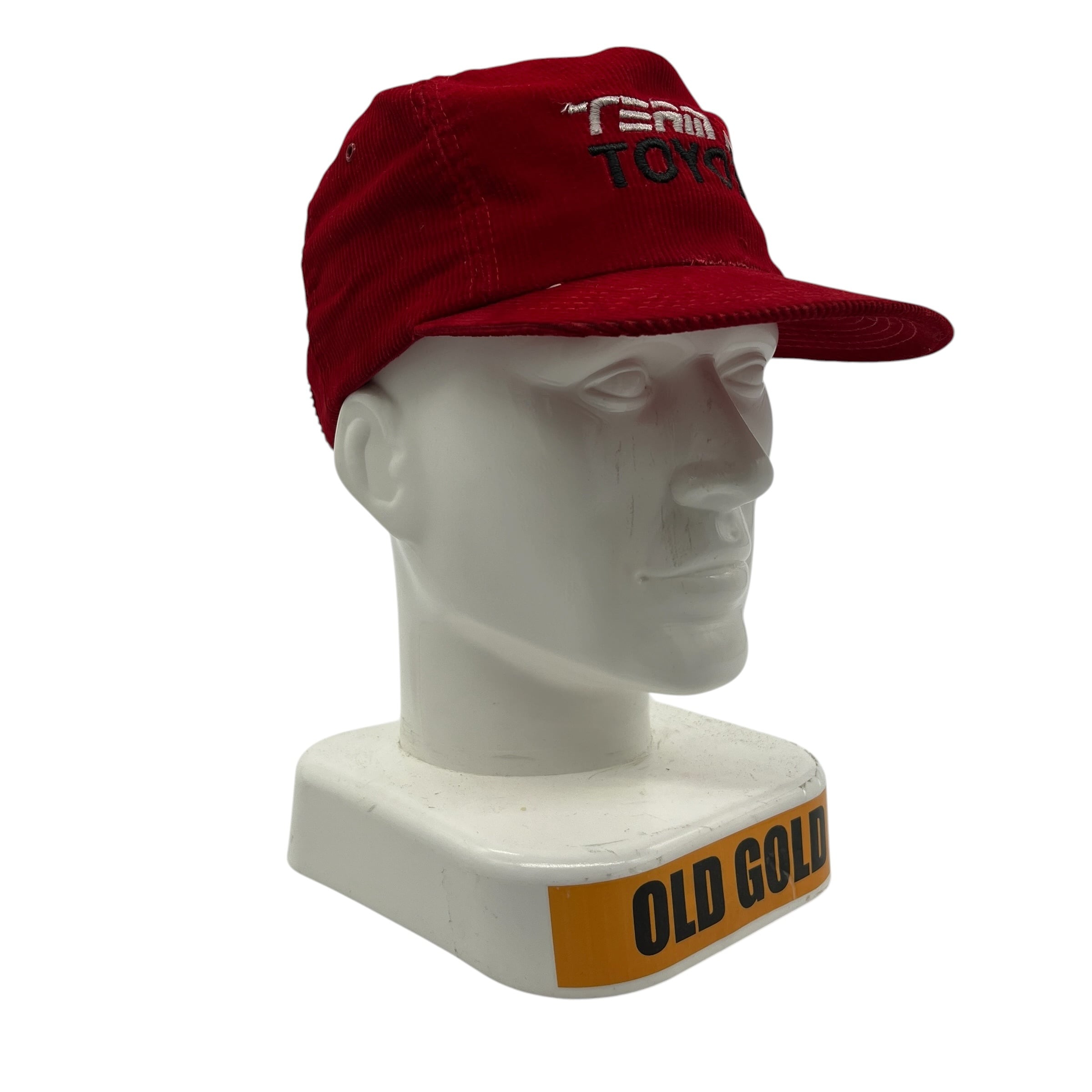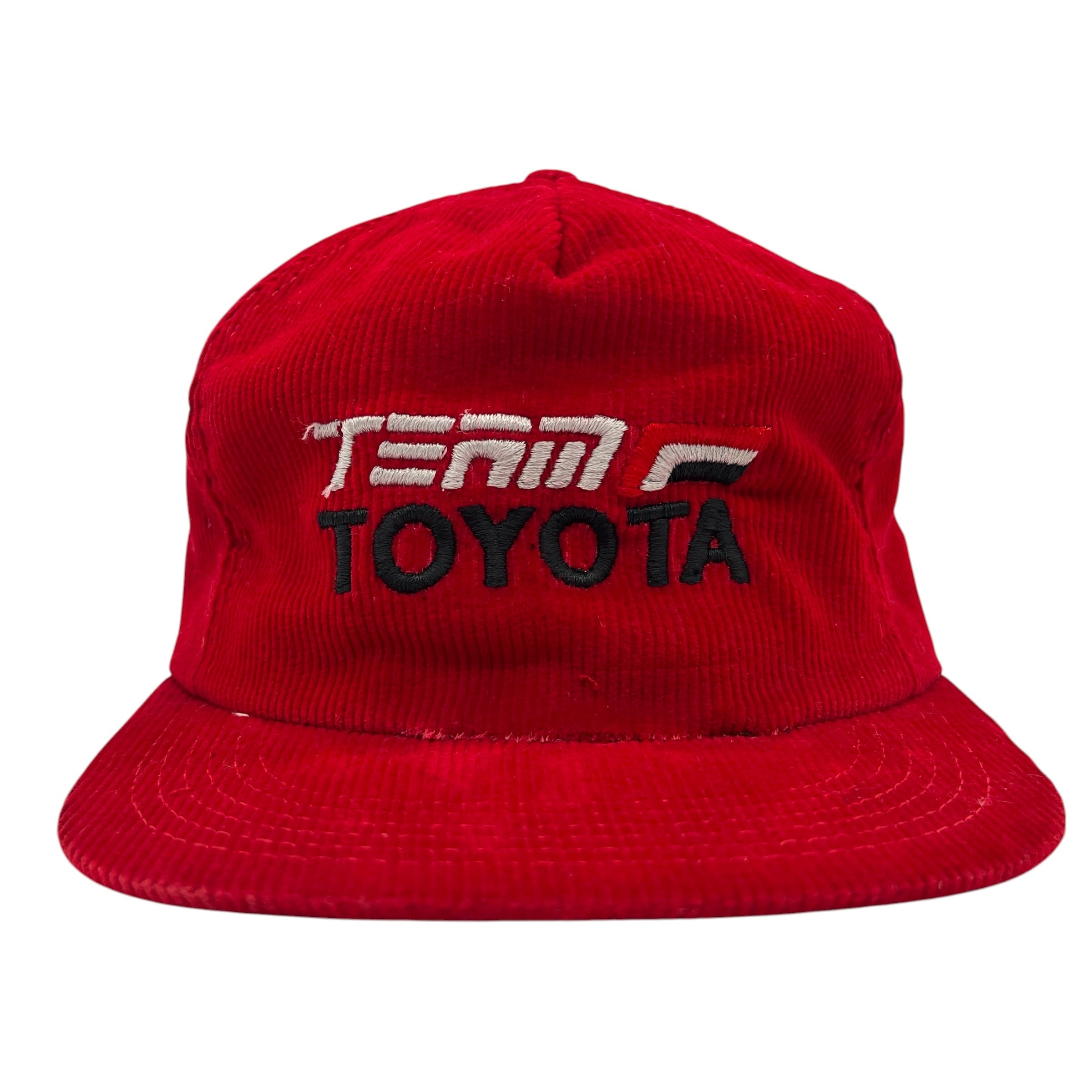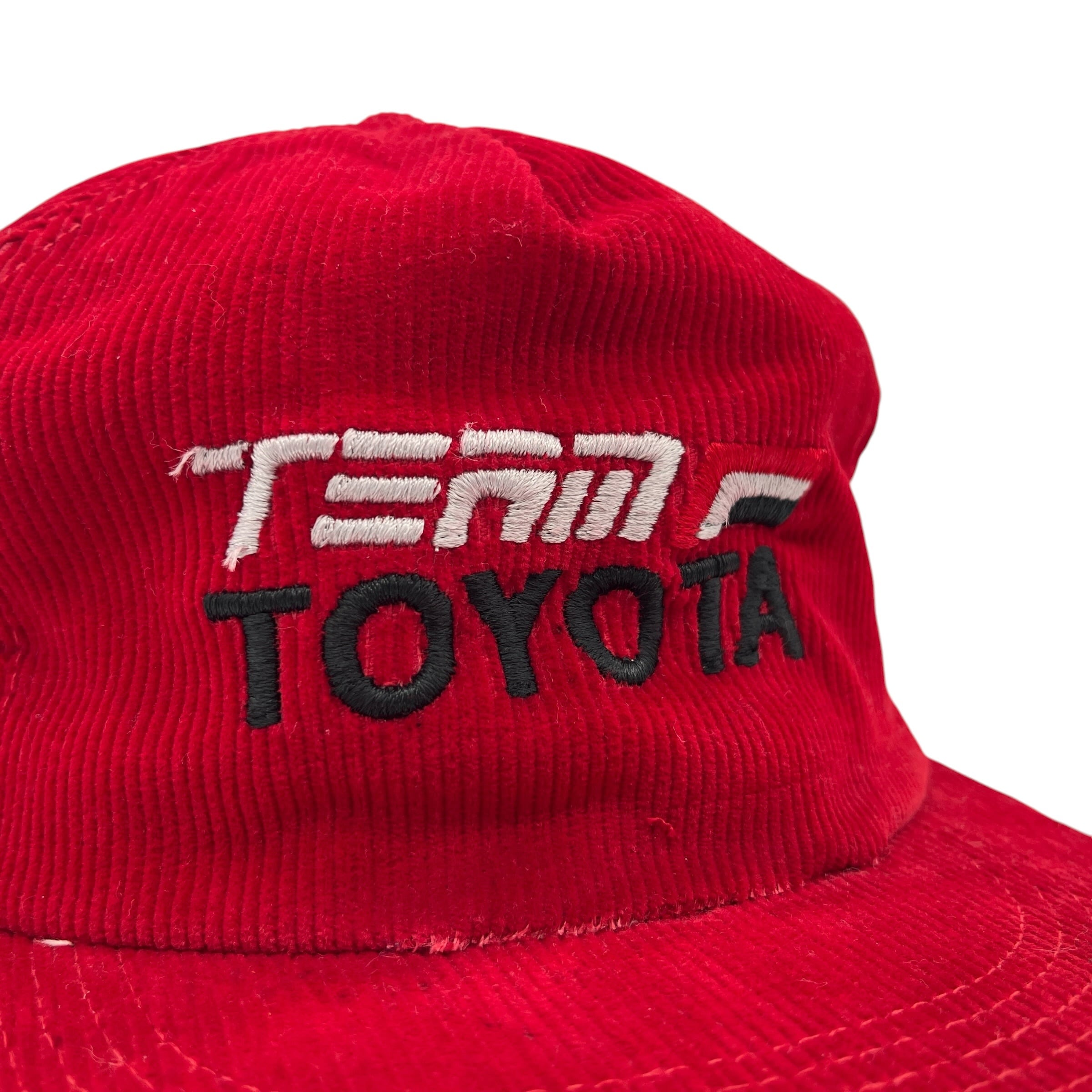 発色の良いレッドカラーのコーデュロイボディに、フロントには「TEAM TOYOTA」のロゴが厚みのある刺繍で施されています。トヨタファンや旧車ファンにはたまらない、当時のレーシングスピリットを感じさせるデザインです。