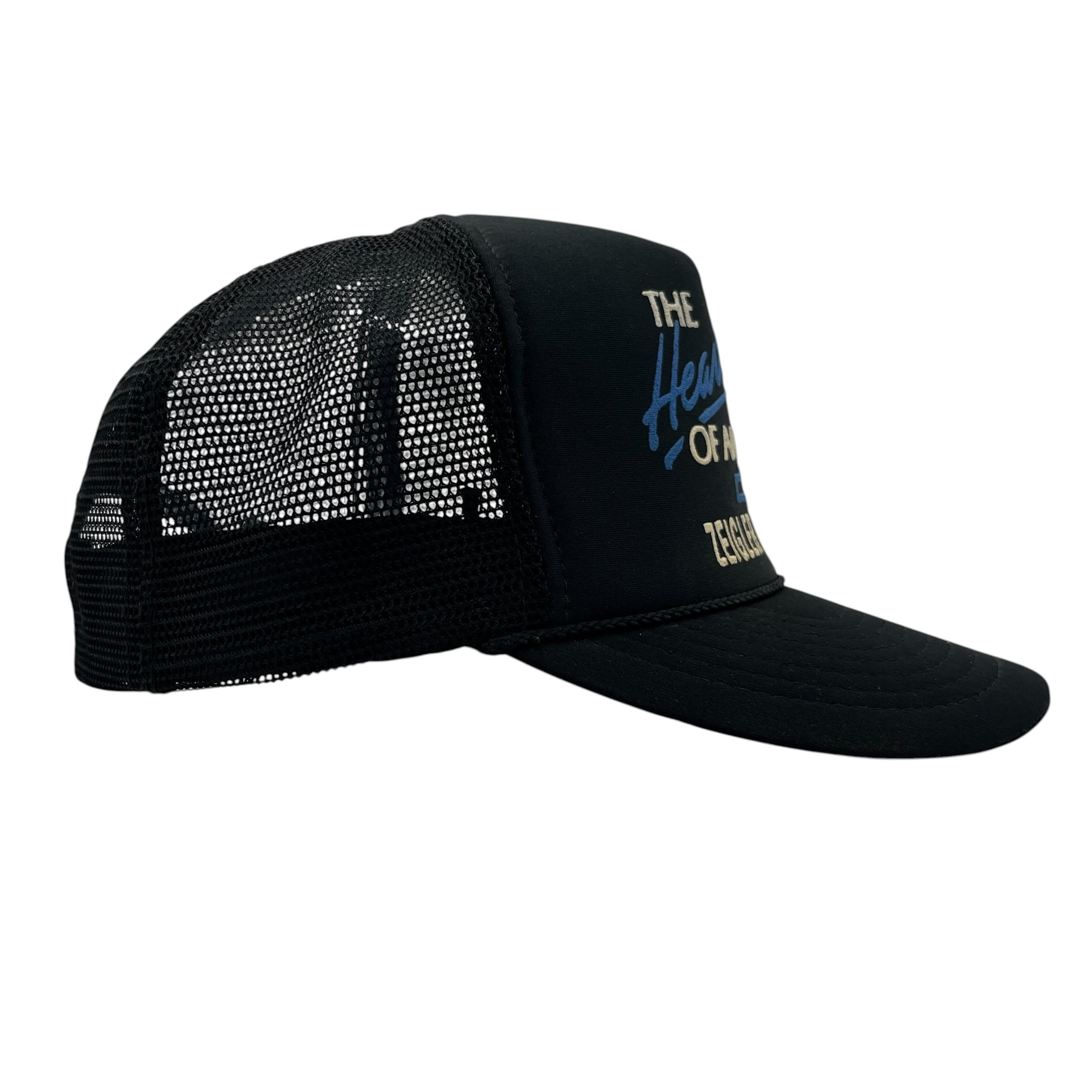 ブラックボディにブルーのスクリプトロゴ、そしてホワイトの刺繍が映える、まさにアメリカン・マッスルカーやピックアップトラックの黄金期を象徴するデザイン。下部には、イリノイ州やミシガン州を中心に展開する大手ディーラーグループ「ZEIGLER CHEVY-OLDS」の名が刻まれた、希少なアドバタイジング(企業物)アイテムです。