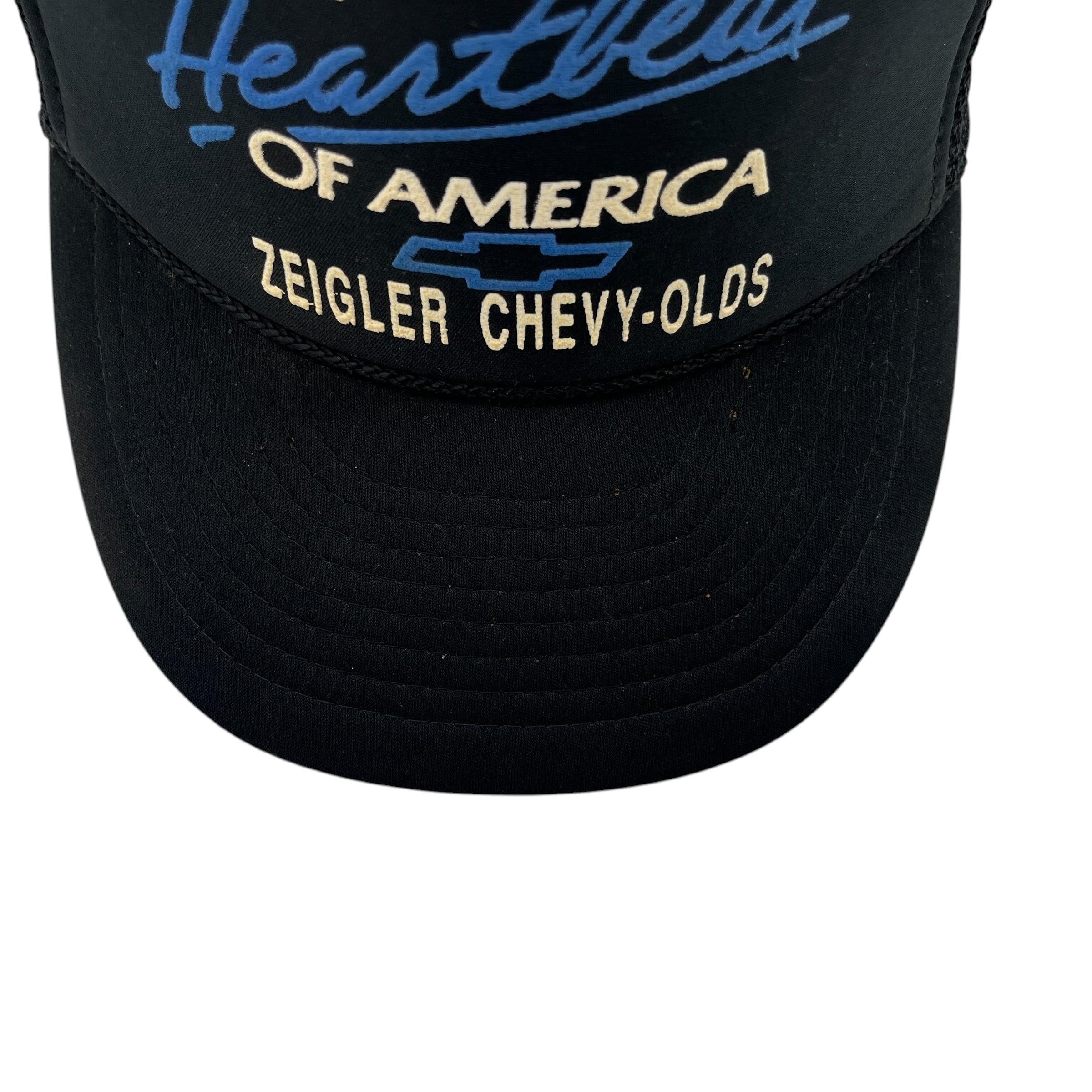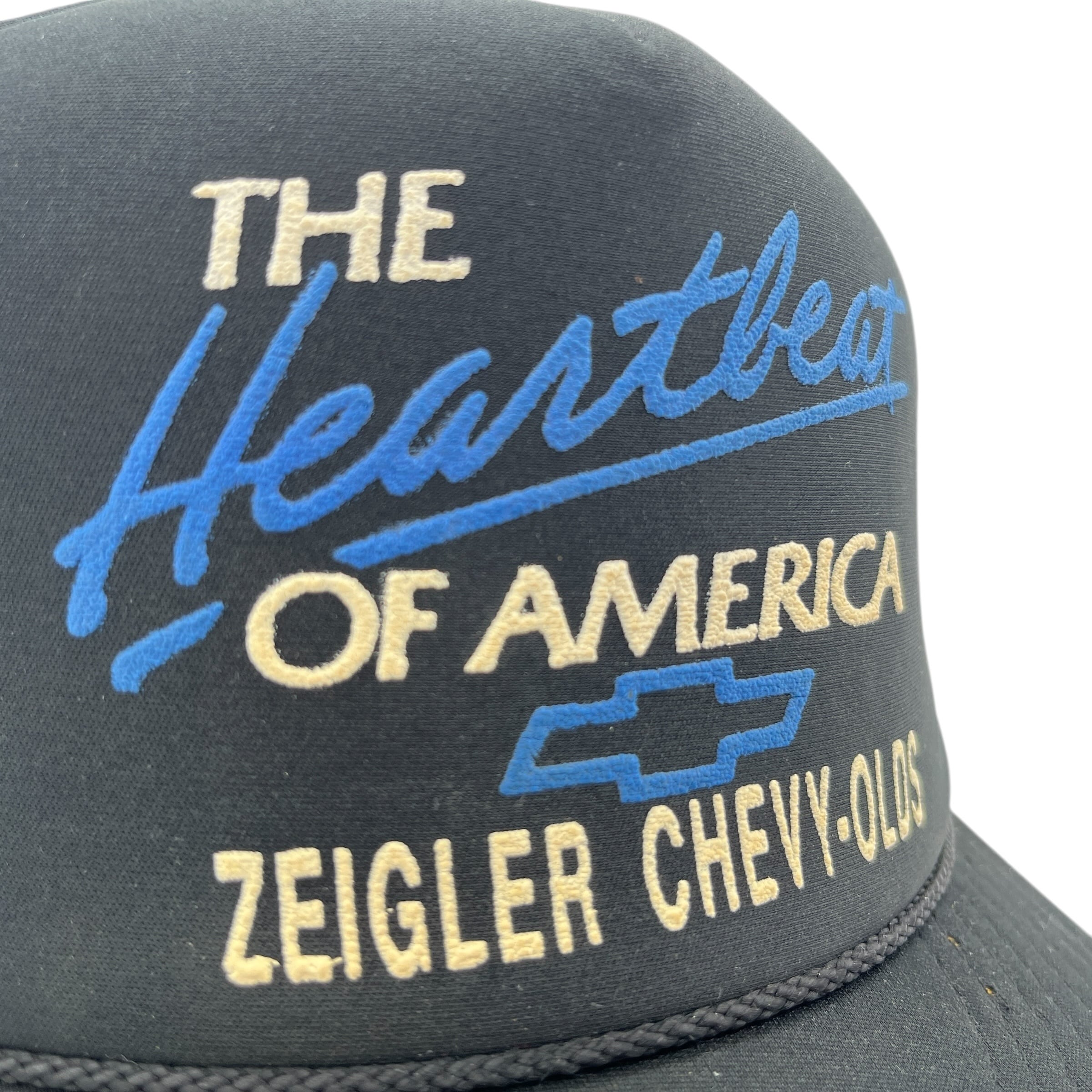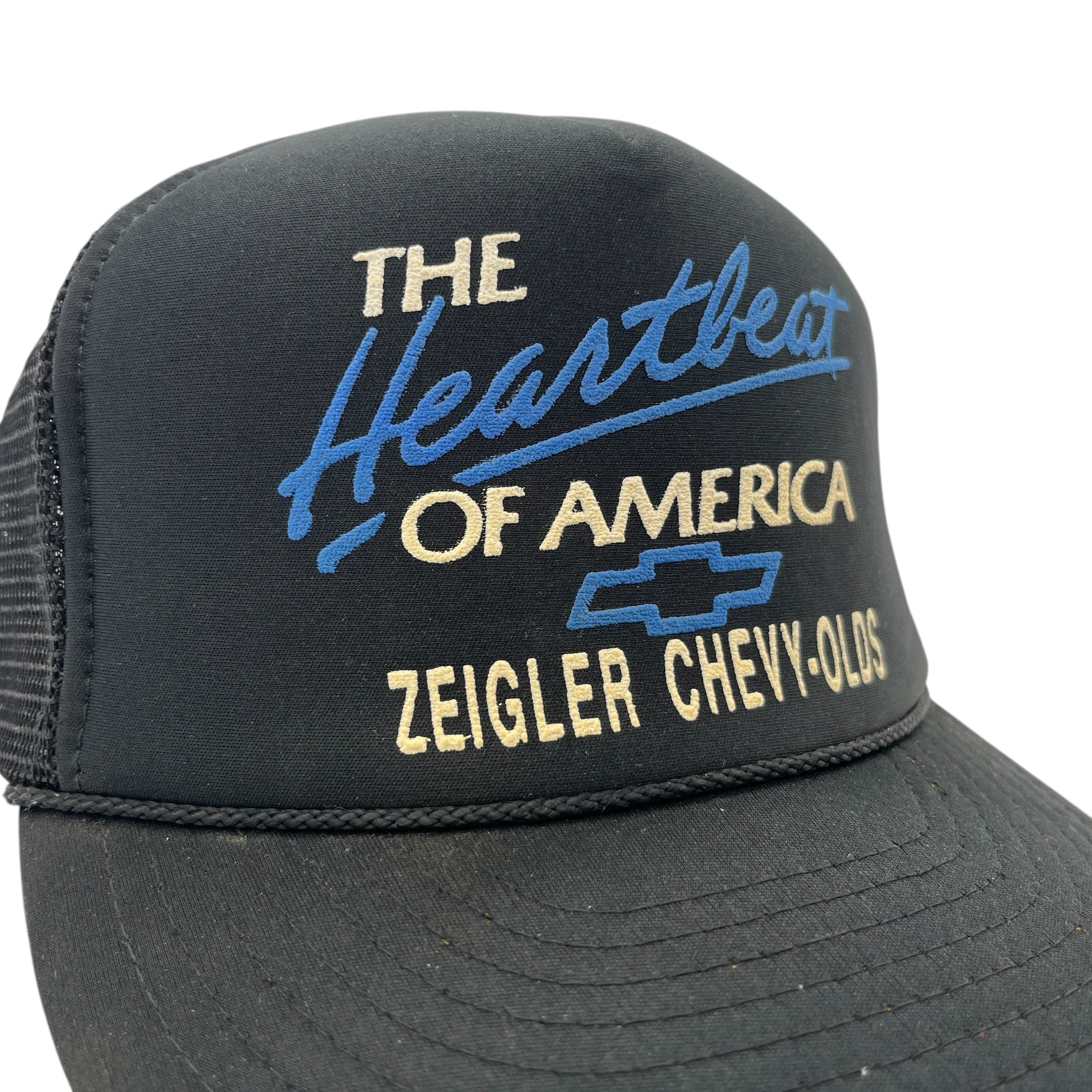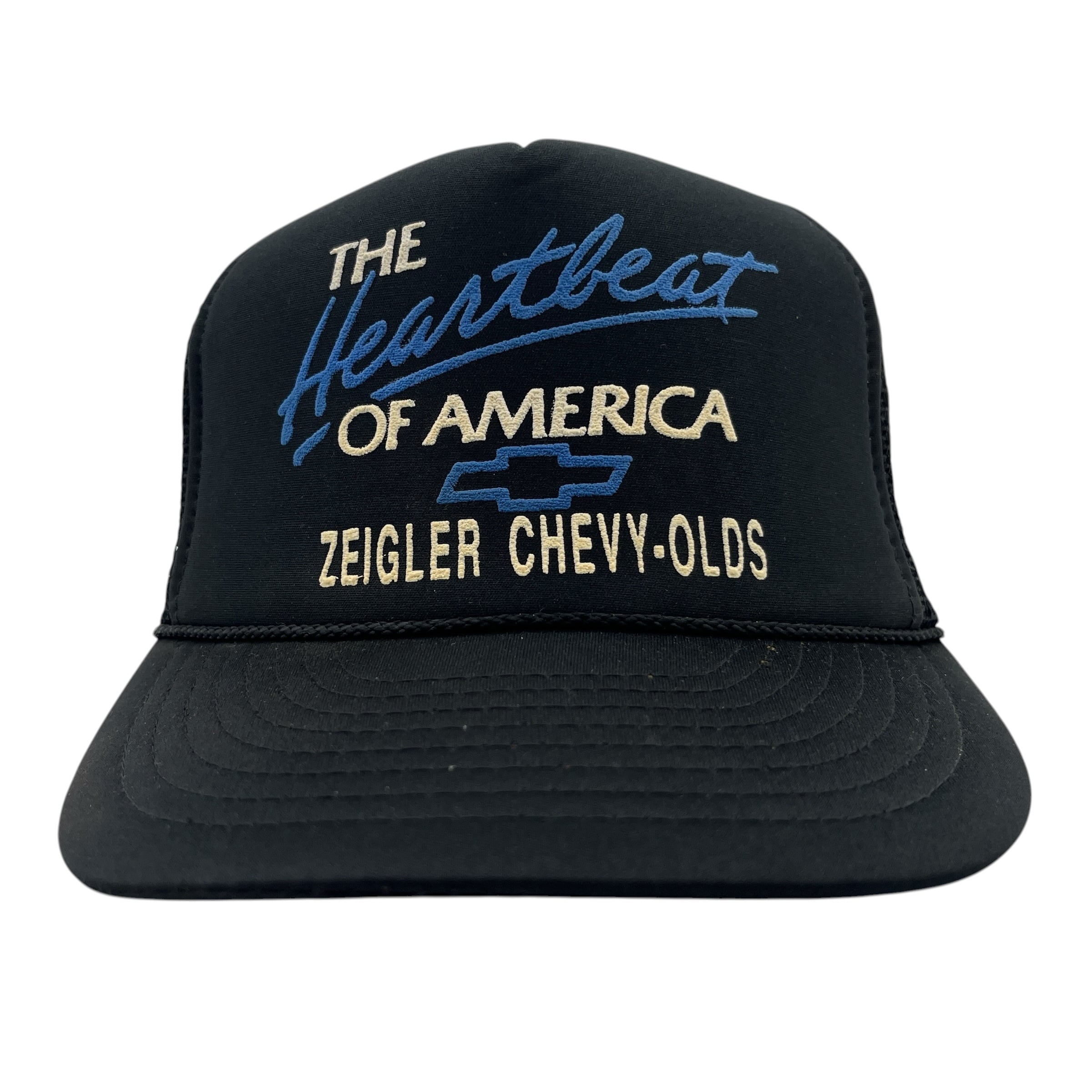 1980年代後半〜90年代にかけて、シボレーの広告で一世を風靡したスローガン「The Heartbeat of America」のプリントが施されたヴィンテージ・トラッカーキャップです。