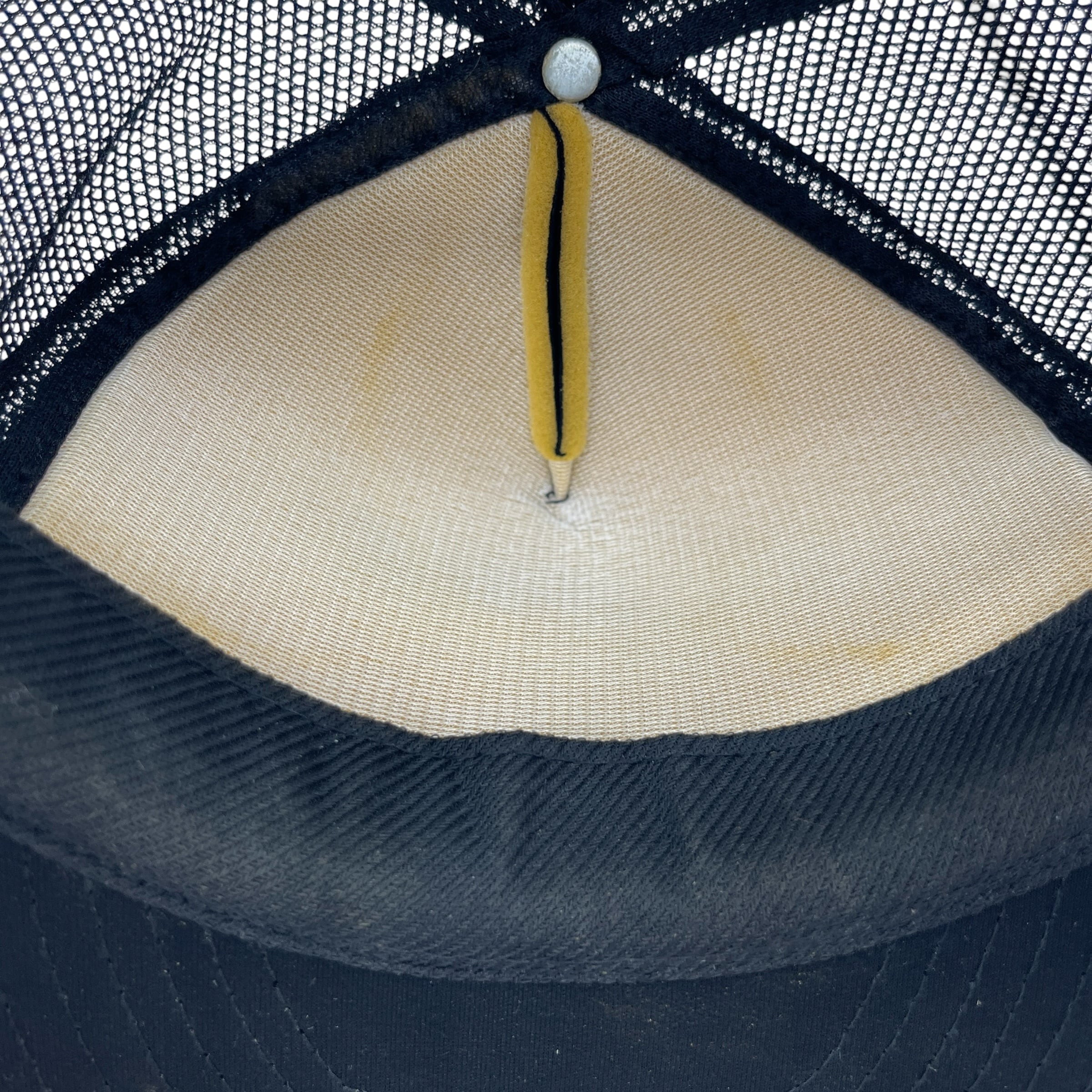 フロントはスポンジ素材、バックはメッシュの王道トラッカー仕様。現在は存在しない「オールズモビル(OLDS)」併設時代のディーラー名は、カーコレクターにとっても資料価値の高いディテールです。