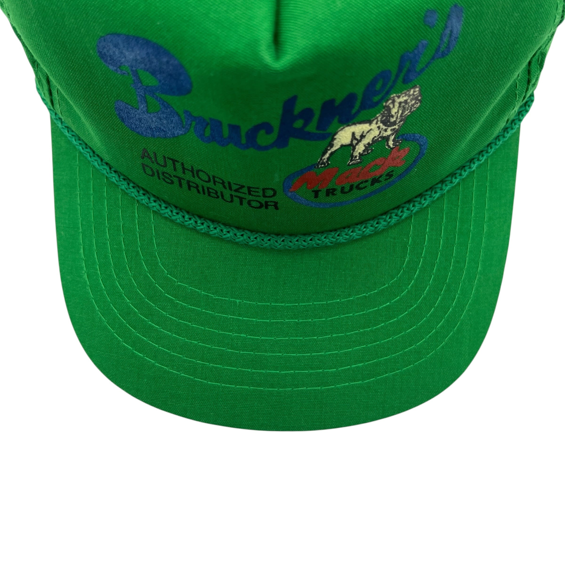 1990年代の希少なMack Trucks(マック・トラック)のビンテージトラッカーキャップです。鮮やかなグリーンのボディに、公式ディストリビューターである「Bruckner's」のロゴと、お馴染みのブルドッグがプリントされたインダストリアルな雰囲気が魅力です。