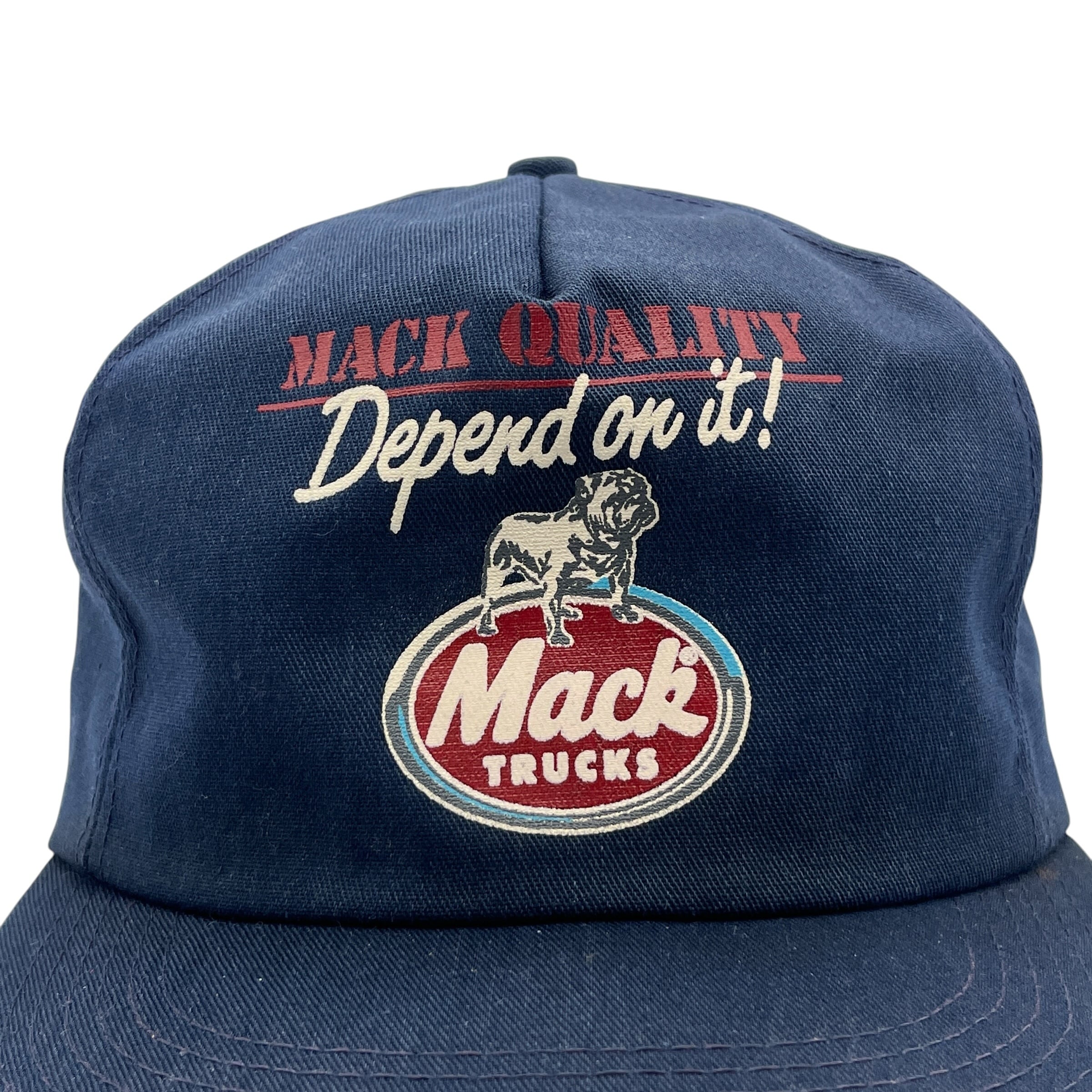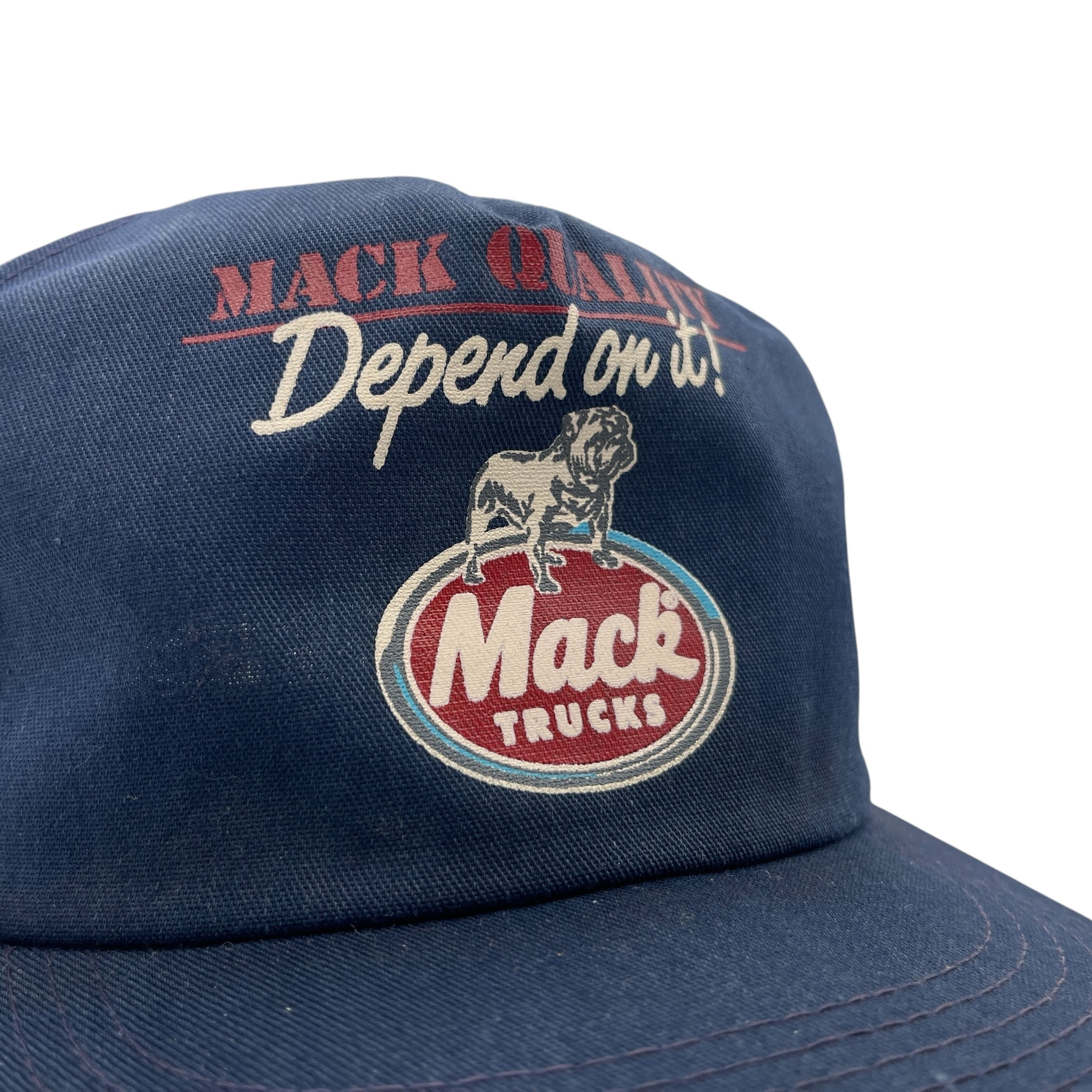 深みのあるネイビーボディに、「MACK QUALITY / Depend on it!」のキャッチコピーと、ブランドの象徴であるブルドッグがプリントされたクラシックなアドバタイジング(広告用)デザインです。