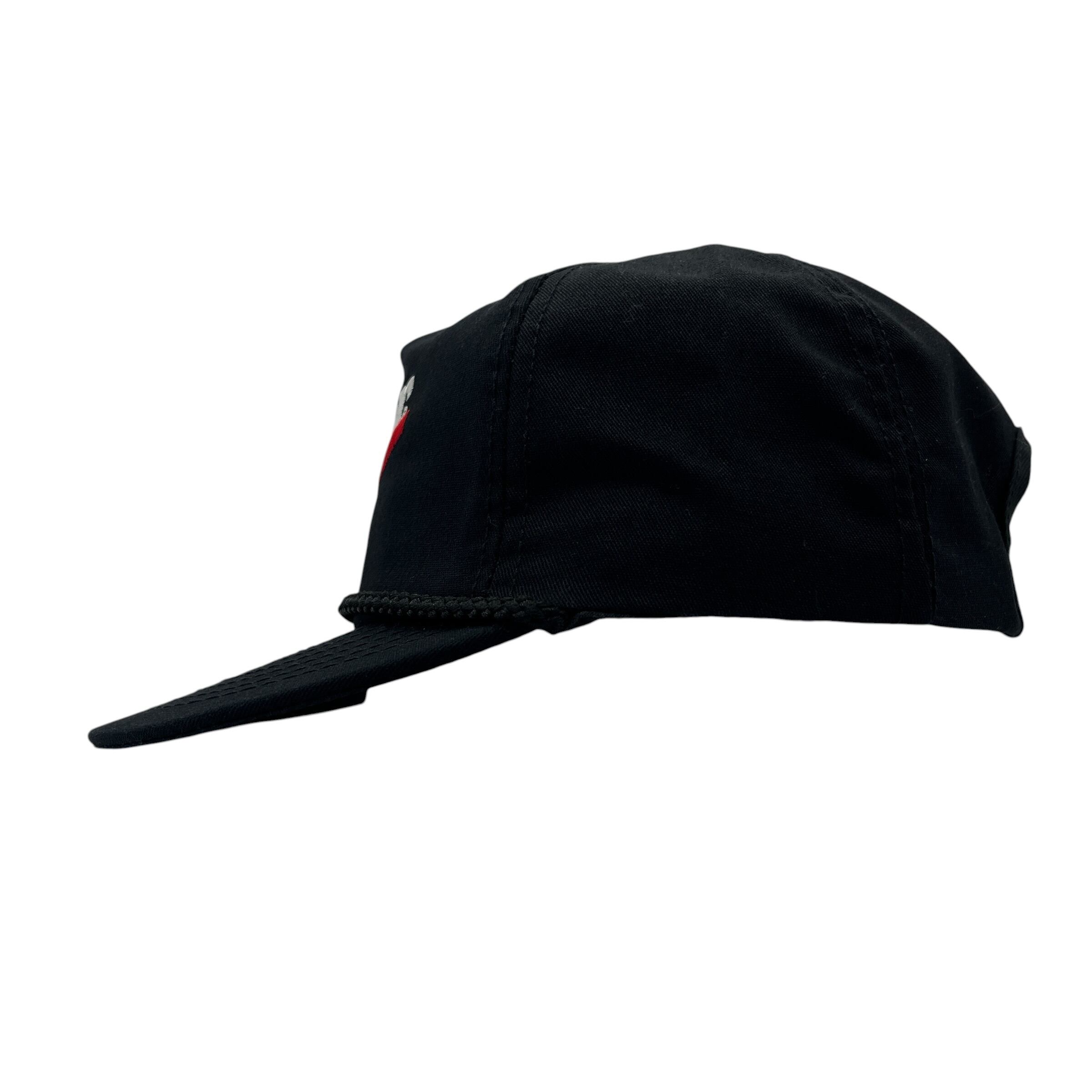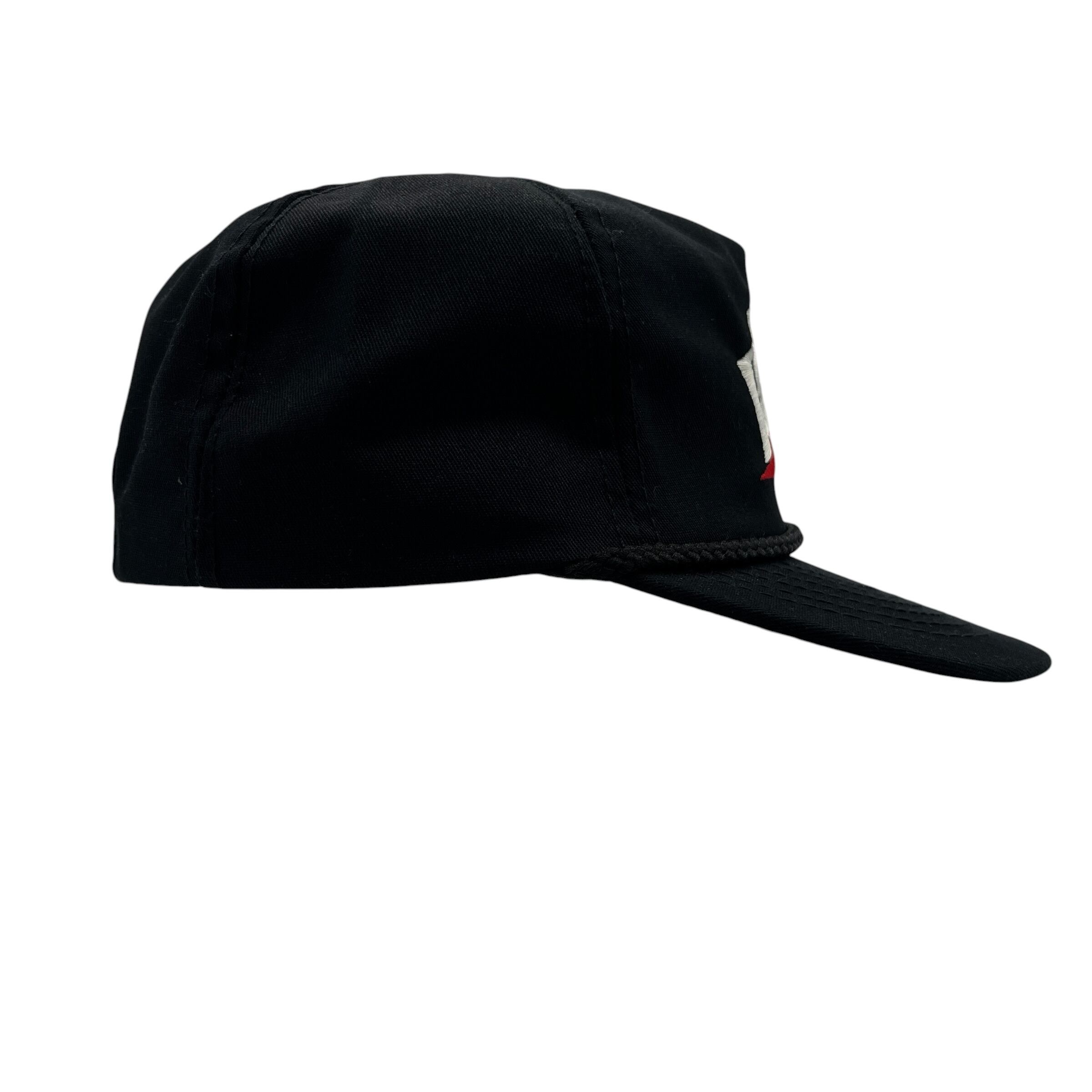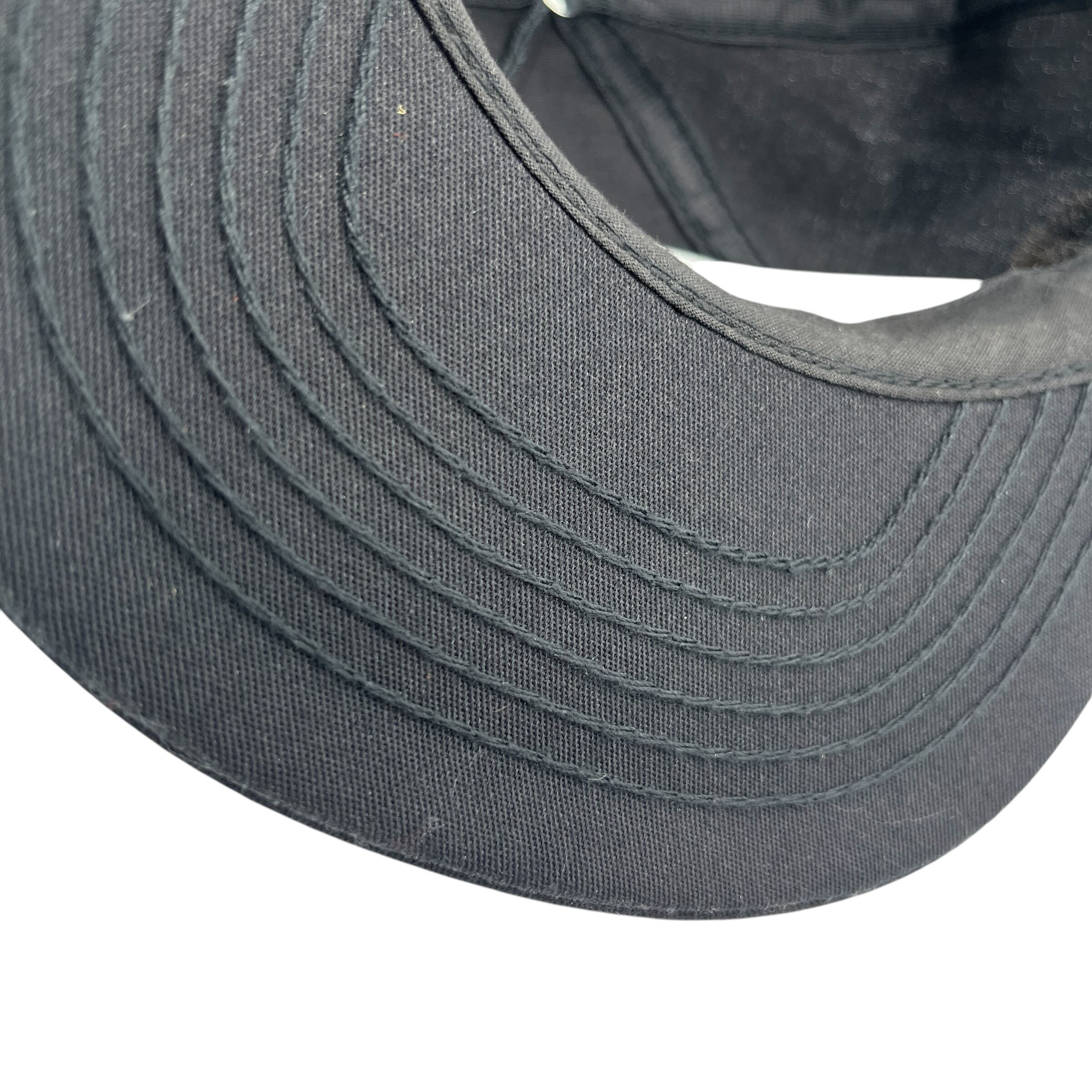 汎用性の高いブラックのボディに、当時のブランドロゴが精巧なホワイトとレッドの刺繍で施されています。バイザーの付け根に配された装飾用の編み込みロープが、ビンテージらしいクラシックなディテールを際立たせています。