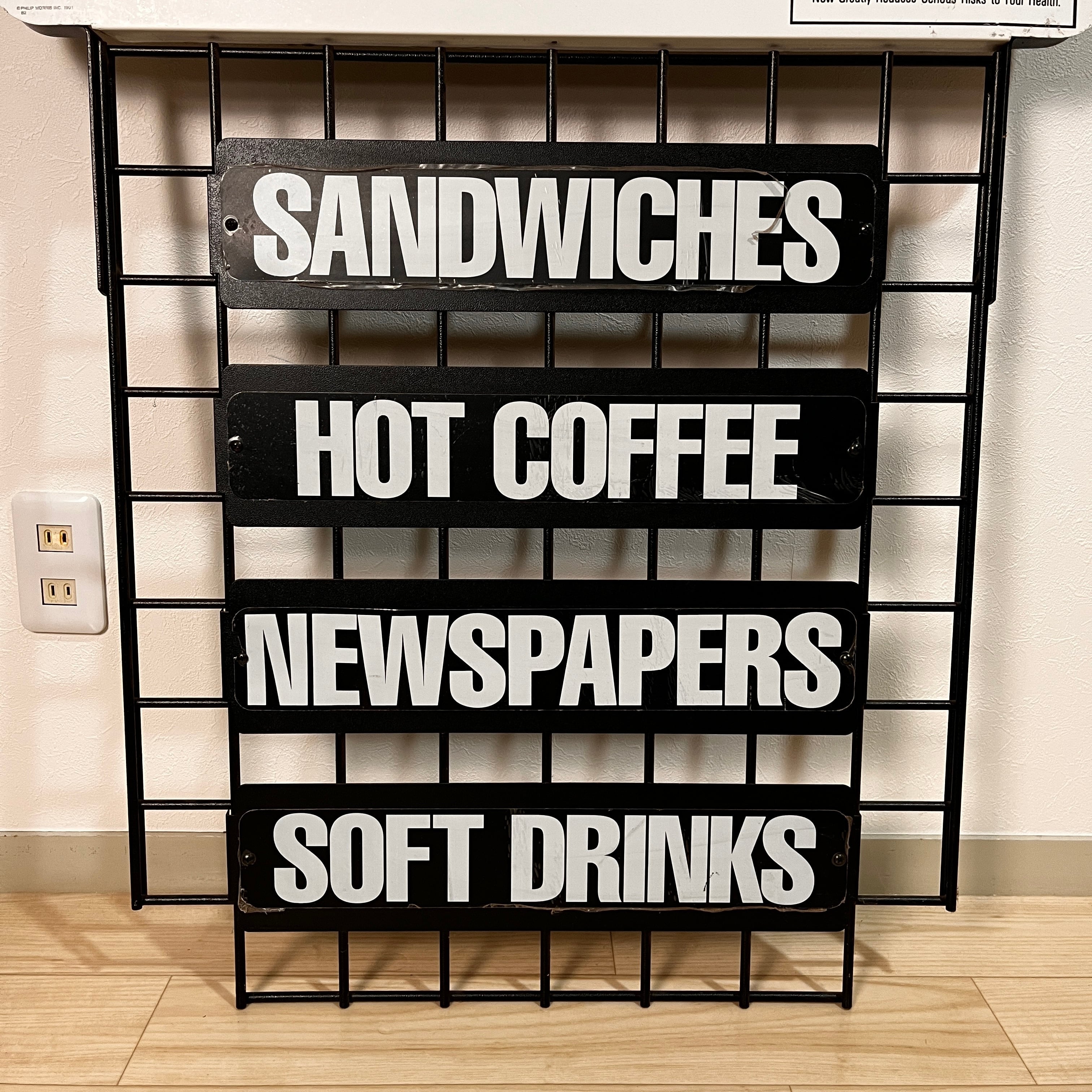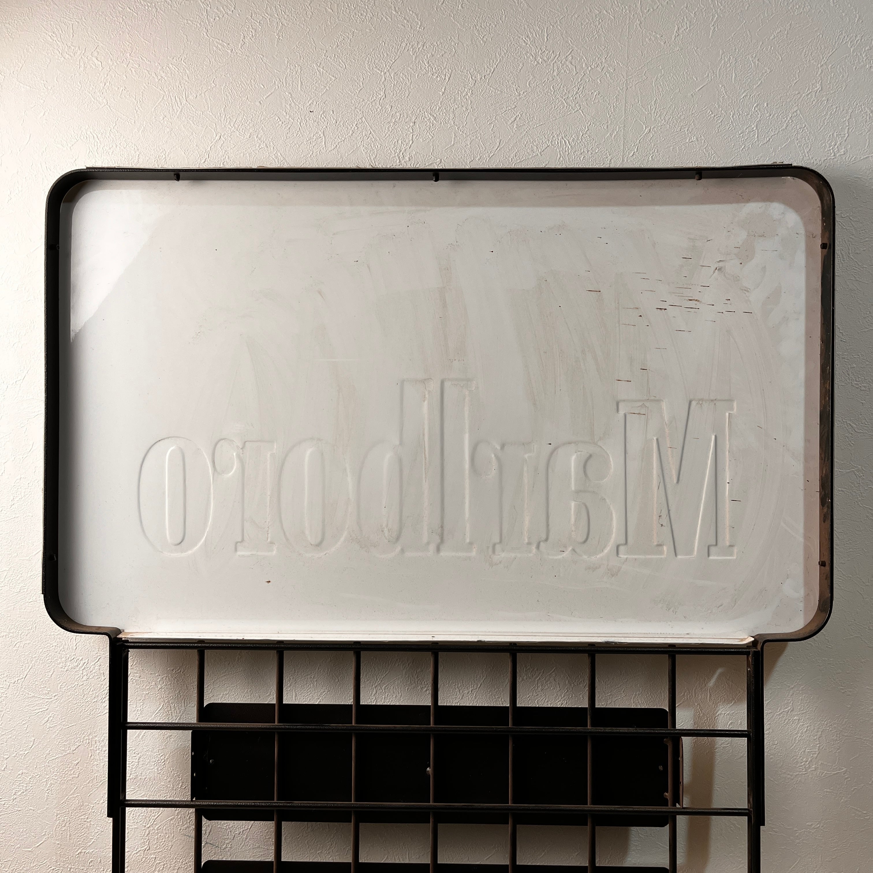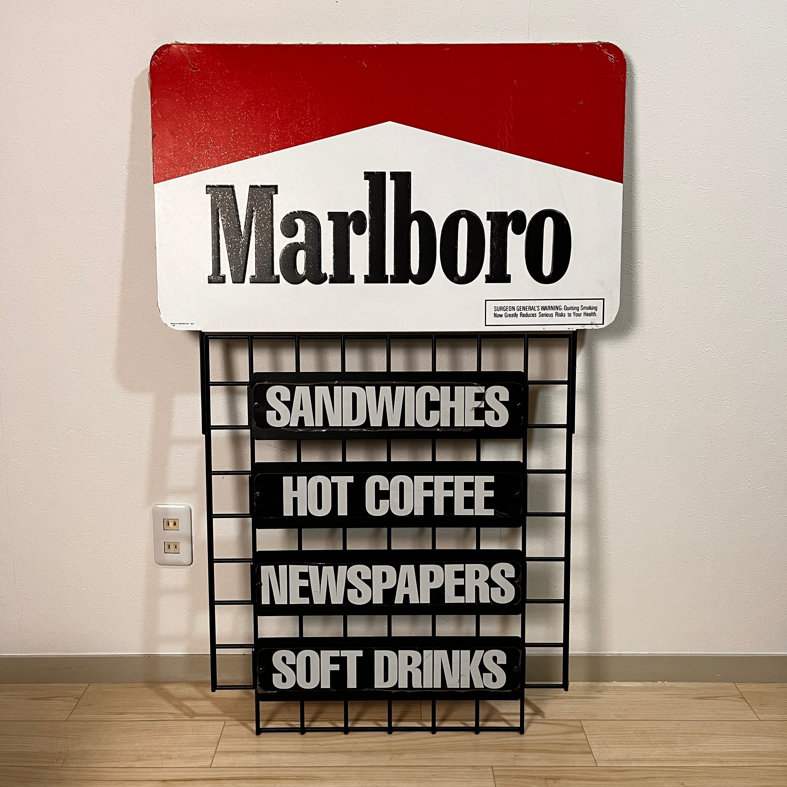 こちらはアメリカで買い付けました、1991年製のマルボロのアドバタイジングサインになります。Sandwiches, Hot Coffee, News, Paper Soft Drinkの文字がたまりませんね!これから推測するに朝食メニューがありマルボロの取り扱いもあるレストランで用いられていたものと思われます。エンボス加工も施されており、重厚感もあり、ハイクオリティの商品です。この綺麗な状態で見つかることは今後なかなかないと思いますので、是非この機会にご購入ください。