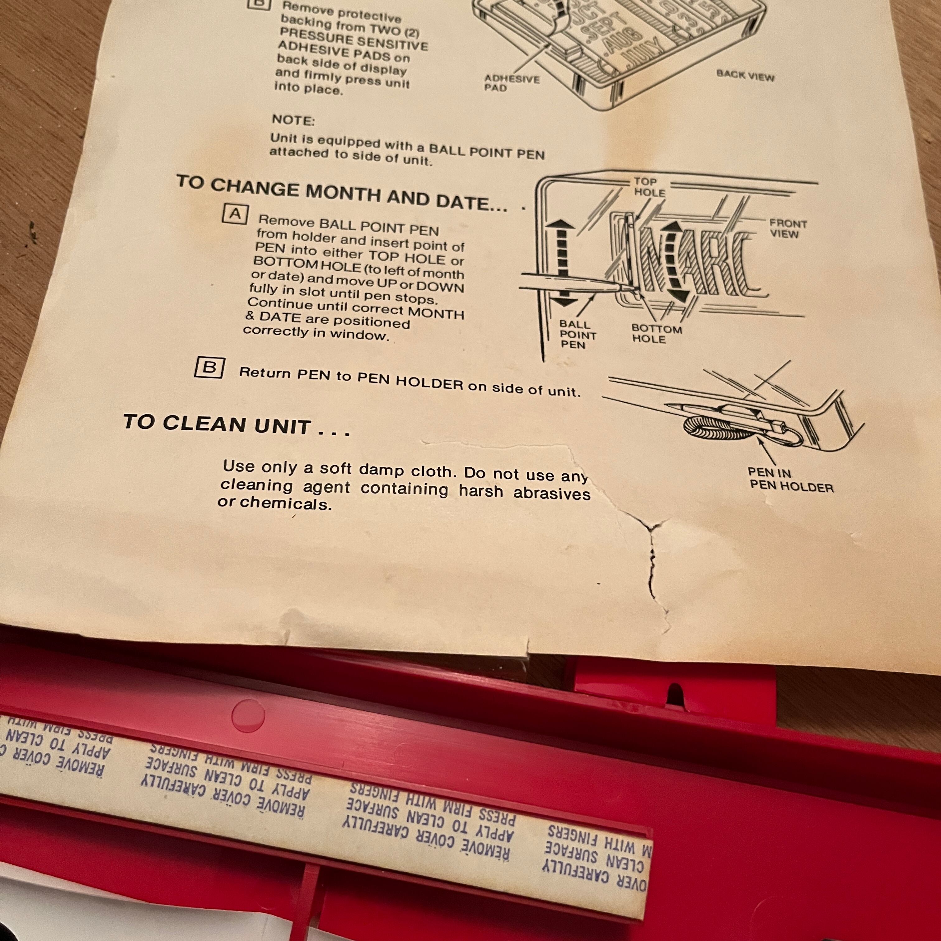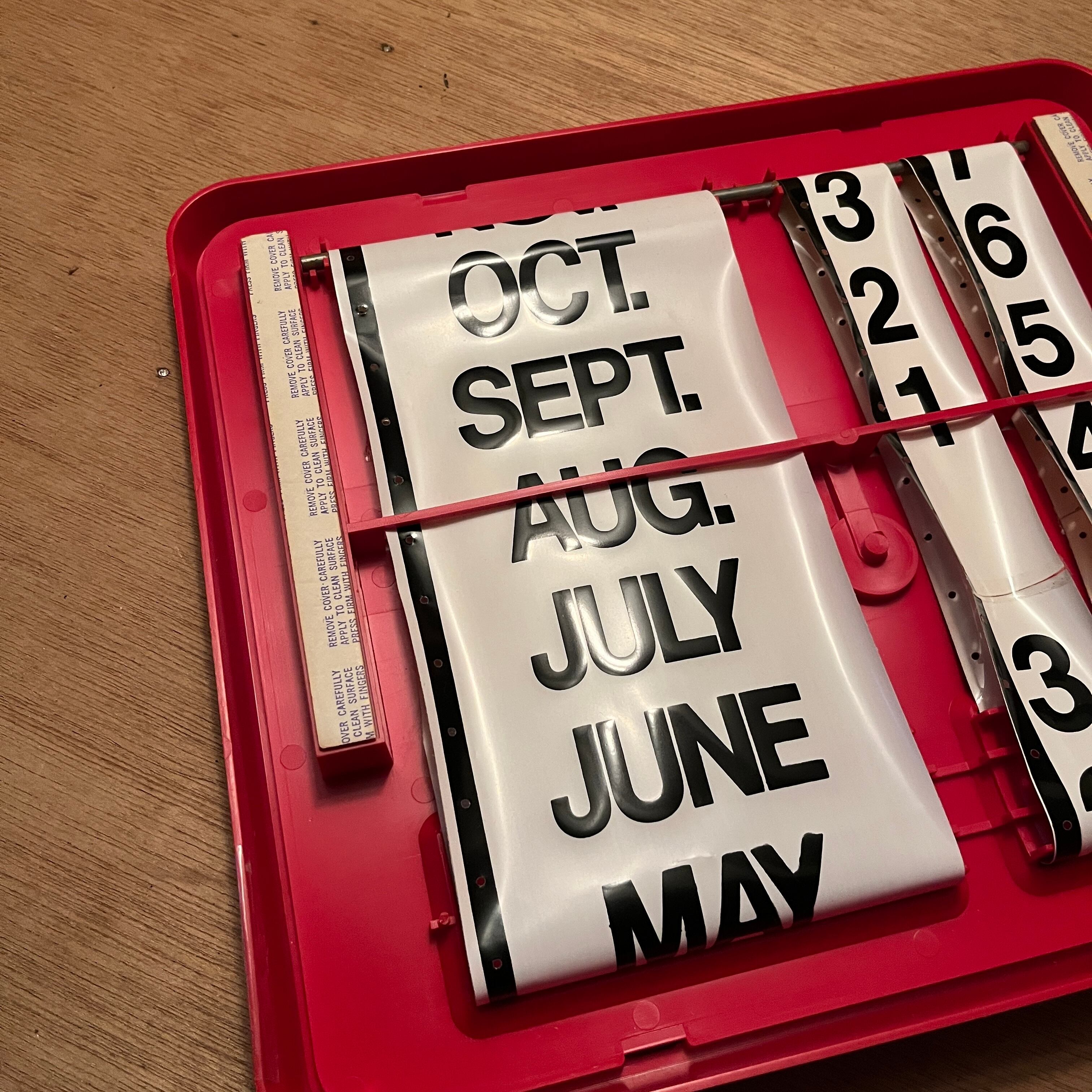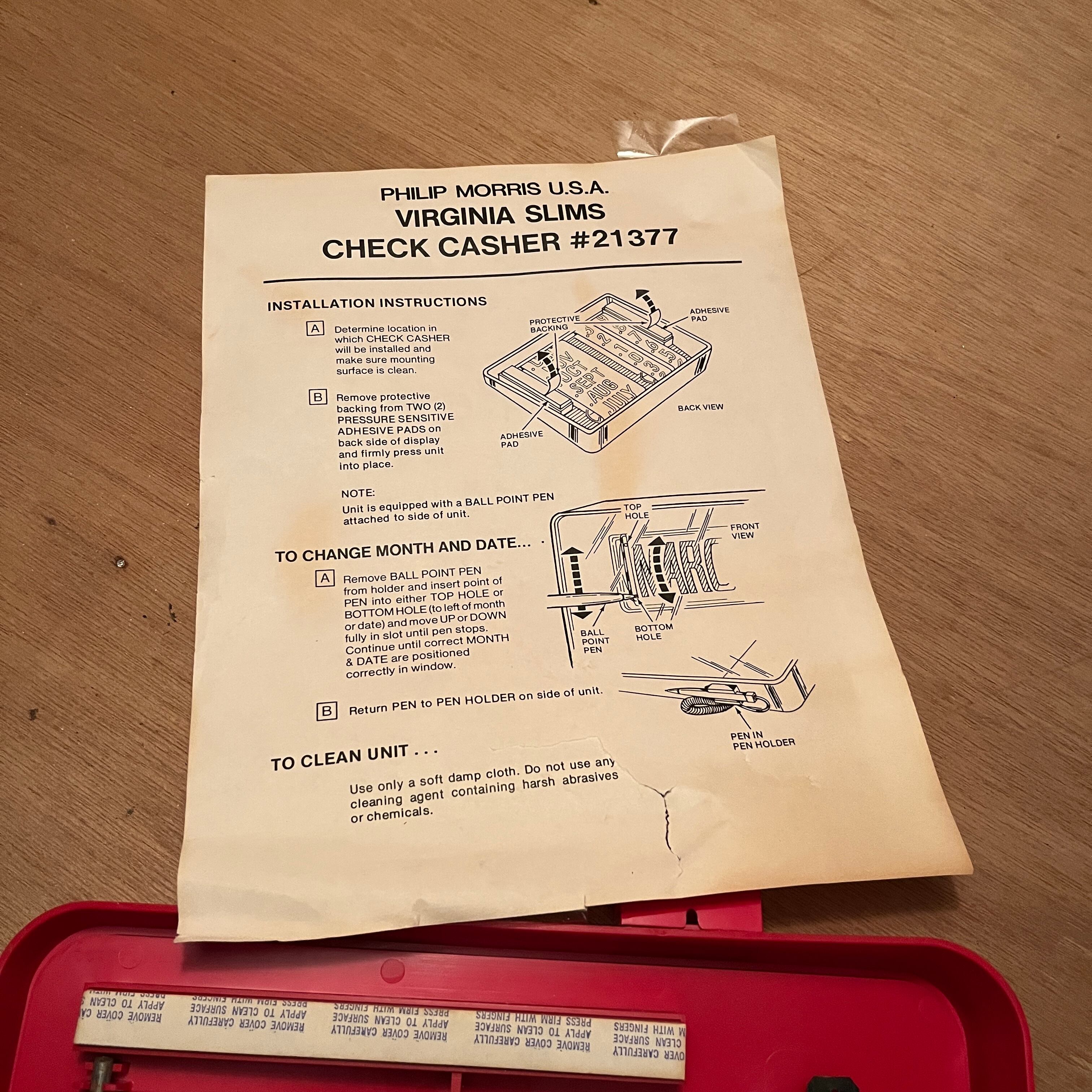 90sのビンテージカレンダーです。アメリカで販売されているヴァージニアスリムというブランドのタバコのアドバタイジングアイテムです。裏面の両端にあるテープ部分を壁に貼り付けることができます。APRIL 1 0のそれぞれの文字の左にある黒の部分に小さな穴がありますので、ペンを使い、そこから月日を変えることができます。専用のペンは紛失しておりますので、お持ちのボールペンなど、サイズが合うものをご使用ください。